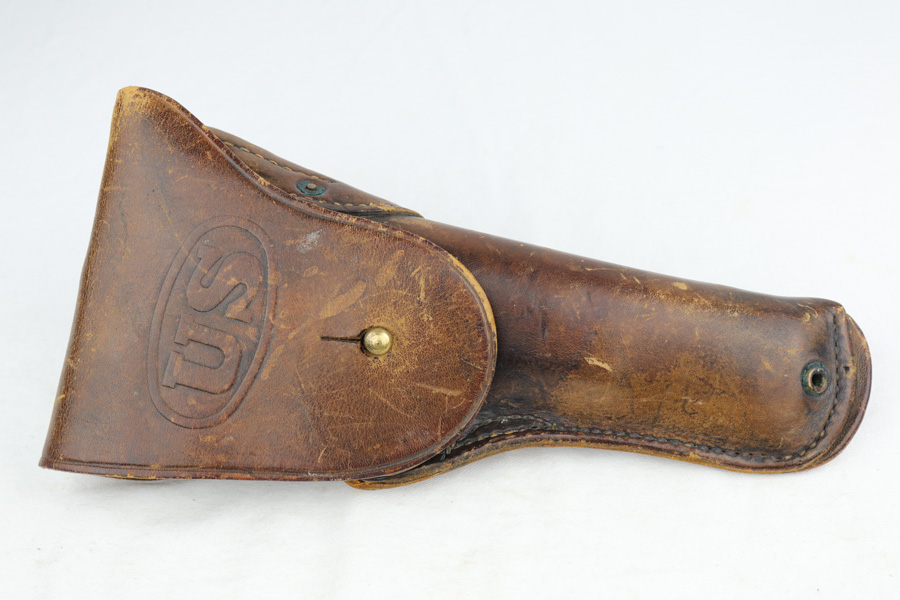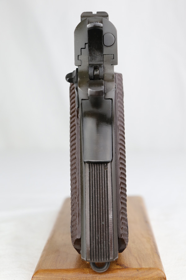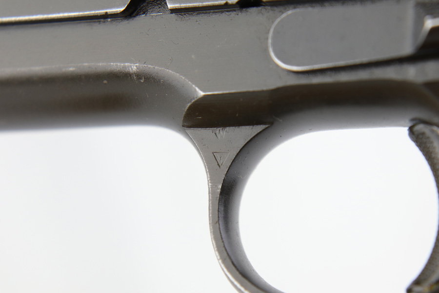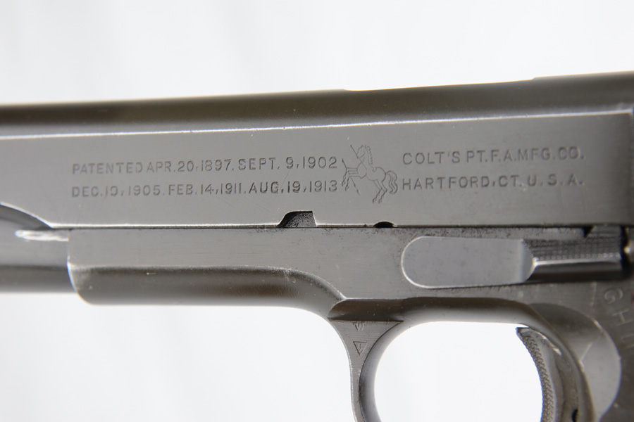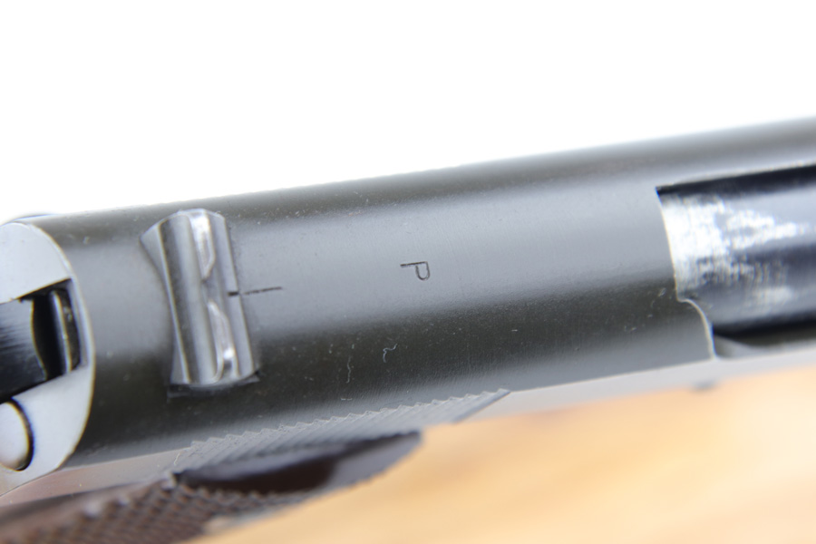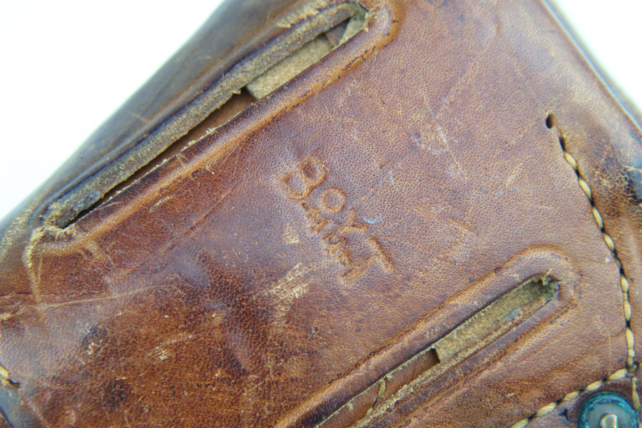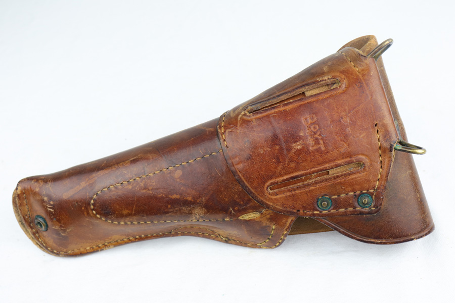 1/7/19 – This is a M1911A1 Colt from World War II. The original parkerized finish is about 95%, with normal holster wear. It was manufactured in 1944 and has all original parts. It is G.H.D. (Guy H. Drewry) inspector marked. Correct Colt .45 marked barrel. The bore has strong rifling, but is lightly frosted in the grooves. Correct grips and magazine. Comes with WWII original Boyt holster.