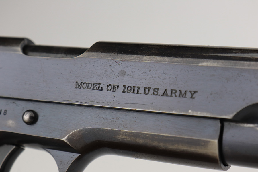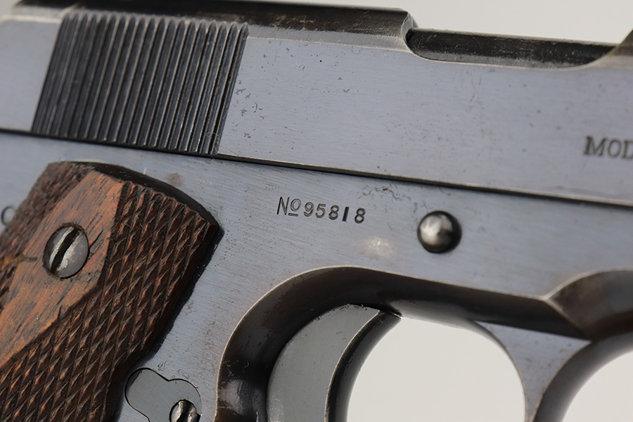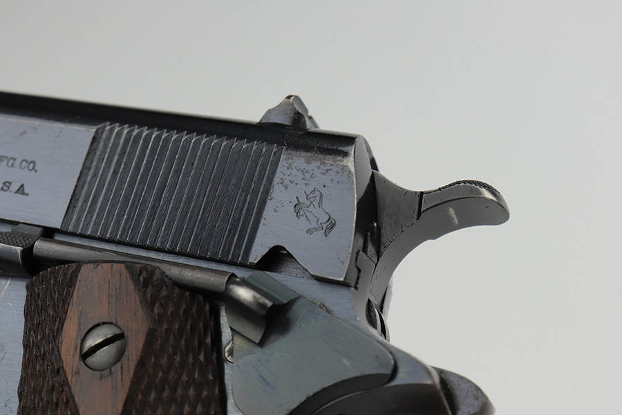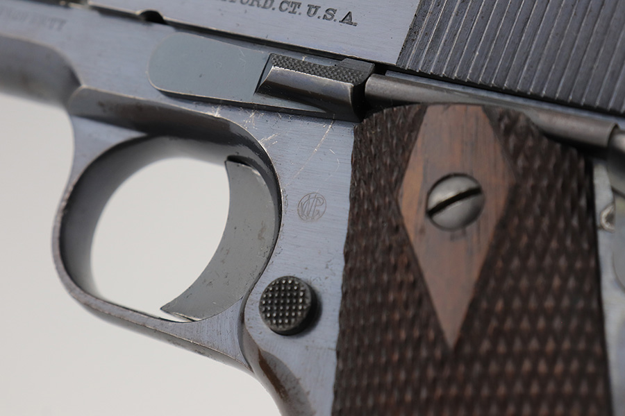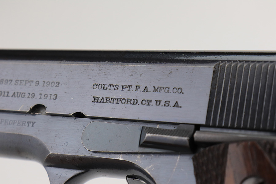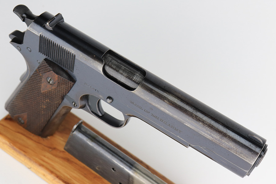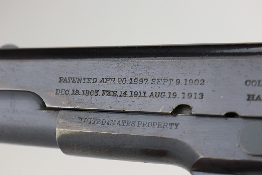 2/3/23 – This is a nice, honest example of an original Colt M1911 that was issued to the U.S. Army in 1914. It has a very nice profile but most of the wear is on the grip straps. with some more along the top of the slide. There’s also spotty oxidation on the slide but no pitting. Original barrel with disconnect ‘P H’ marking. It’s generally clean with strong rifling and just a little frost in the grooves. Nice grips, other than a scratch that extends from the right panel onto the rear frame, likely from someone that slipped when using a screwdriver to remove the screws. Proper two-tone mag.