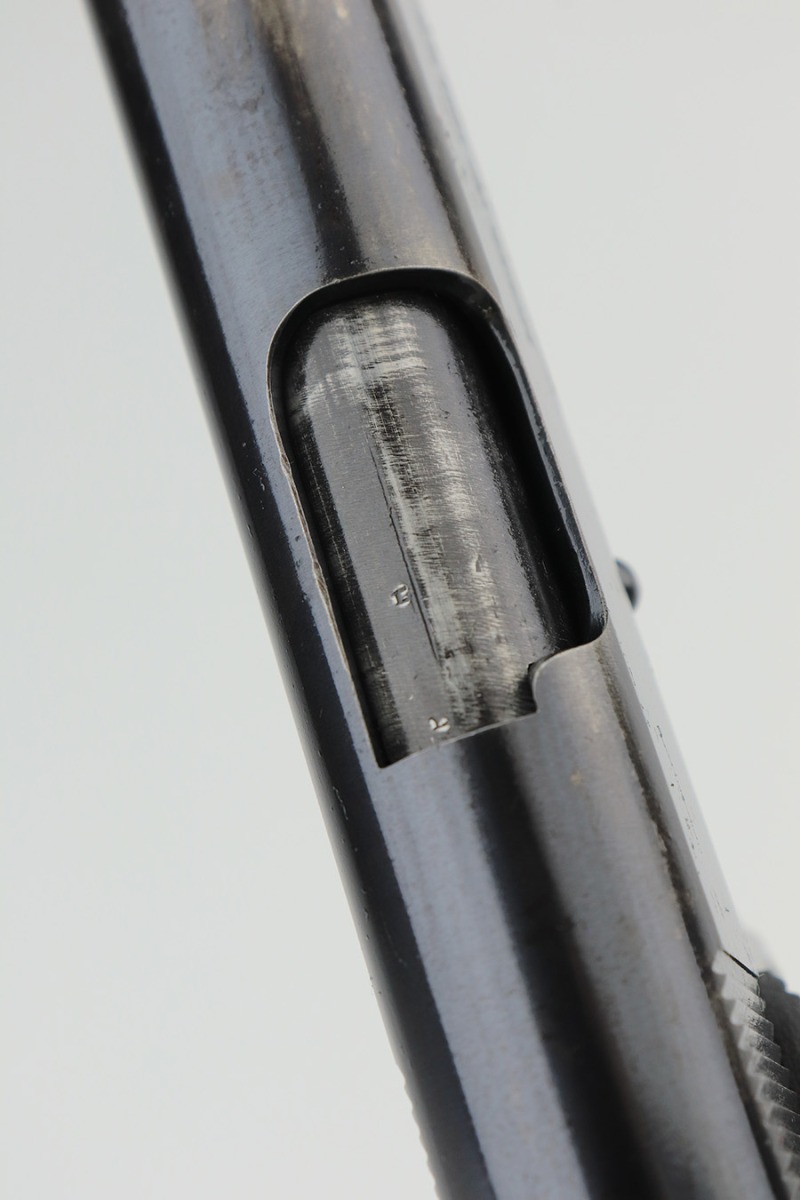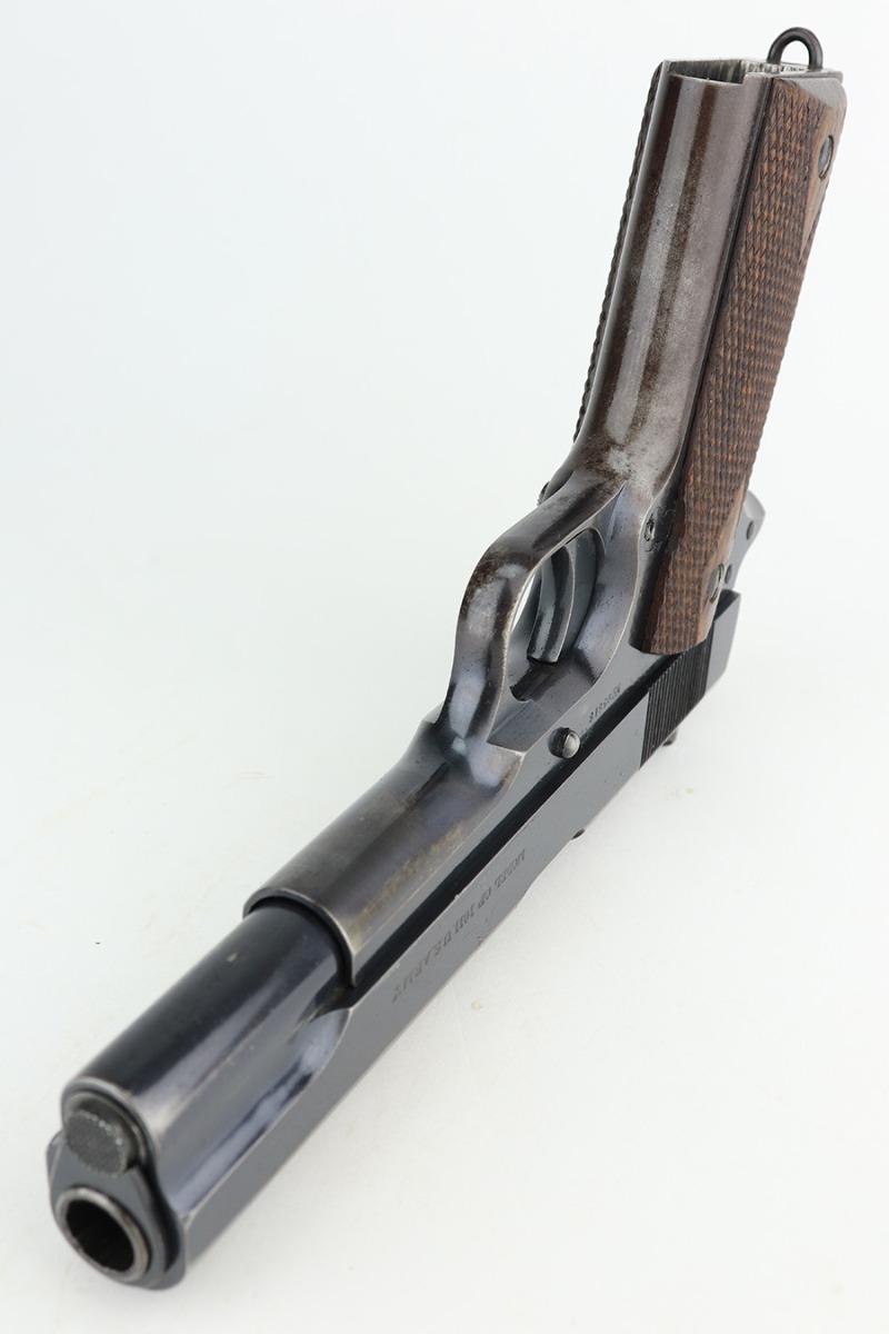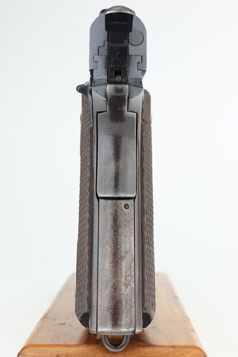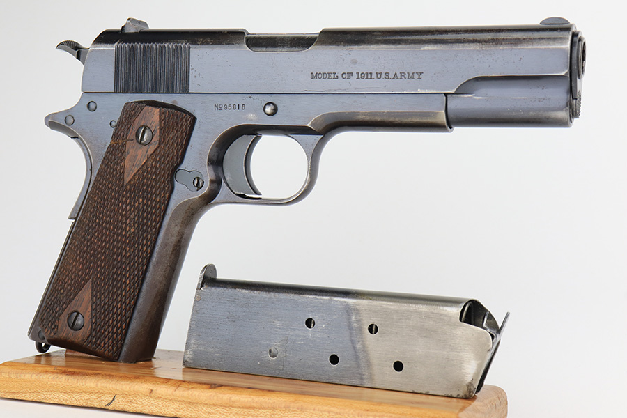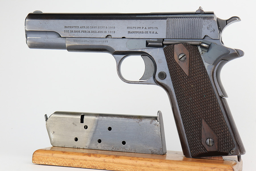 2/3/23 – This is a nice, honest example of an original Colt M1911 that was issued to the U.S. Army in 1914. It has a very nice profile but most of the wear is on the grip straps. with some more along the top of the slide. There’s also spotty oxidation on the slide but no pitting. Original barrel with disconnect ‘P H’ marking. It’s generally clean with strong rifling and just a little frost in the grooves. Nice grips, other than a scratch that extends from the right panel onto the rear frame, likely from someone that slipped when using a screwdriver to remove the screws. Proper two-tone mag.