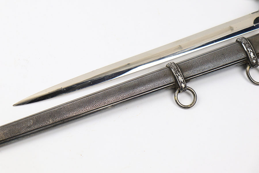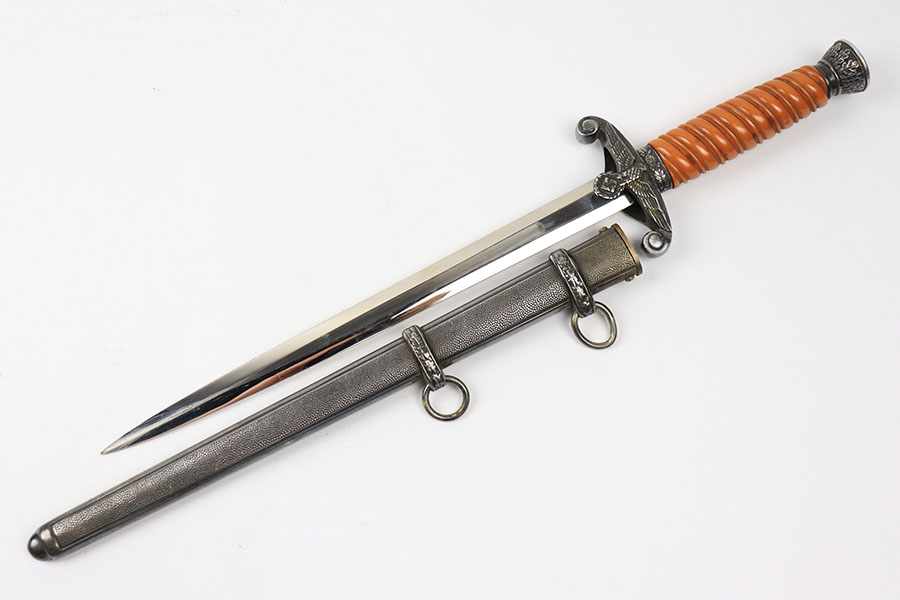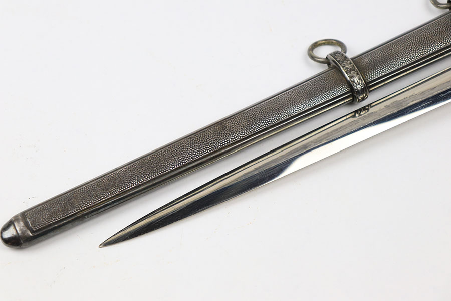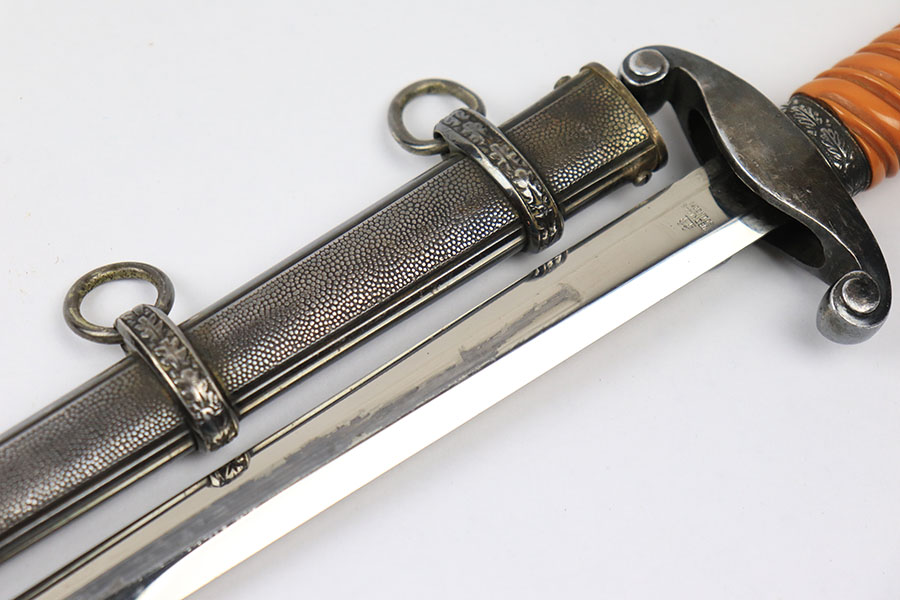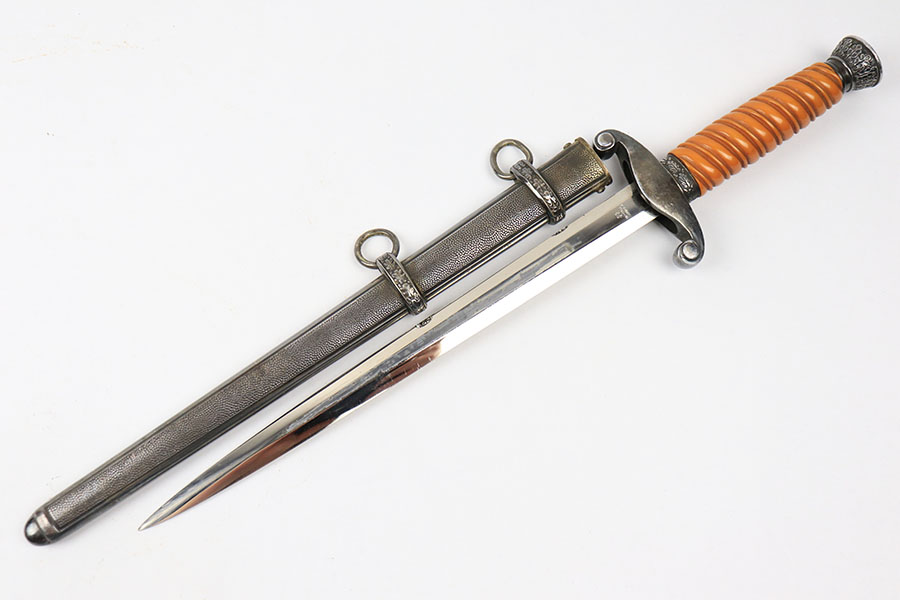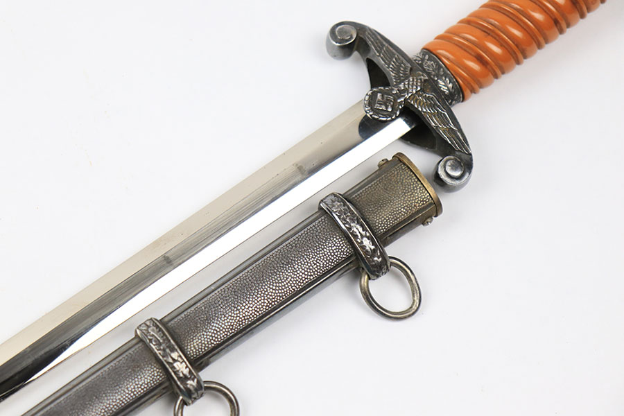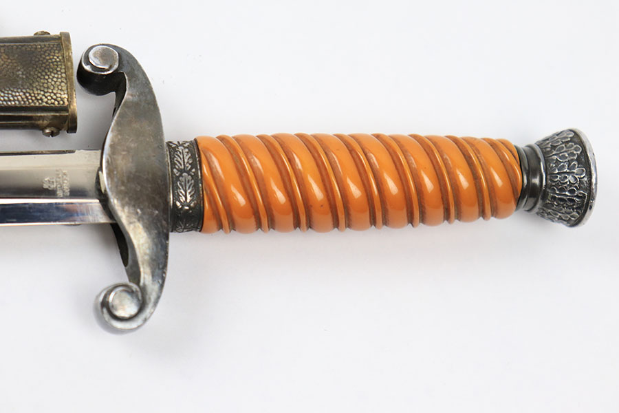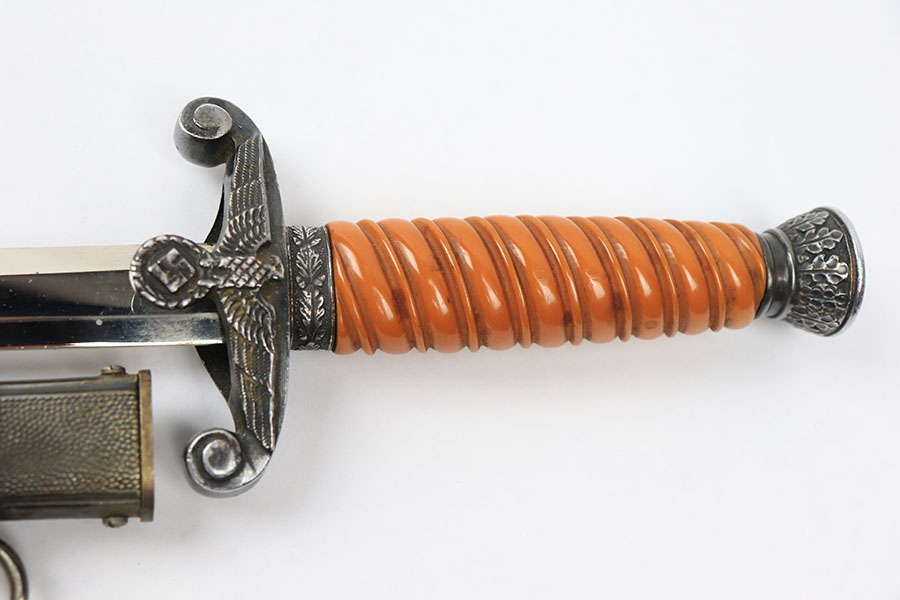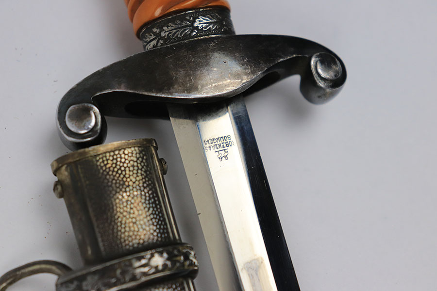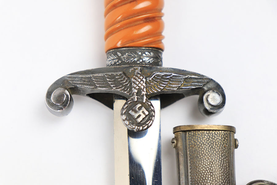 8/20/21 – This is an original WW2 Nazi Army dagger by Robert Klaas. The dagger has a clean blade, though the reverse shows some mild plating loss on the shiny, nickel finish. Maker stamped at the base. The eagle hand guard has patina throughout and there is minor play or “wiggle” on the burnt orange bakelite handle. No cracks or chips however. No dents in the scabbard.