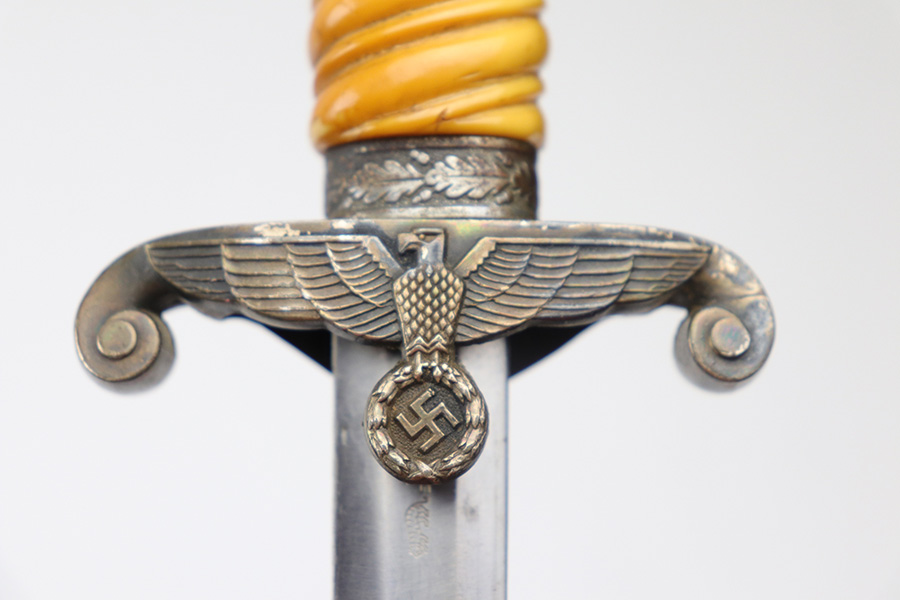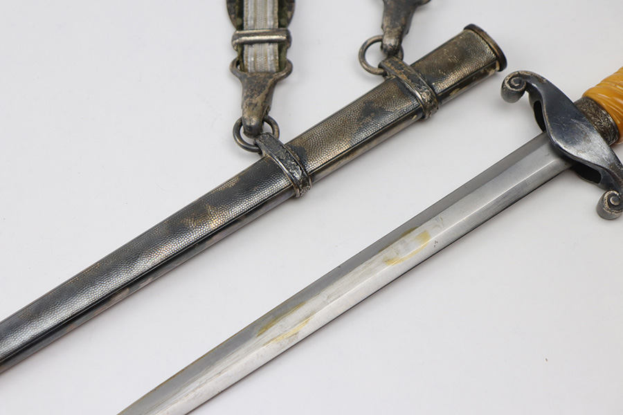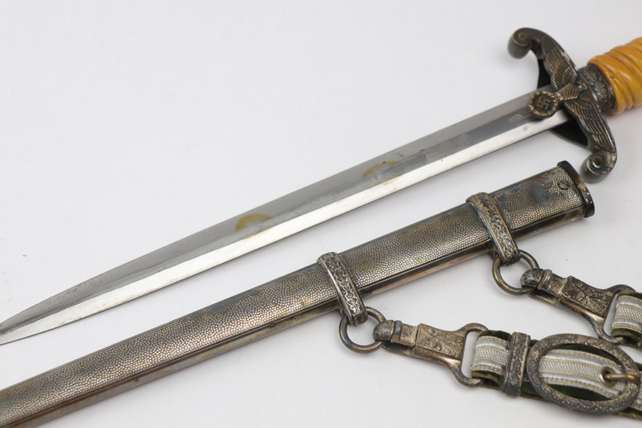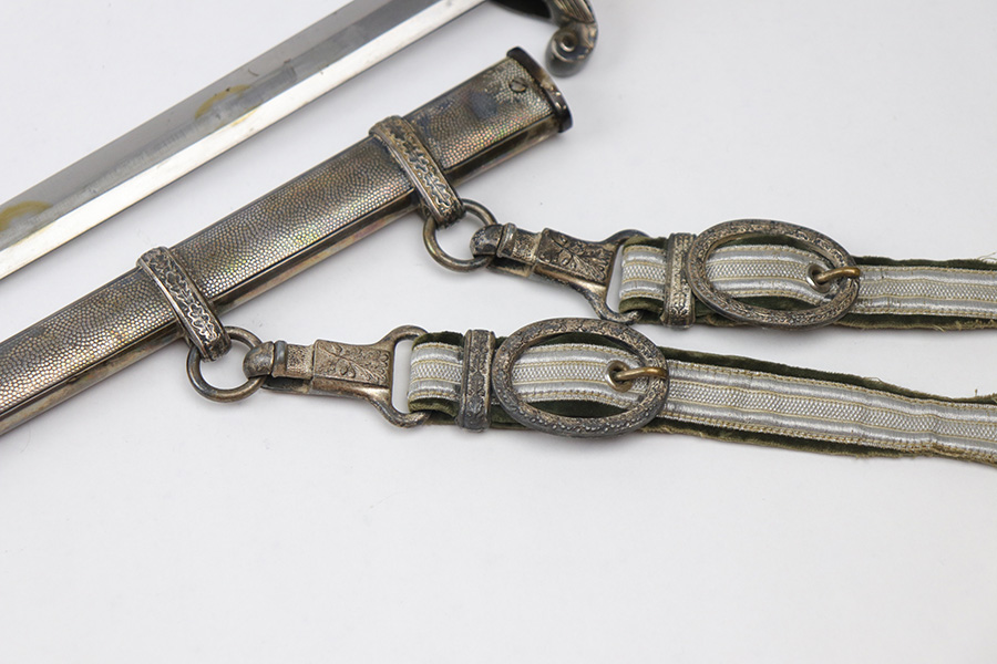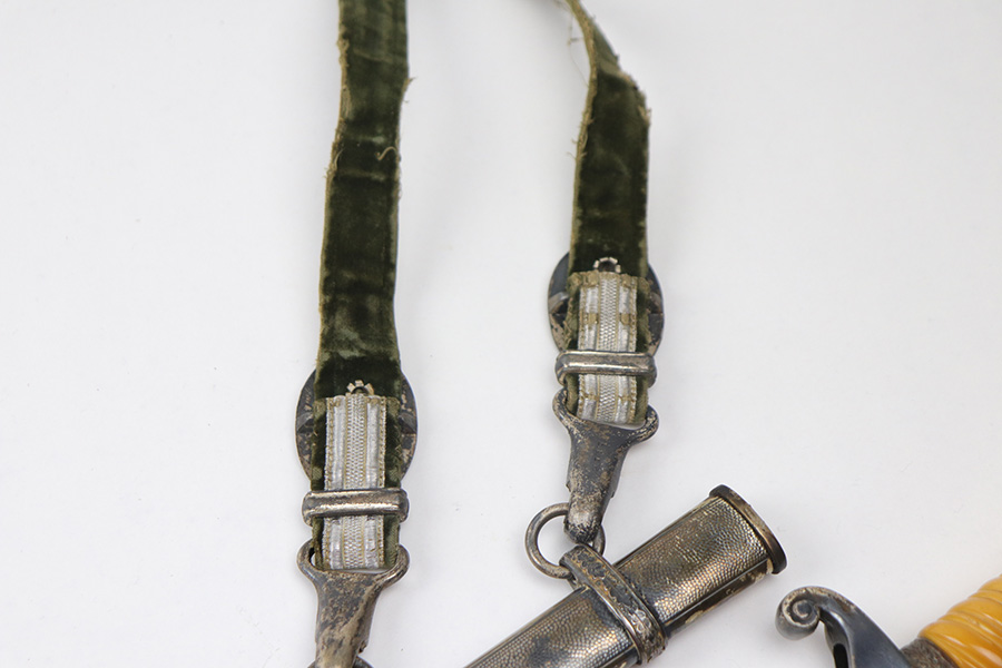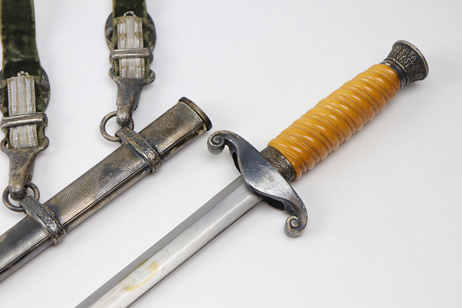 10/22/21 – This is an original WW2 Nazi army dagger. The dagger comes with an original scabbard and hanger, as shown. The blade is maker stamped by Tiger with the Tiger logo. Since photos were taken, the dagger has been taken apart and inspected, and was put back together with the maker now on the reverse. Great cross graining throughout the blade and some mild surface wear and a few spots of discoloration, but no major issues. The bakelite handle has some discoloration that looks like sun bleaching. No cracks or chips. Some patina on the hand guard and pommel, but no major issues. The scabbard is free of dents and the hanger is excellent.