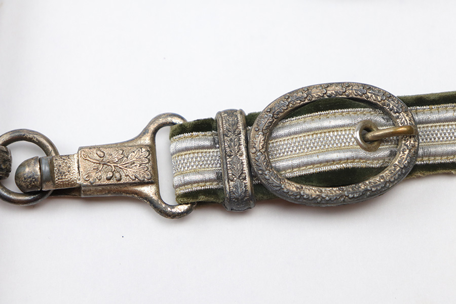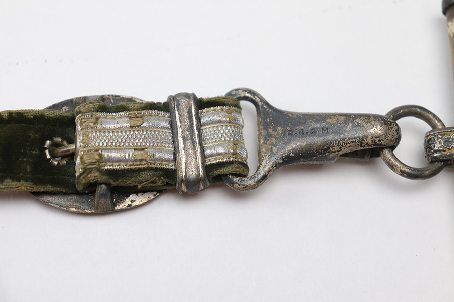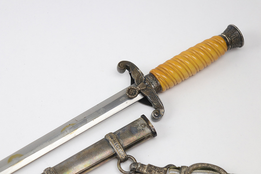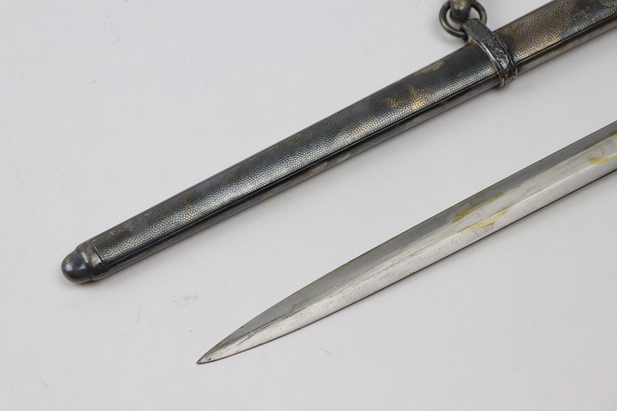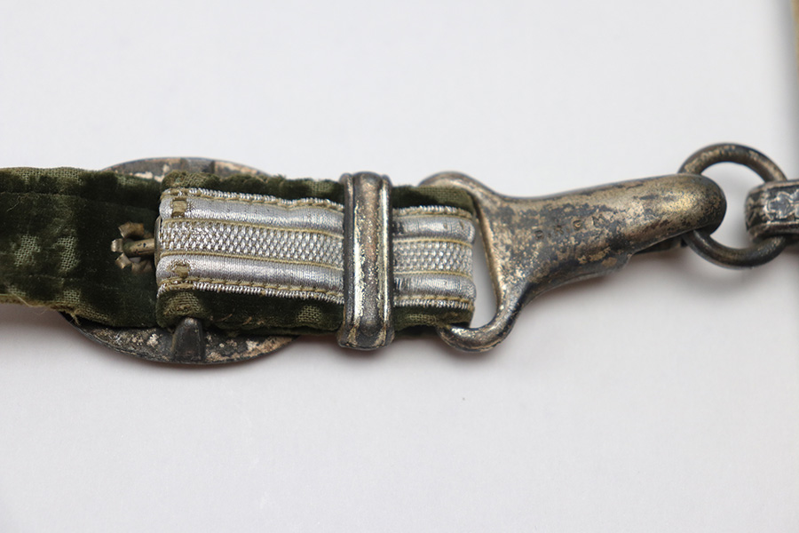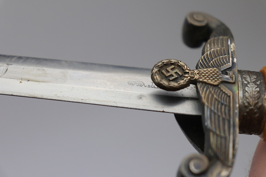 10/22/21 – This is an original WW2 Nazi army dagger. The dagger comes with an original scabbard and hanger, as shown. The blade is maker stamped by Tiger with the Tiger logo. Since photos were taken, the dagger has been taken apart and inspected, and was put back together with the maker now on the reverse. Great cross graining throughout the blade and some mild surface wear and a few spots of discoloration, but no major issues. The bakelite handle has some discoloration that looks like sun bleaching. No cracks or chips. Some patina on the hand guard and pommel, but no major issues. The scabbard is free of dents and the hanger is excellent.