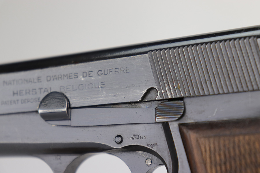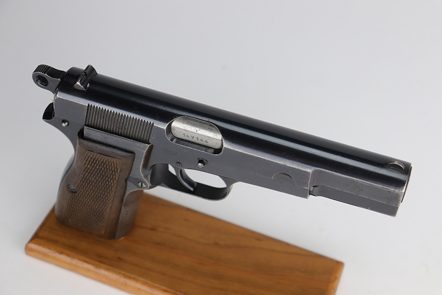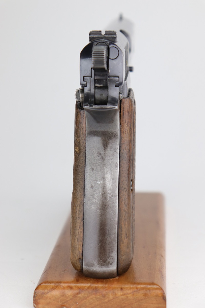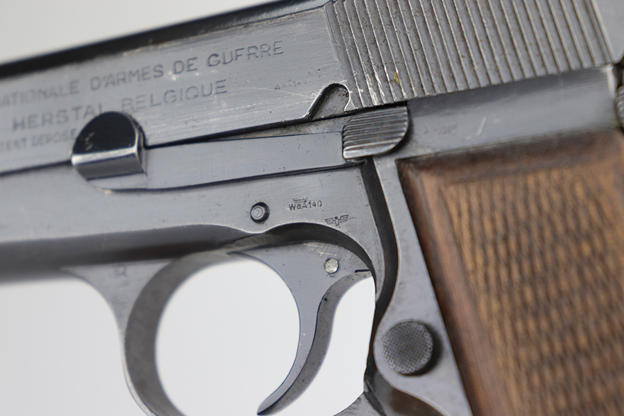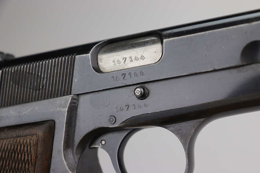 12/15/22 – This is a matching mid-war High Power that went to the German Army. The finish on the frame is original but shows obvious wear on the straps, but we believe parts of the slide were touched up. WaA140 proofs on slide, frame and barrel. The bore has strong rifling but some frost throughout. Nice wood grips, but the left panel does have a depression in it. Unmarked magazine.