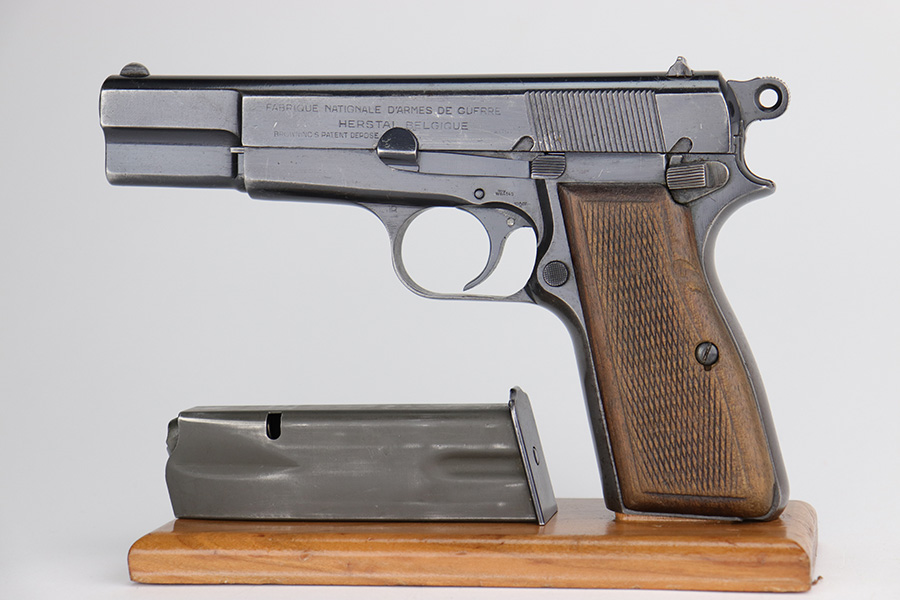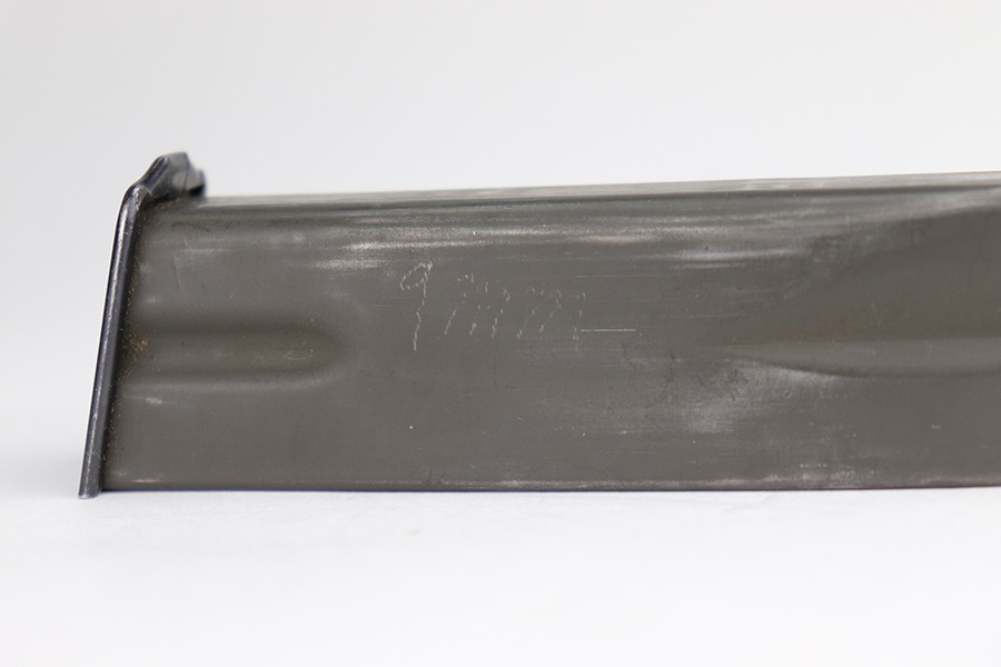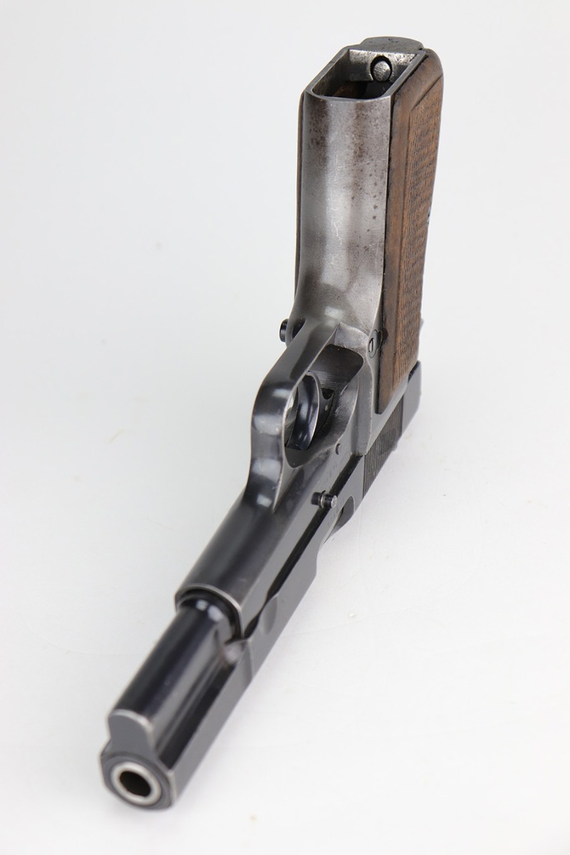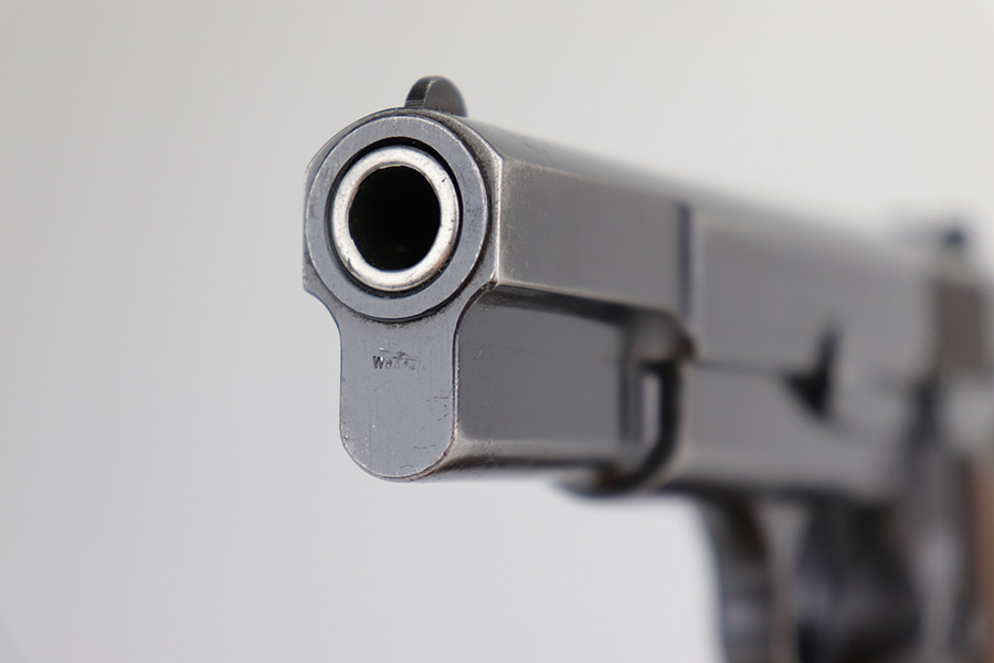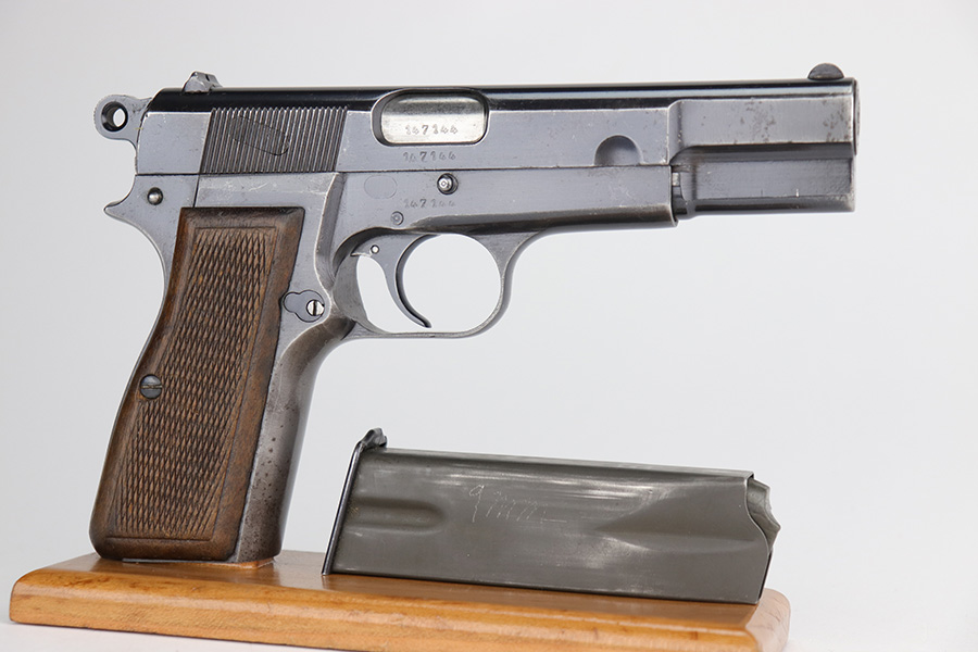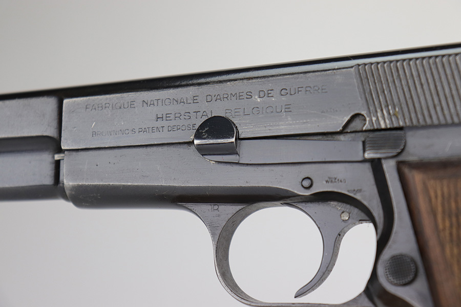 12/15/22 – This is a matching mid-war High Power that went to the German Army. The finish on the frame is original but shows obvious wear on the straps, but we believe parts of the slide were touched up. WaA140 proofs on slide, frame and barrel. The bore has strong rifling but some frost throughout. Nice wood grips, but the left panel does have a depression in it. Unmarked magazine.
