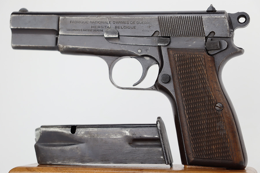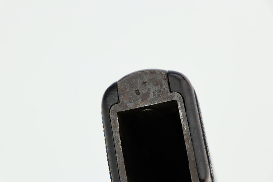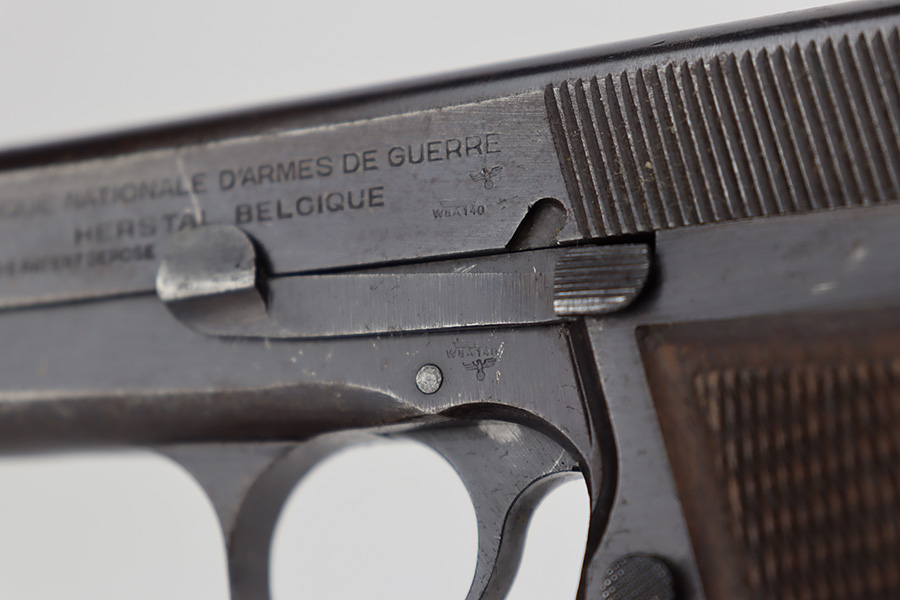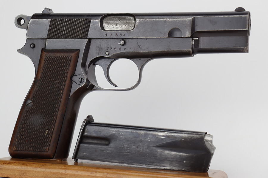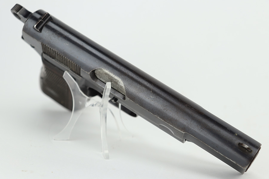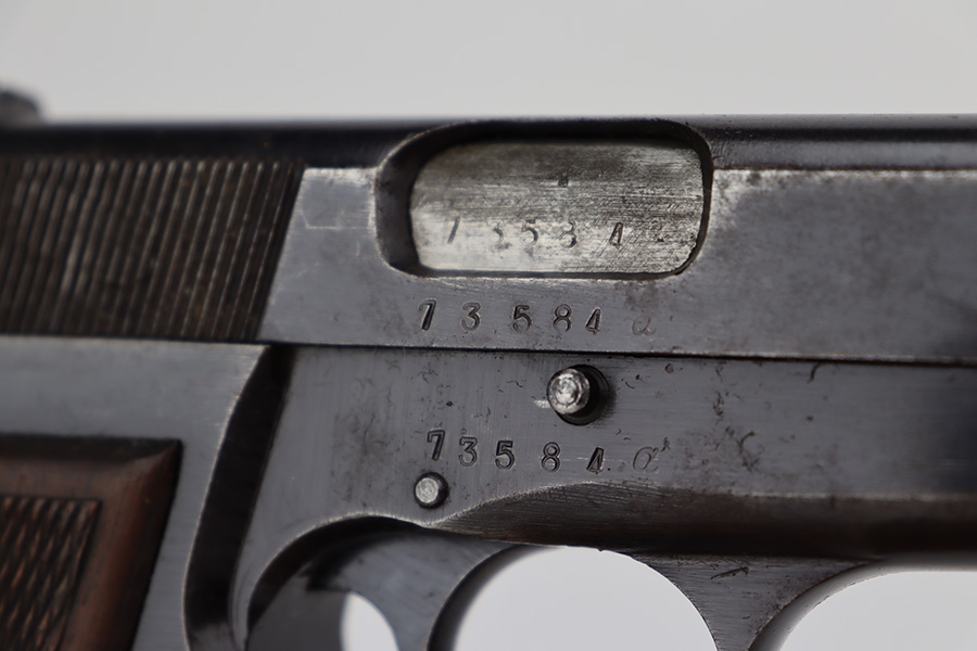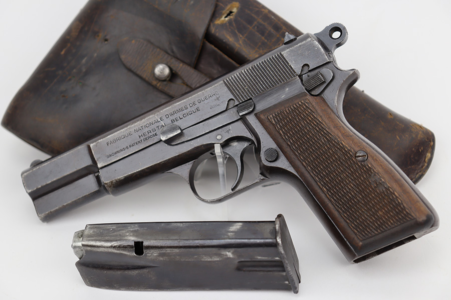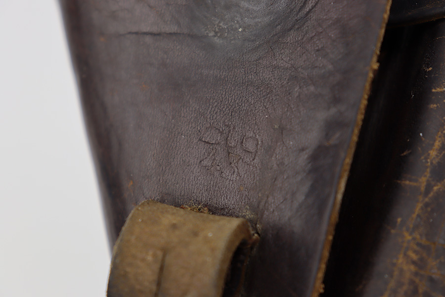 6/15/23 – This is an Army-issued FN Browning High Power from late in WW2. All matching and original with maybe 75% of the blue remaining. Decent profile view as most of the wear and patina is on the grip straps. Minor freckling on some of the slide edges. Bore has strong rifling but a little frost throughout. The grips have nice checkering with no cracks or chips, only a notable depression in the right panel. Comes with an original holster, which is ’43 dated and ‘clg’ maker marked. The holster has many issues though, as the belt loop is coming off the back, there’s a small hole in the mag pouch and top flap where an embellishment was removed, and someone scratched a checkered pattern into the mag pouch.