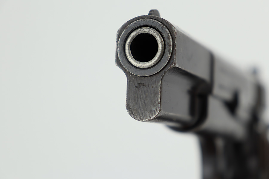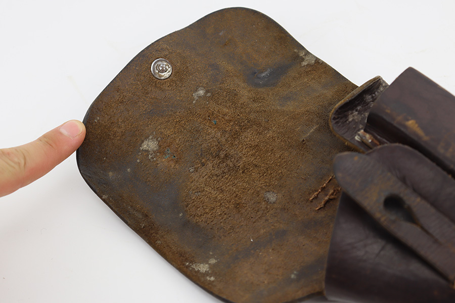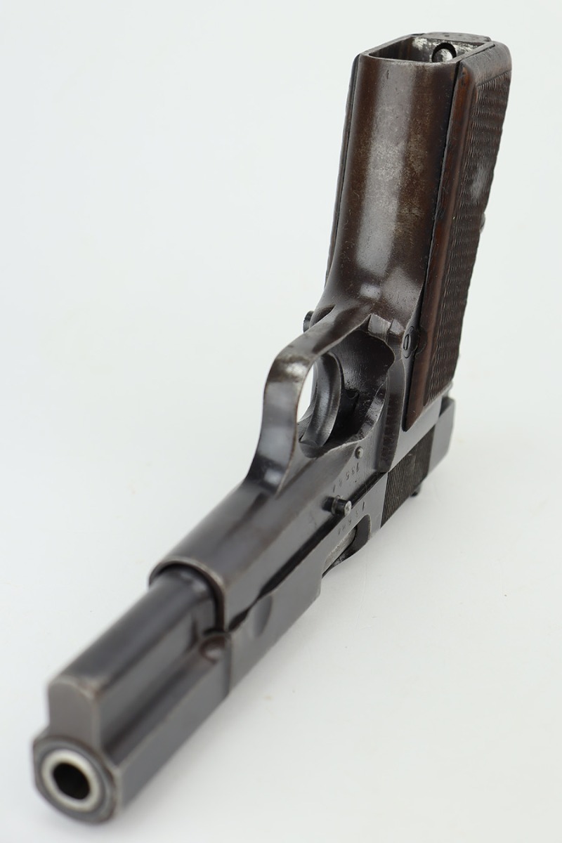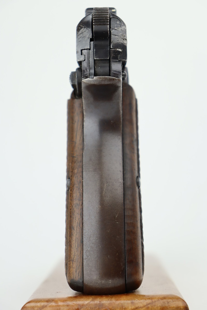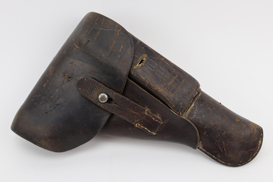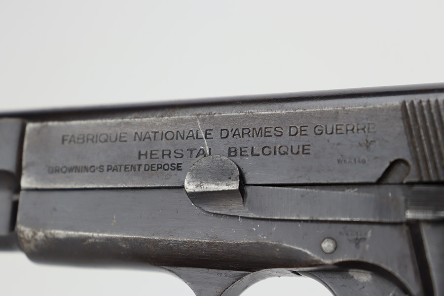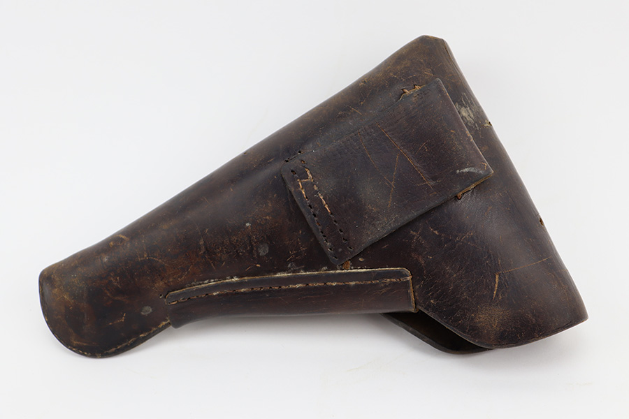 6/15/23 – This is an Army-issued FN Browning High Power from late in WW2. All matching and original with maybe 75% of the blue remaining. Decent profile view as most of the wear and patina is on the grip straps. Minor freckling on some of the slide edges. Bore has strong rifling but a little frost throughout. The grips have nice checkering with no cracks or chips, only a notable depression in the right panel. Comes with an original holster, which is ’43 dated and ‘clg’ maker marked. The holster has many issues though, as the belt loop is coming off the back, there’s a small hole in the mag pouch and top flap where an embellishment was removed, and someone scratched a checkered pattern into the mag pouch.