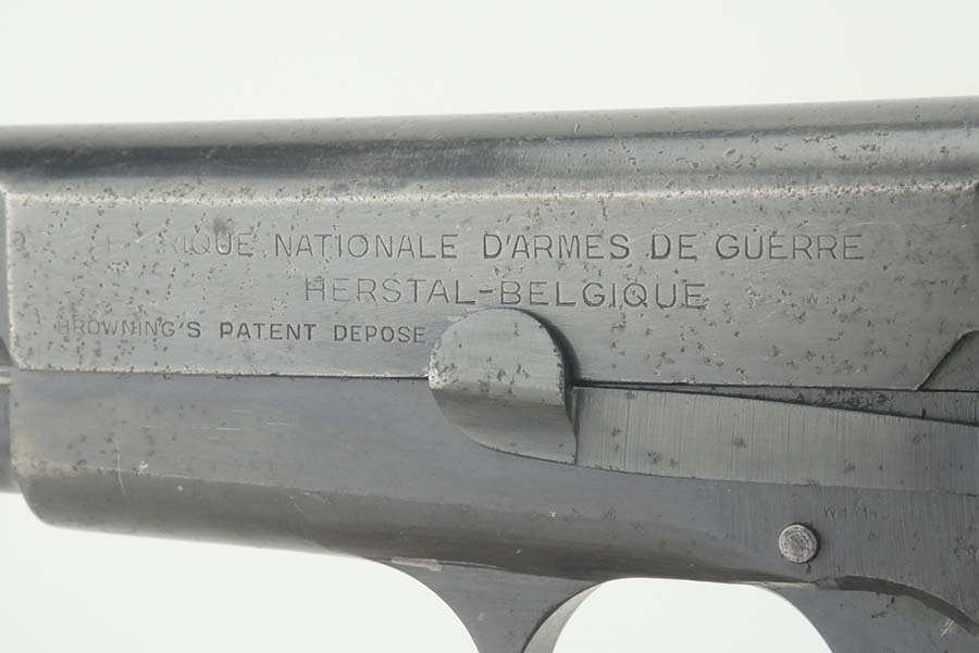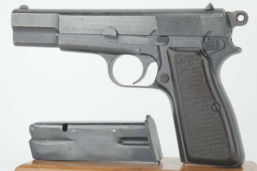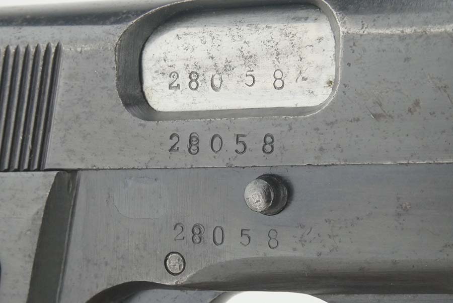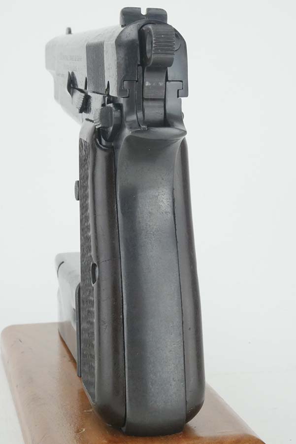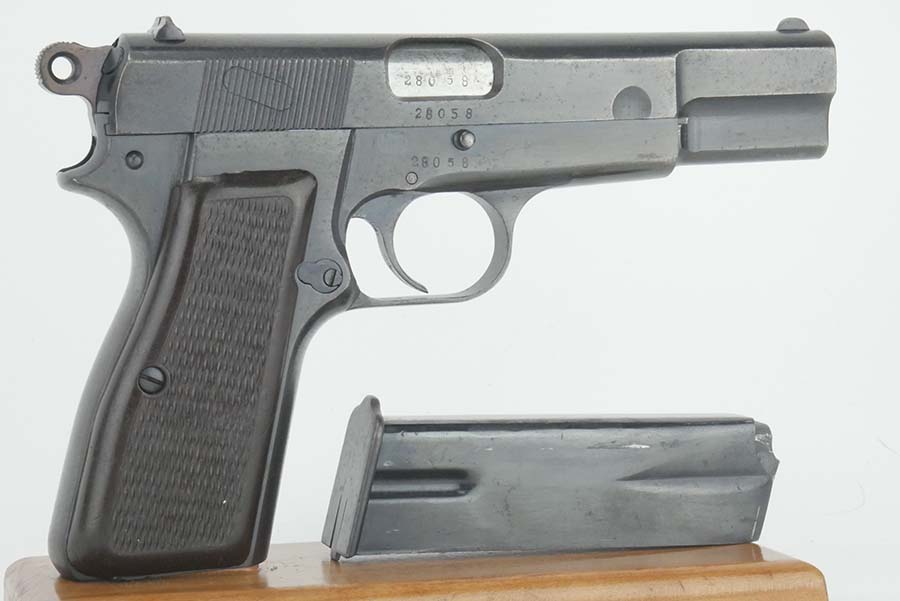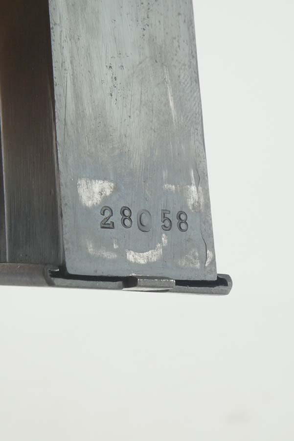 6/19/24 – This is a nice FN Browning High Power issued to the Nazi military during WW2. All matching with the proper “Waffen 140” military acceptance proofs (the proofs are a bit faint). It has retained about 96% of its original finish with general high edge wear. While there isn’t much actual finish loss, there is pin-pricking covering most of the metal. Fitted with period-correct brown bakelite grips and comes with a post-war matching-numbered magazine. The bore has decent rifling, but there is tiny pitting throughout.