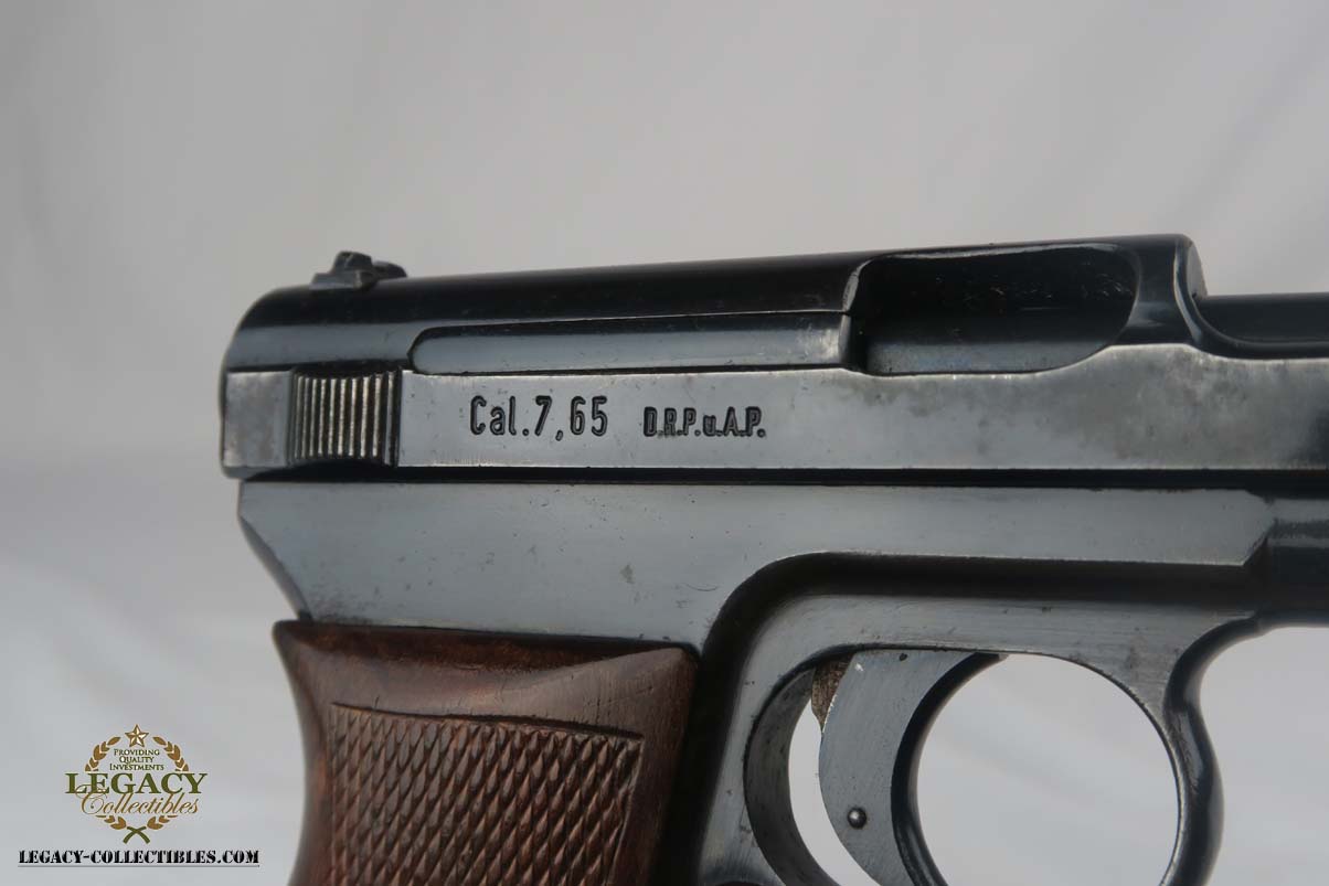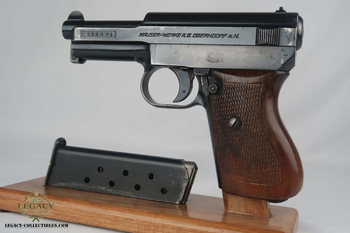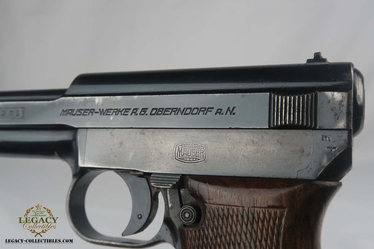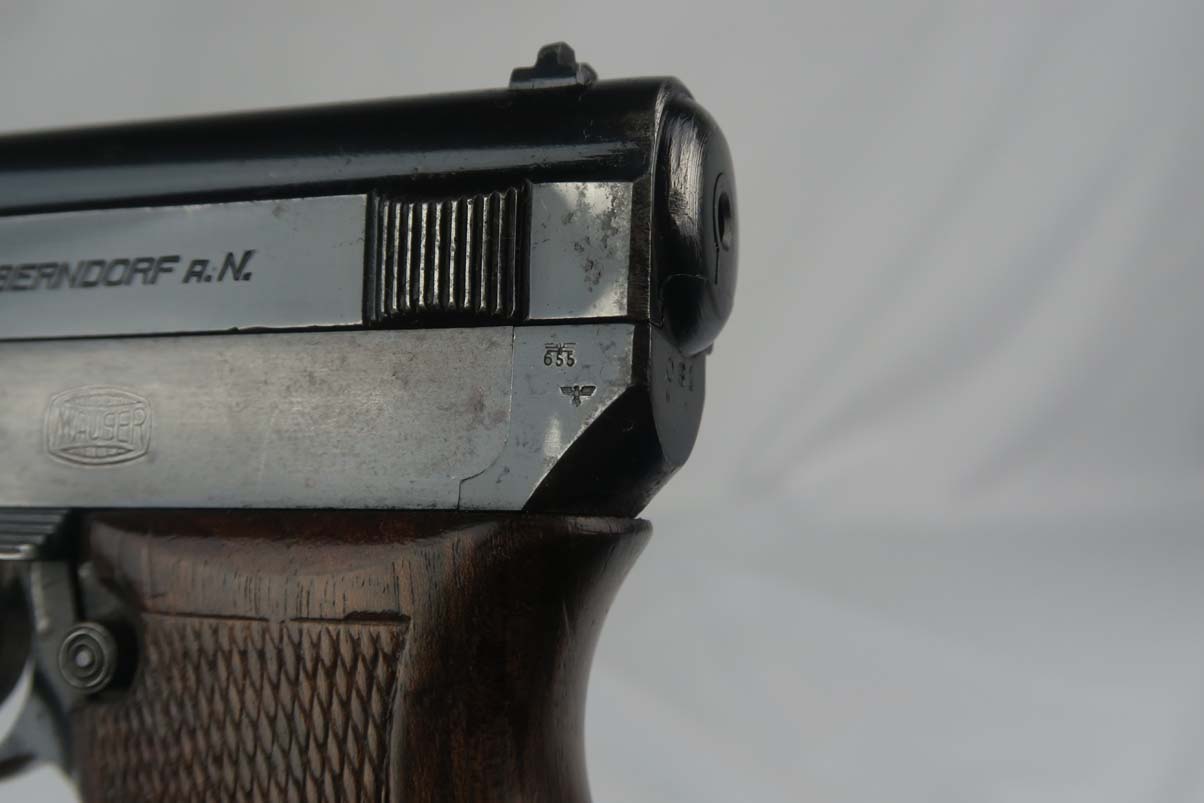 7/17/17 – This is a scarce Army Mauser 1934, of which only ~8,000 were produced for use by the German army. This pistol is all original and correct, with about 85-90% bluing remaining. The most notable spot of wear is a large area of browning on the left side of the frame. Rear left frame is marked Eagle/655. Eagle/N proofs on slide. The grip has minor dings but no major chips or cracks. Excellent bore with no major flaws.