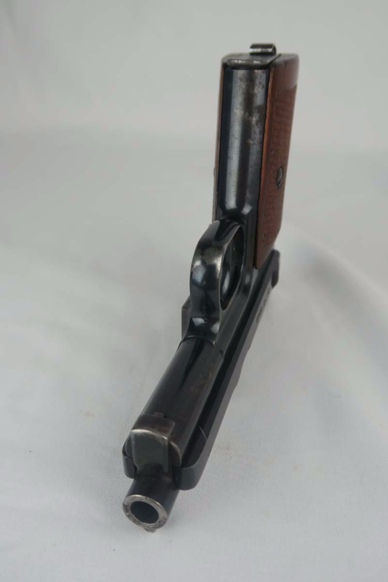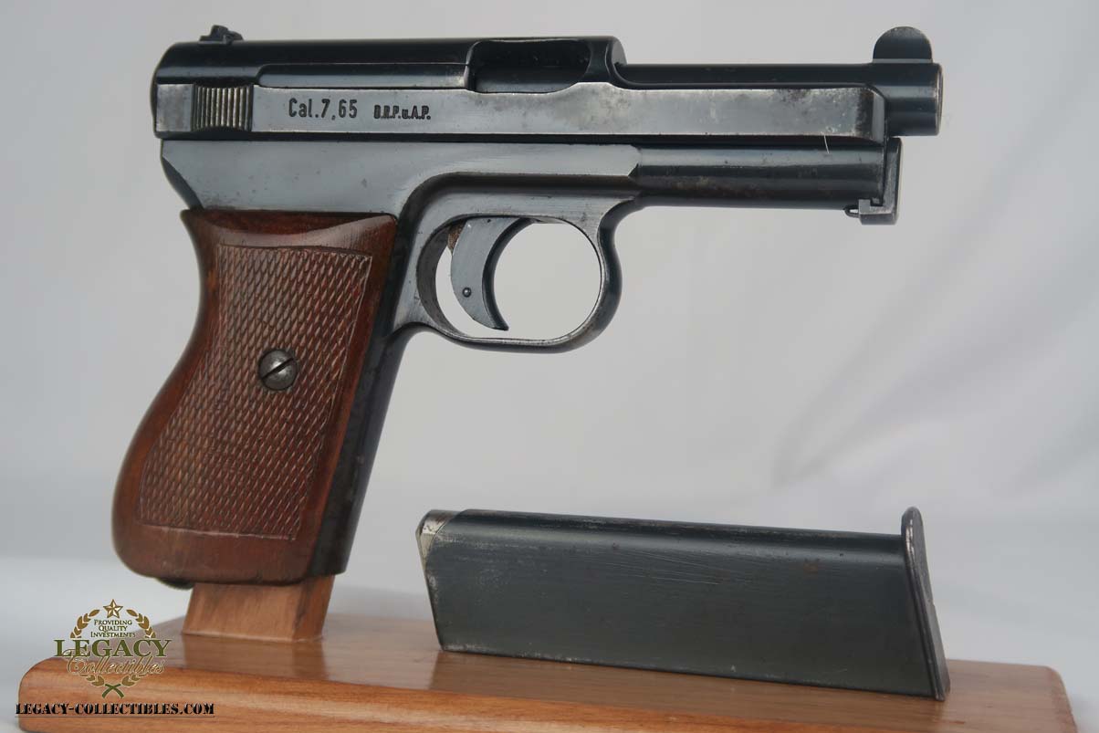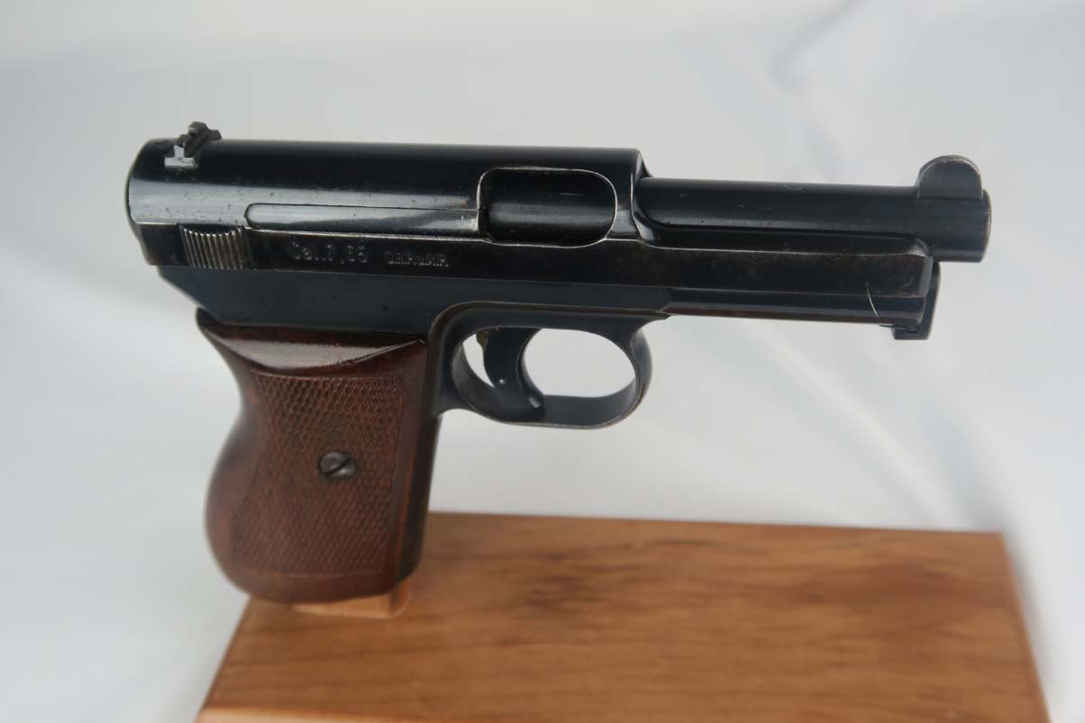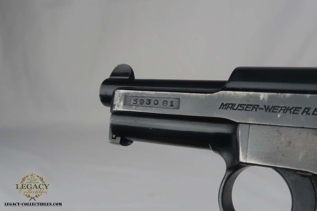 7/17/17 – This is a scarce Army Mauser 1934, of which only ~8,000 were produced for use by the German army. This pistol is all original and correct, with about 85-90% bluing remaining. The most notable spot of wear is a large area of browning on the left side of the frame. Rear left frame is marked Eagle/655. Eagle/N proofs on slide. The grip has minor dings but no major chips or cracks. Excellent bore with no major flaws.