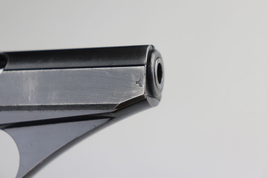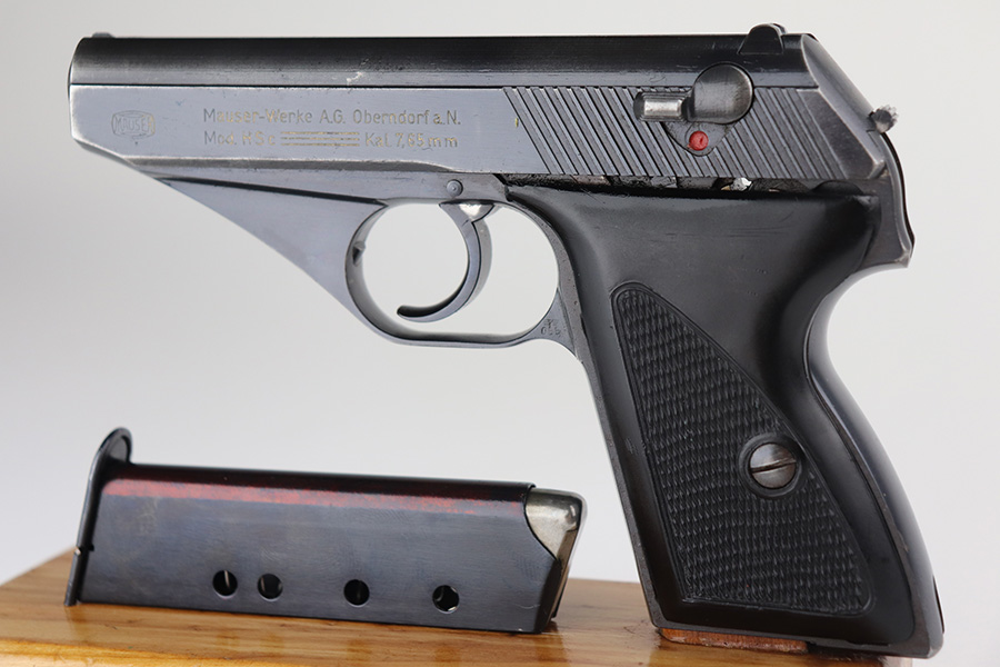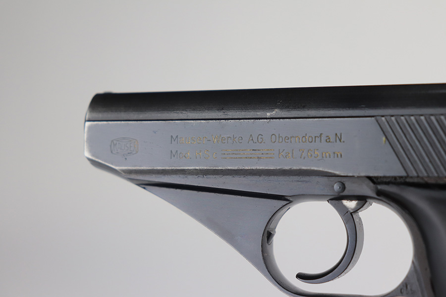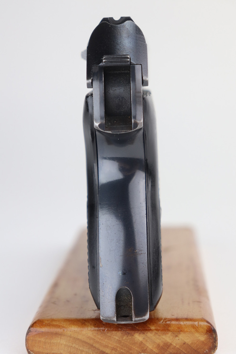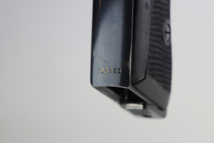 8/11/21 – This is a mismatched Mauser HSc from the Nazi era. The frame is an early serial with E/655 inspection proof, and high-polish blue. The slide is from later in the war. The finish is original on these parts but more thinning is visible on the slide, and there’s a small area of finish loss on both straps. Strong, shiny bore. Postwar black grips. Postwar magazine, as well.