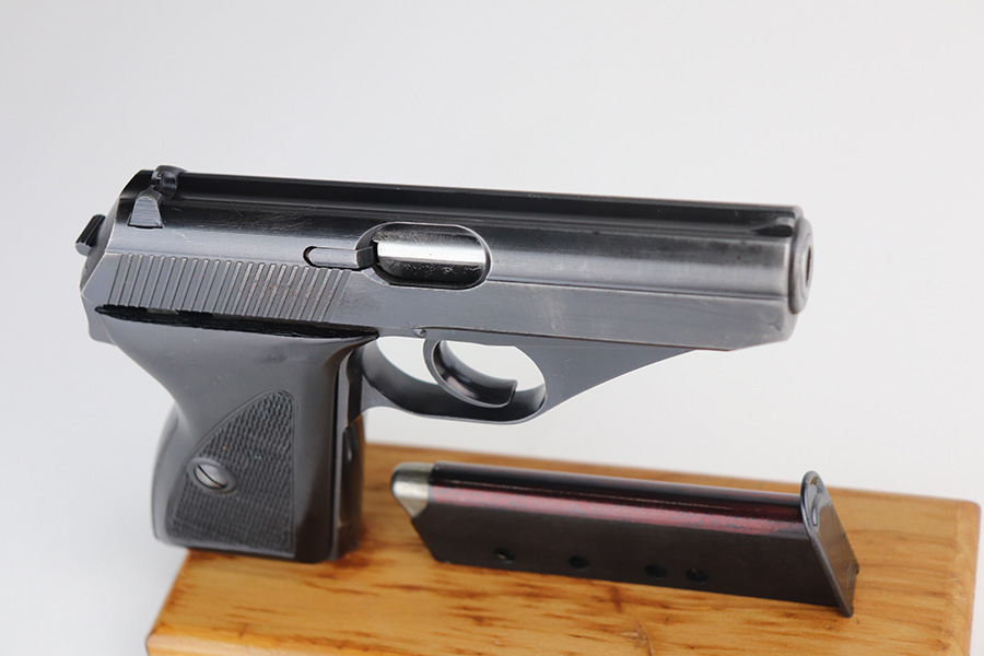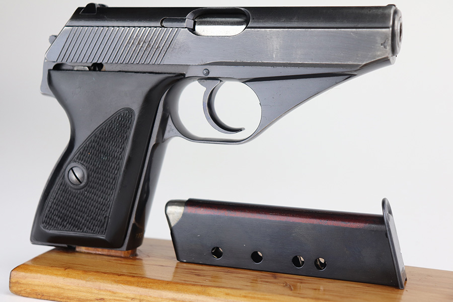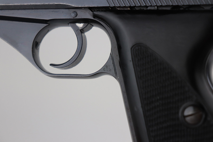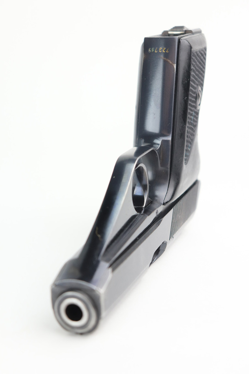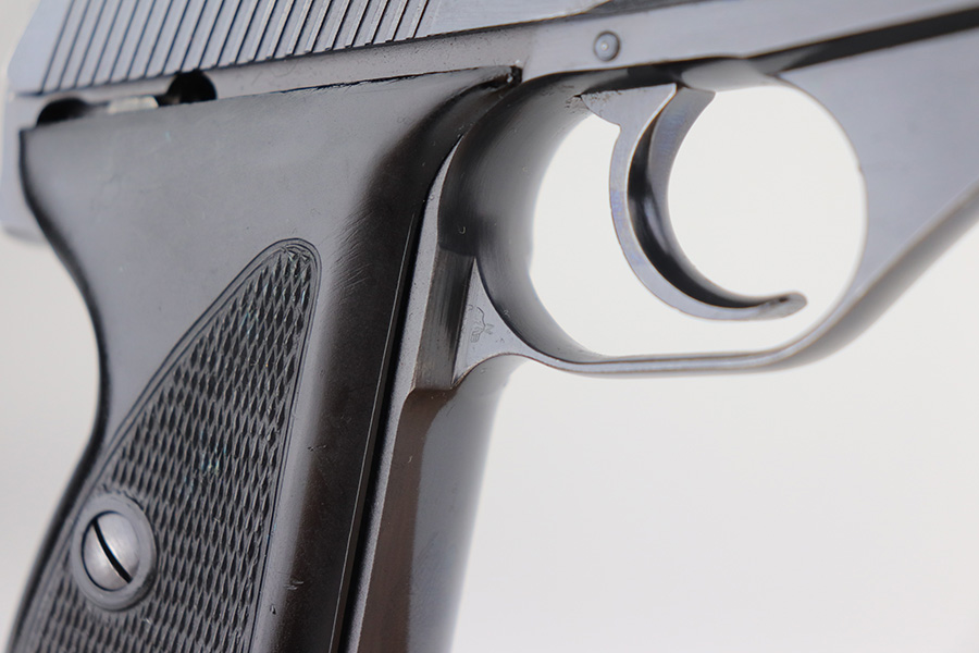 8/11/21 – This is a mismatched Mauser HSc from the Nazi era. The frame is an early serial with E/655 inspection proof, and high-polish blue. The slide is from later in the war. The finish is original on these parts but more thinning is visible on the slide, and there’s a small area of finish loss on both straps. Strong, shiny bore. Postwar black grips. Postwar magazine, as well.