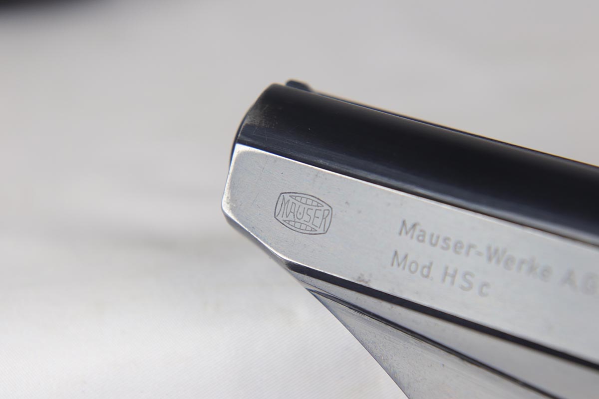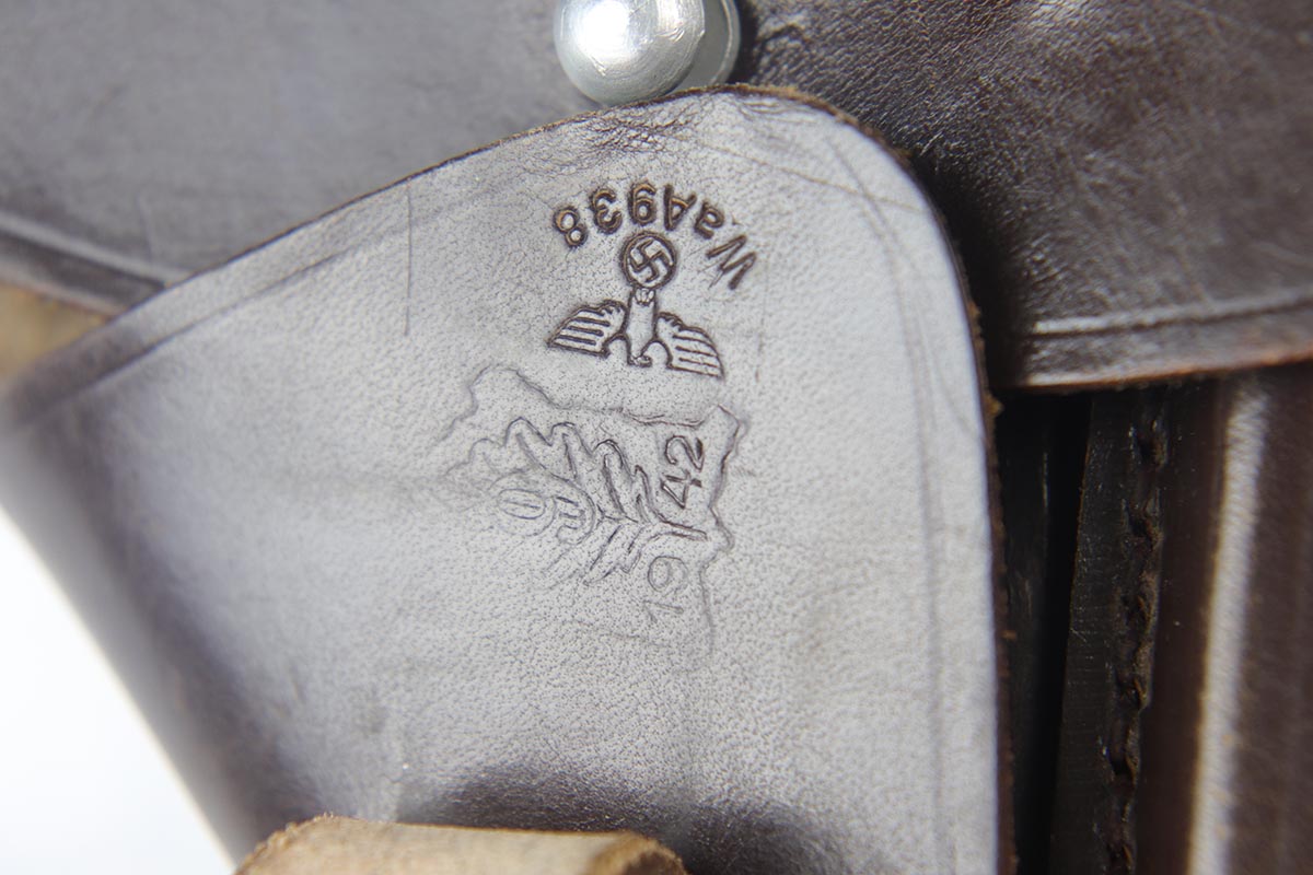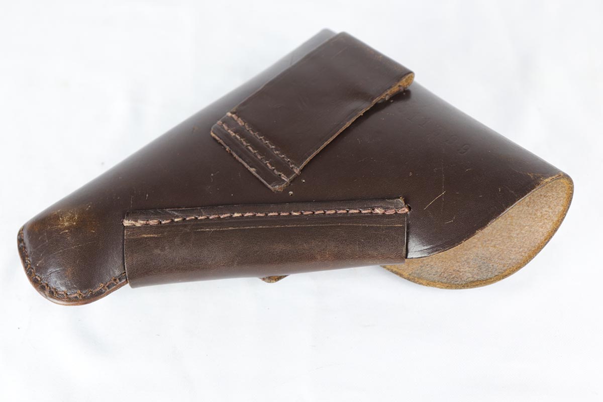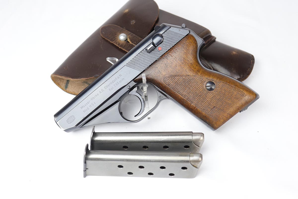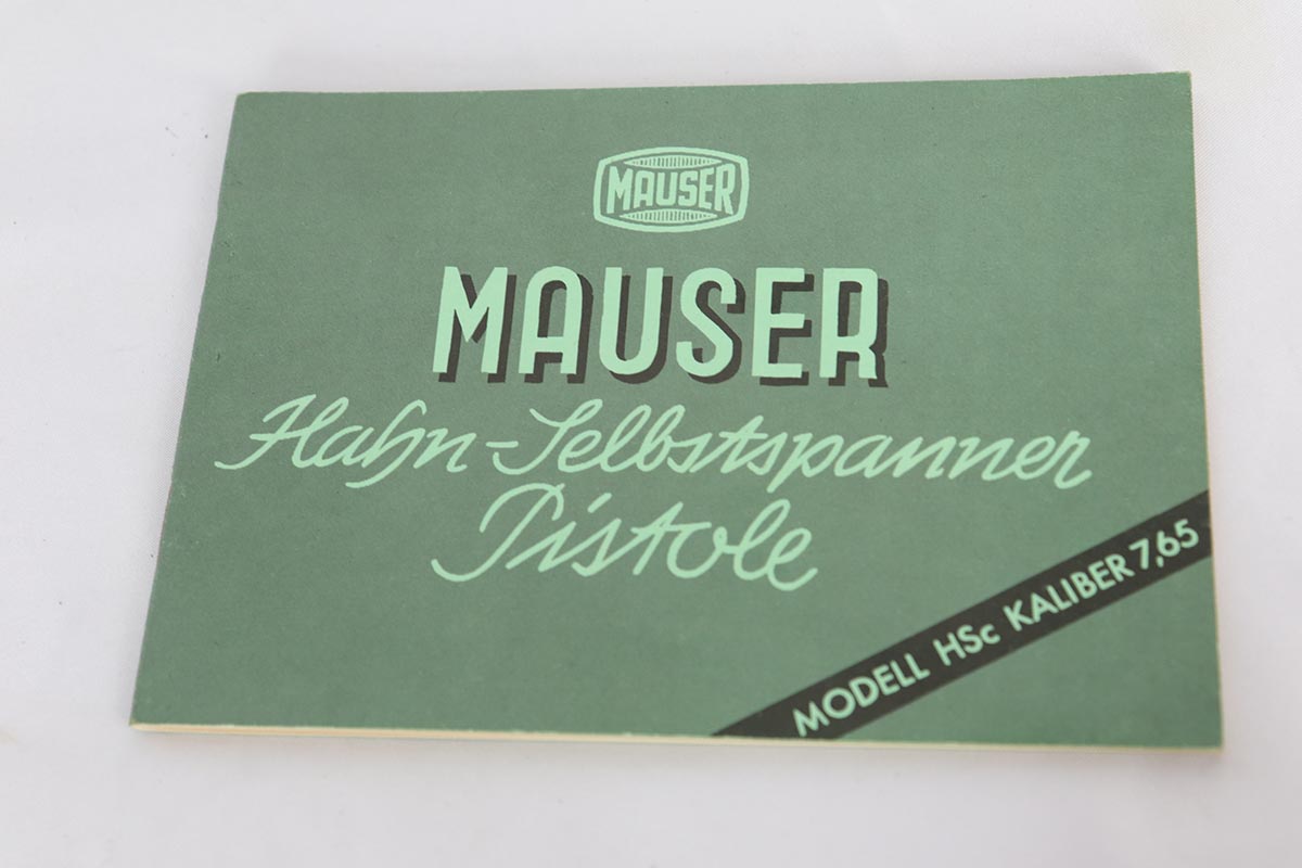 8/17/18 – This is a nice example of a complete and original Mauser HSc rig that was issued to the German Army in 1941.  The high-polish blue rates at 95% with minor patina on the straps and muzzle/high edge thinning on the slide.  Frame shows E/655 proof on trigger guard.  Rig comes with spare magazine, post-war manual and a fantastic 1942 dated holster.  The holster is internally inkstamped and externally waffen marked.  It is also numbered on the back but to another HSc.  Pistol has an excellent bore.