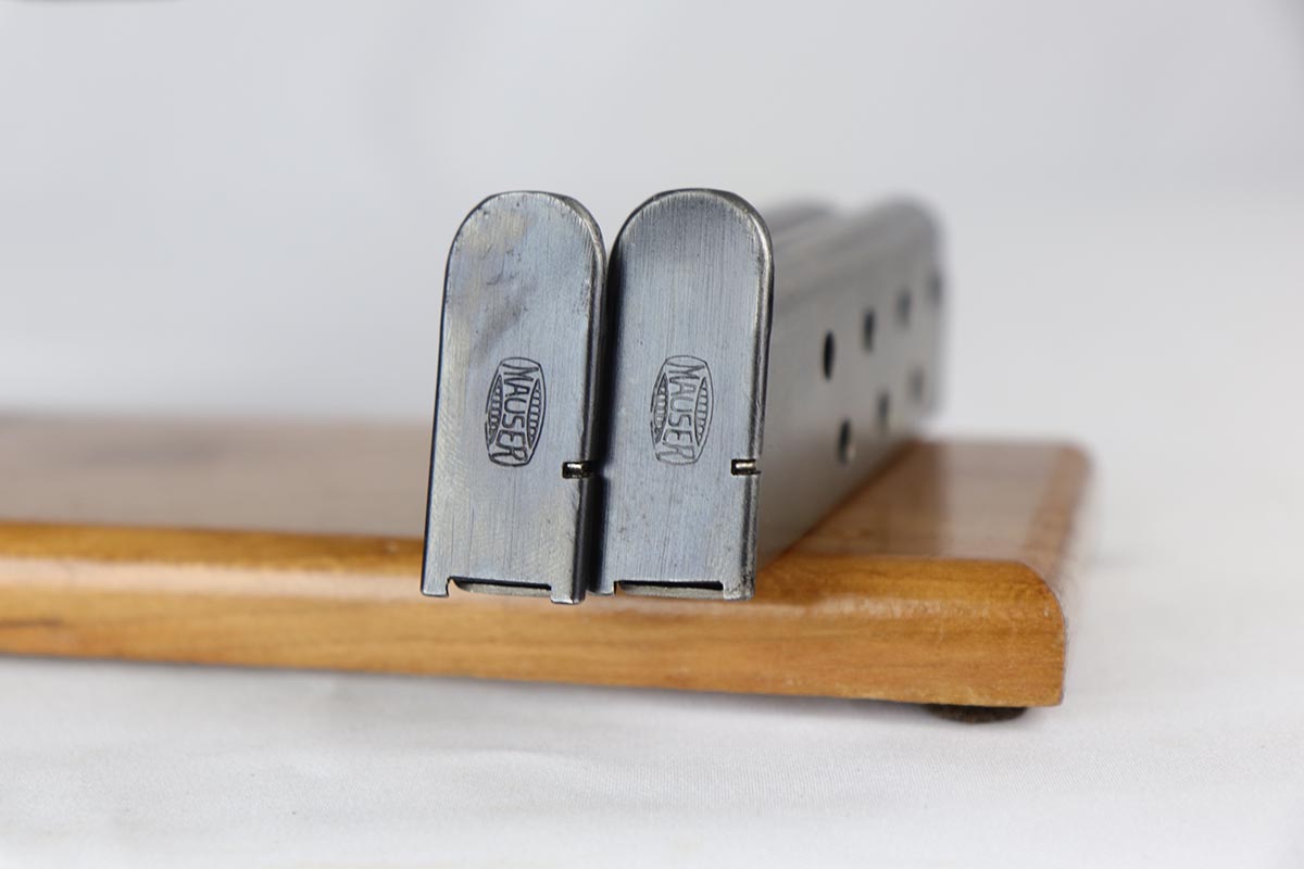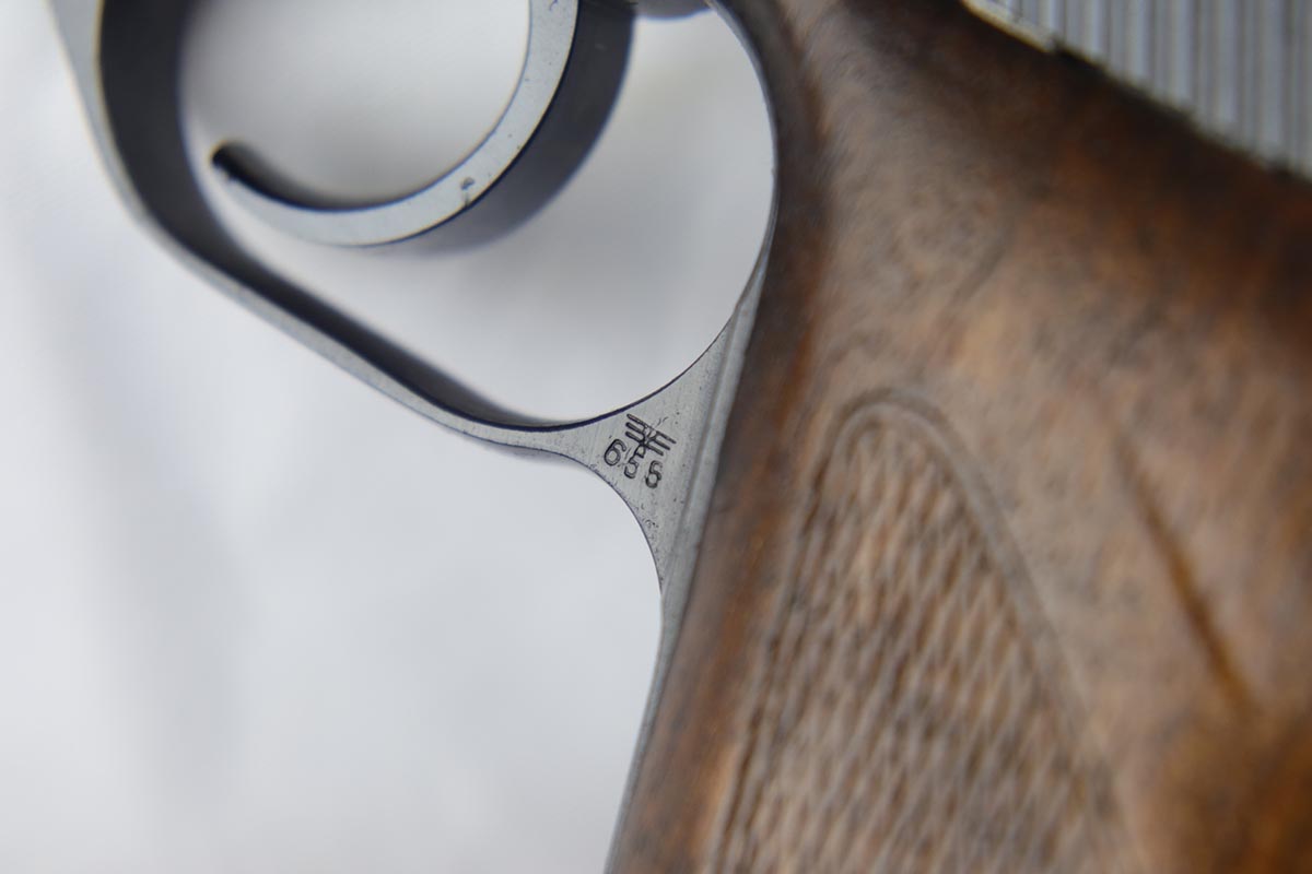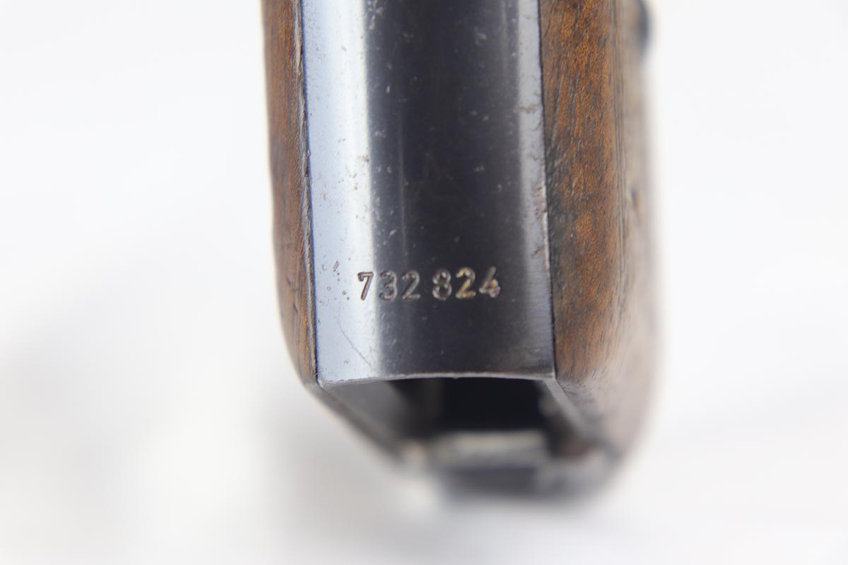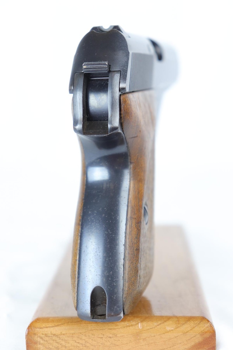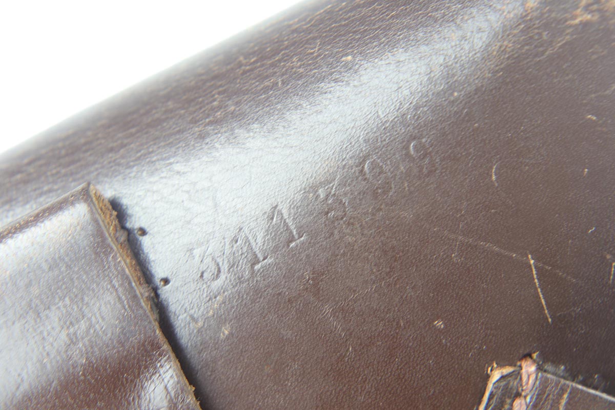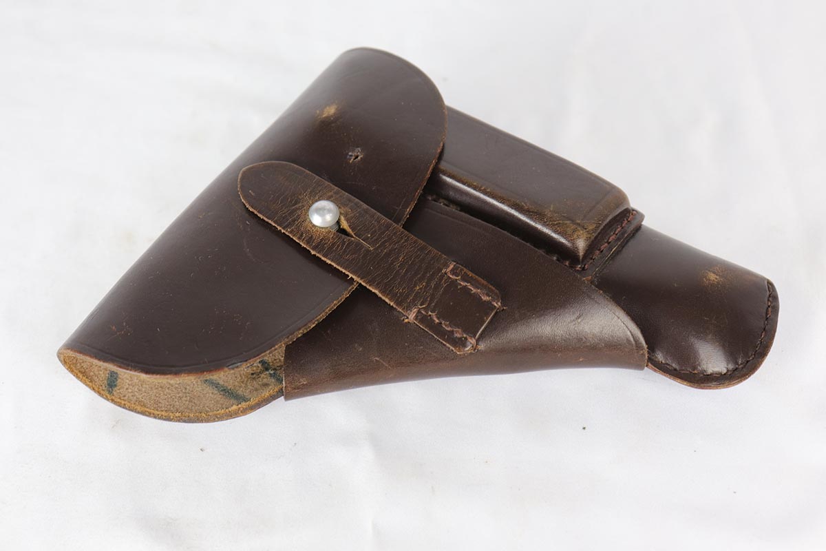 8/17/18 – This is a nice example of a complete and original Mauser HSc rig that was issued to the German Army in 1941.  The high-polish blue rates at 95% with minor patina on the straps and muzzle/high edge thinning on the slide.  Frame shows E/655 proof on trigger guard.  Rig comes with spare magazine, post-war manual and a fantastic 1942 dated holster.  The holster is internally inkstamped and externally waffen marked.  It is also numbered on the back but to another HSc.  Pistol has an excellent bore.