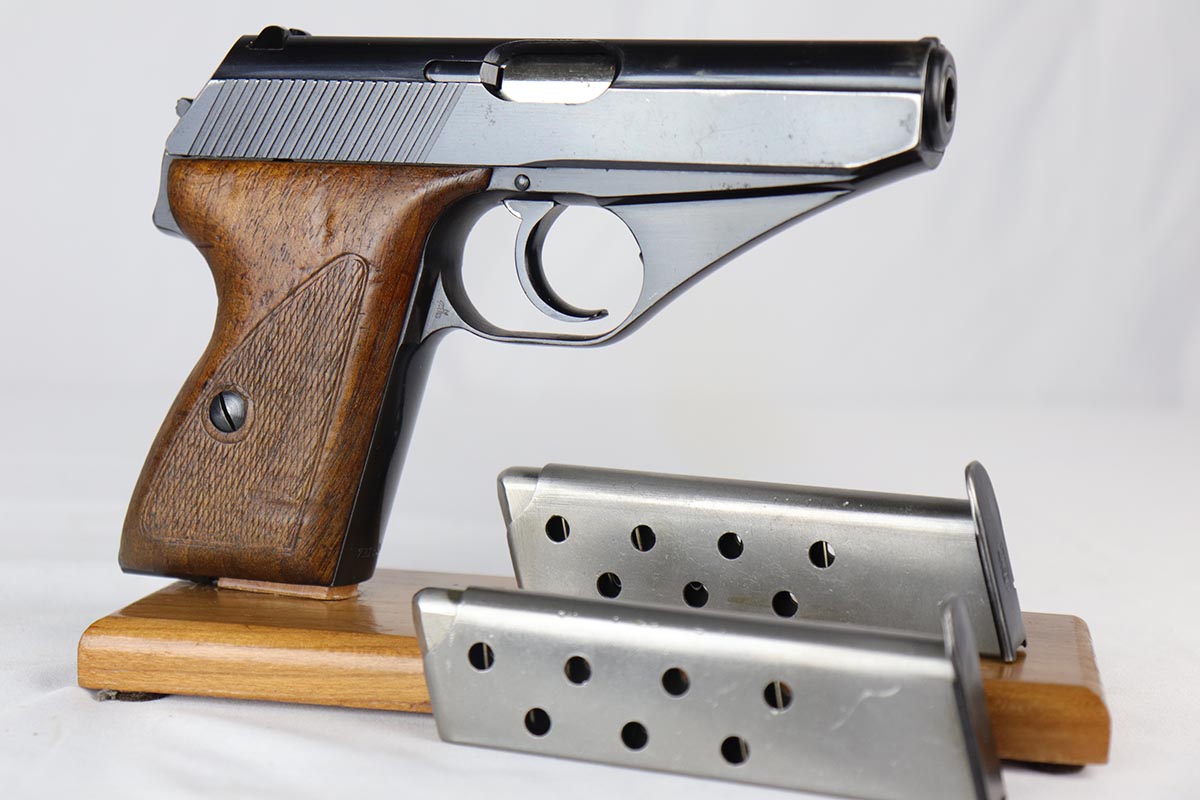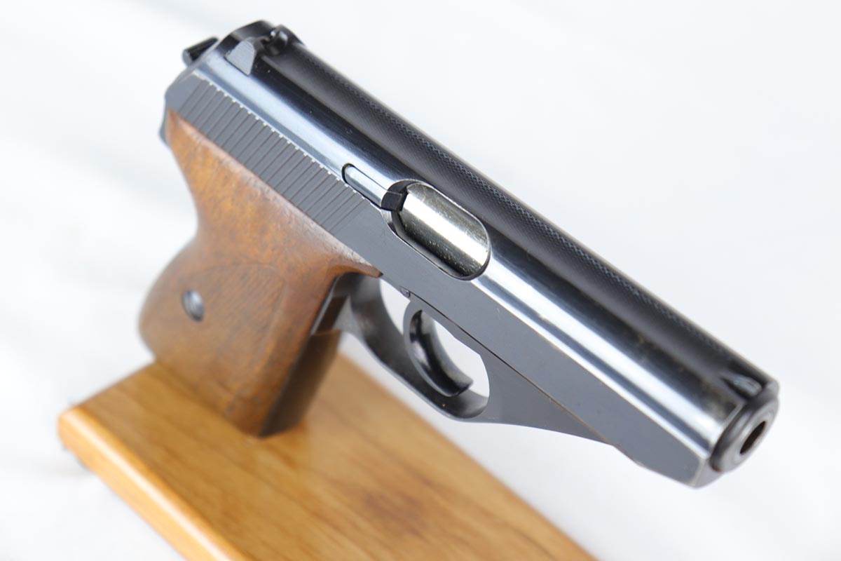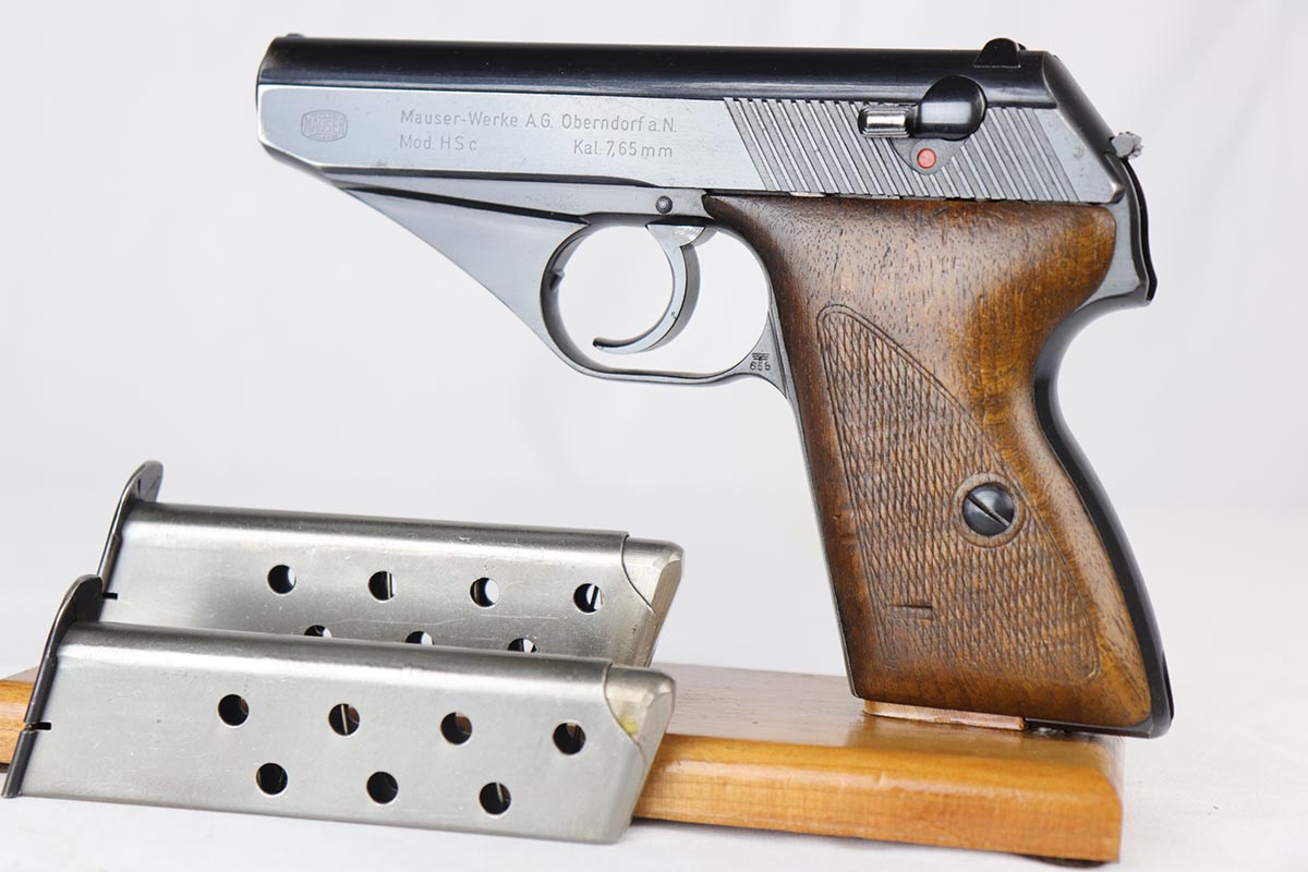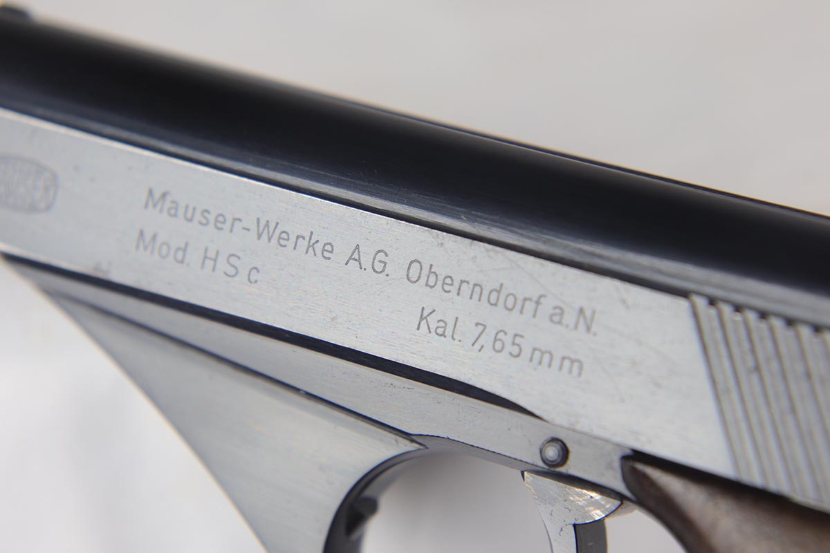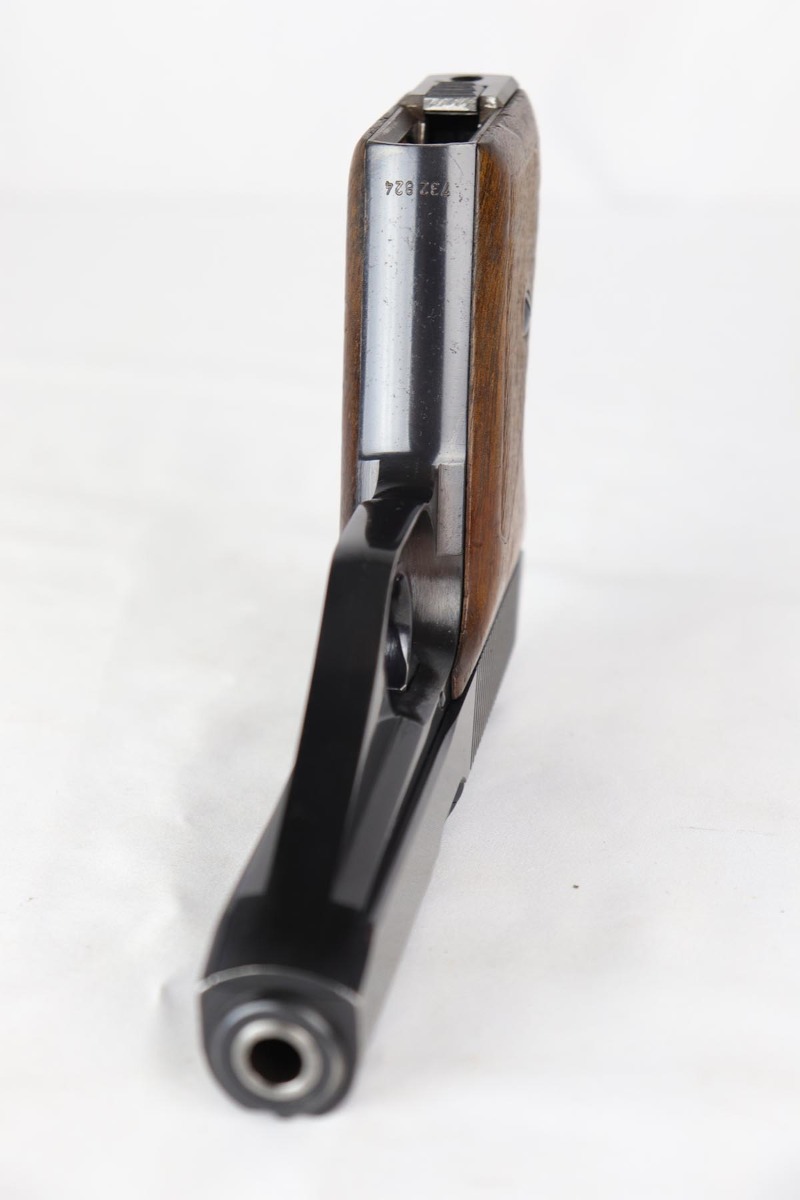 8/17/18 – This is a nice example of a complete and original Mauser HSc rig that was issued to the German Army in 1941.  The high-polish blue rates at 95% with minor patina on the straps and muzzle/high edge thinning on the slide.  Frame shows E/655 proof on trigger guard.  Rig comes with spare magazine, post-war manual and a fantastic 1942 dated holster.  The holster is internally inkstamped and externally waffen marked.  It is also numbered on the back but to another HSc.  Pistol has an excellent bore.