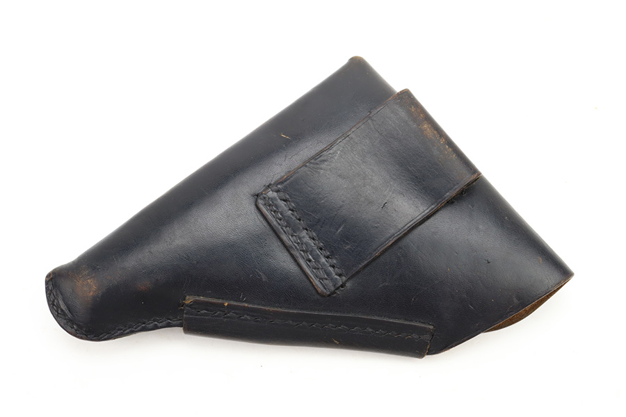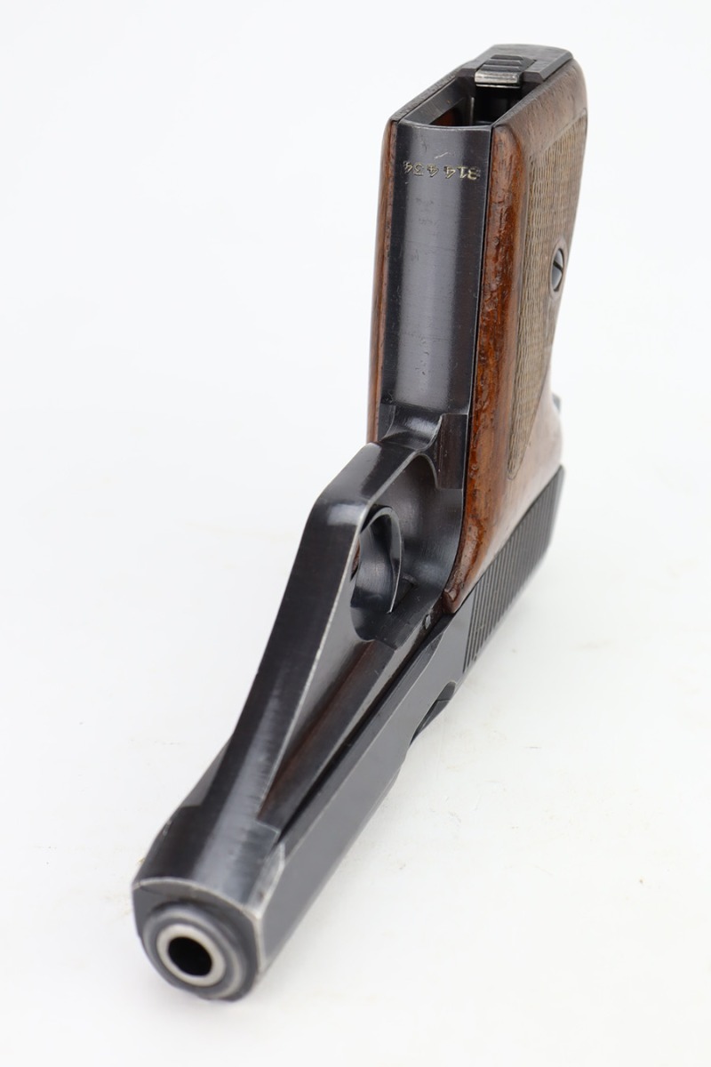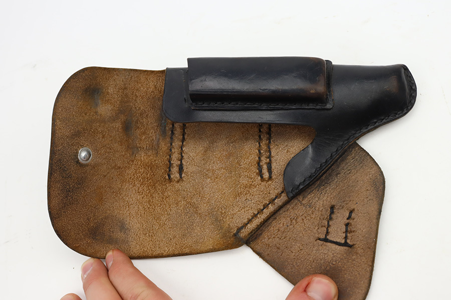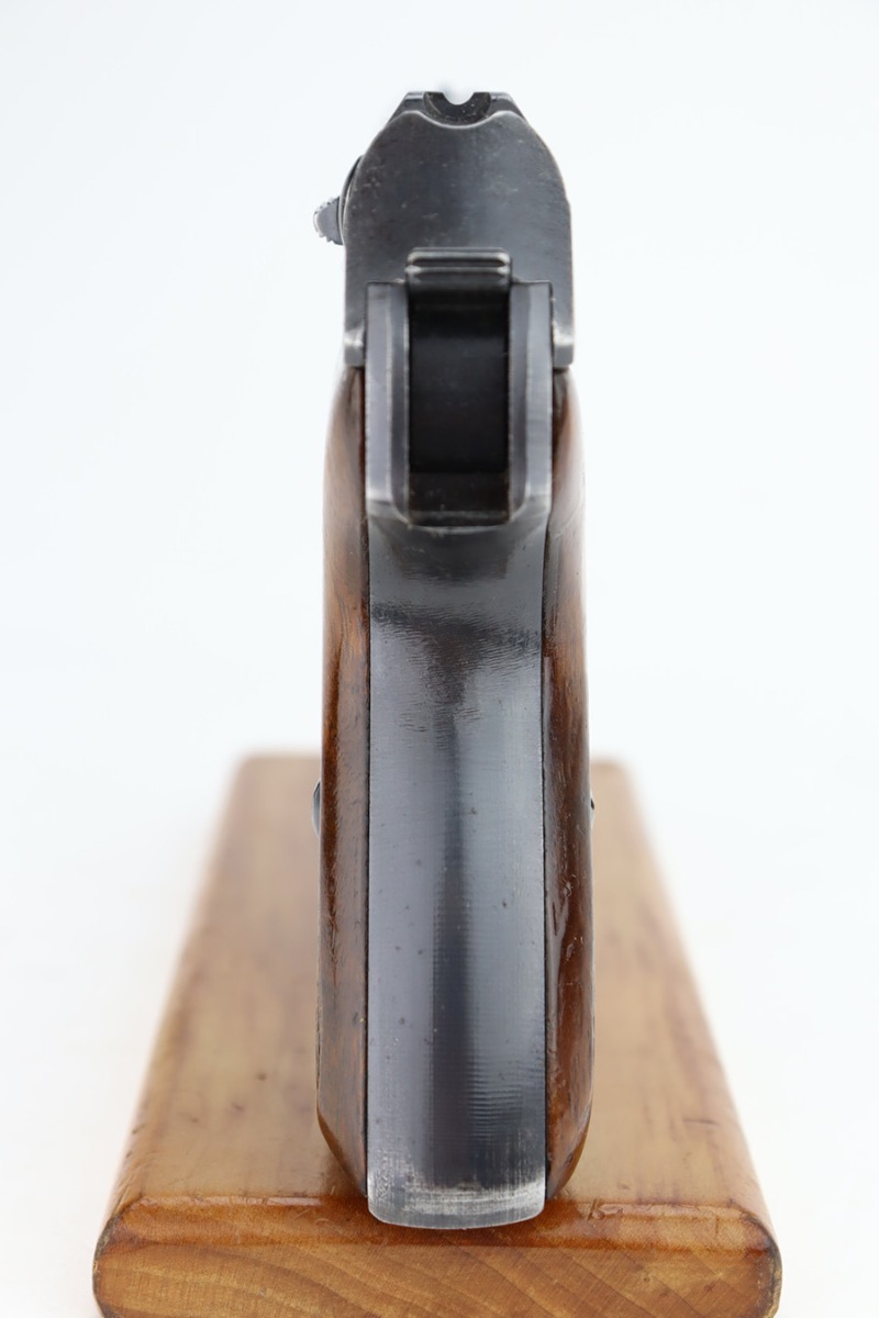 11/30/23 – This is a complete Mauser HSc rig that was issued to the German Army in early 1943. All original with 90-95% of the blue remaining. This one is somewhat difficult to rate as the rounded portions of the slide show some general thinning and oxidation but there aren’t any major areas of bluing loss on the pistol. E/135 proof on frame. Minty bore. Excellent wood grips with no cracks or chips. The listing includes two magazines, one with half-moon base, the other flat. Also comes with a period leather holster that is unmarked.