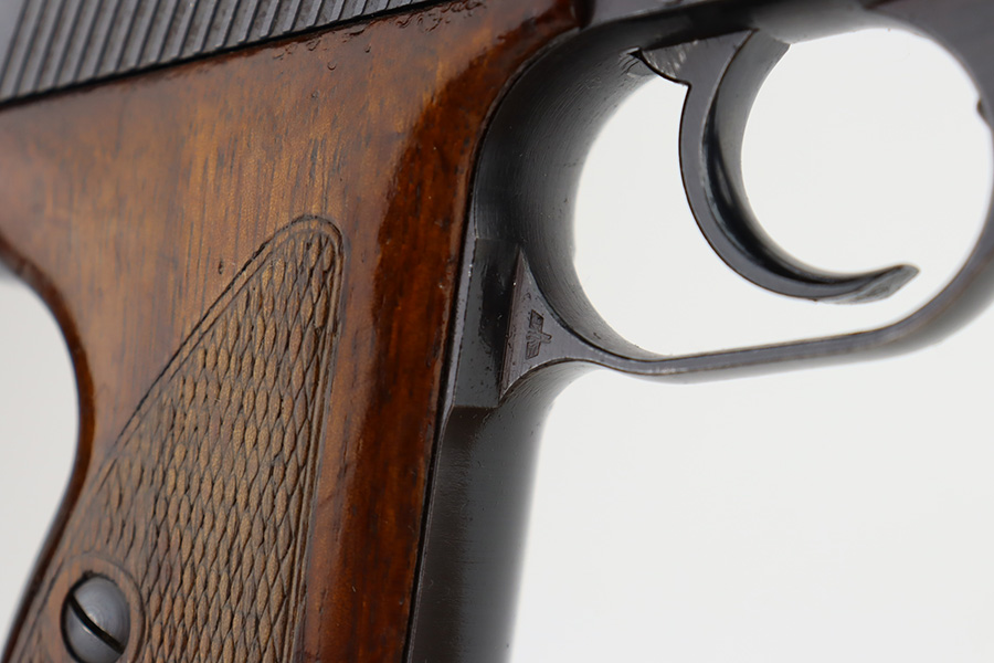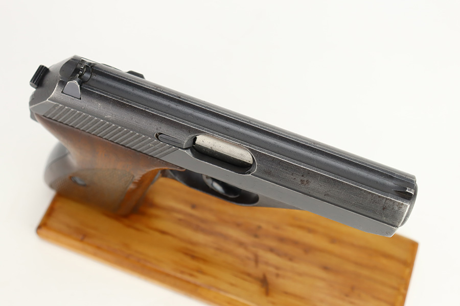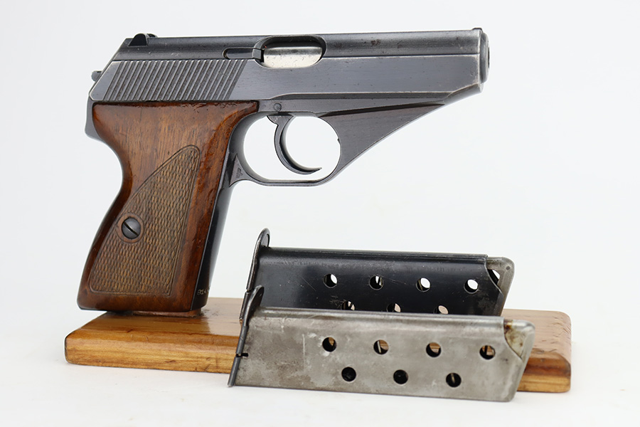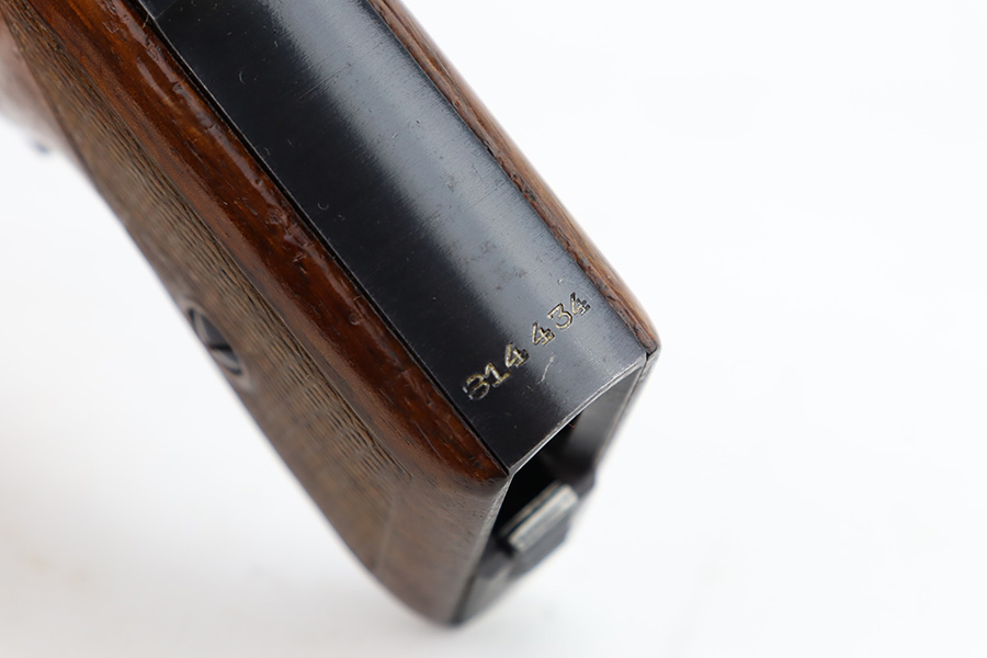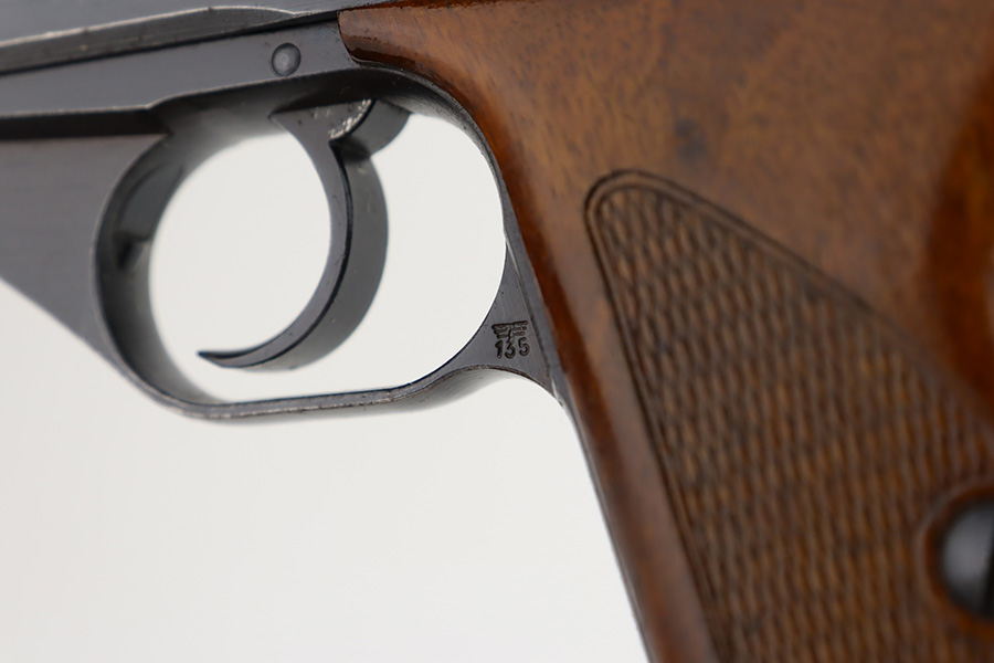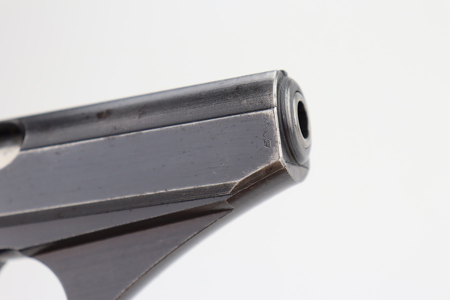 11/30/23 – This is a complete Mauser HSc rig that was issued to the German Army in early 1943. All original with 90-95% of the blue remaining. This one is somewhat difficult to rate as the rounded portions of the slide show some general thinning and oxidation but there aren’t any major areas of bluing loss on the pistol. E/135 proof on frame. Minty bore. Excellent wood grips with no cracks or chips. The listing includes two magazines, one with half-moon base, the other flat. Also comes with a period leather holster that is unmarked.