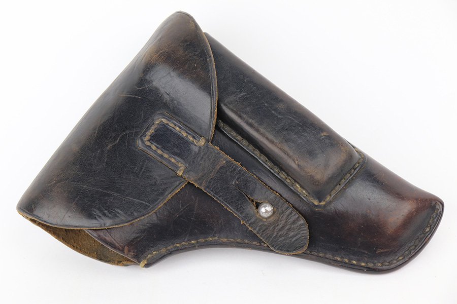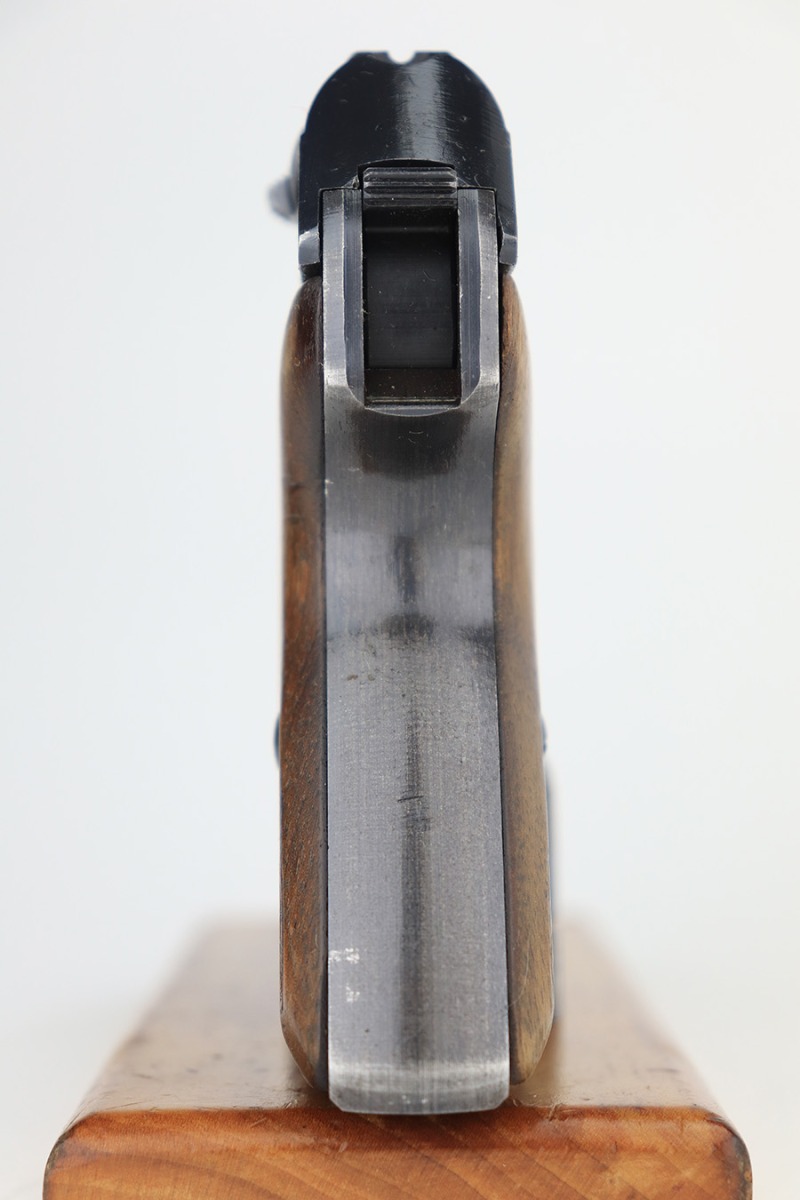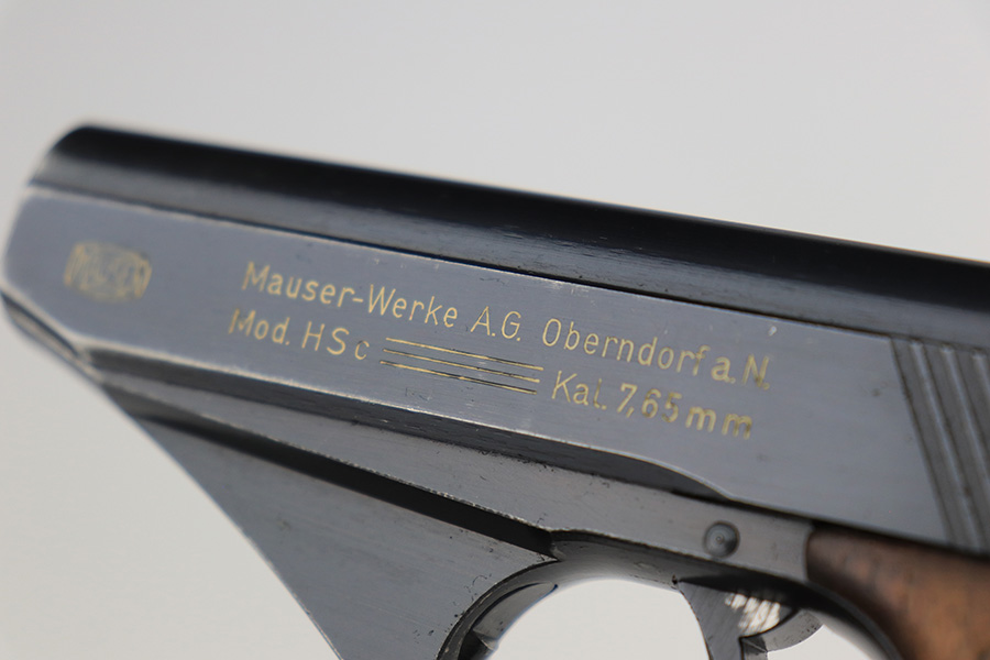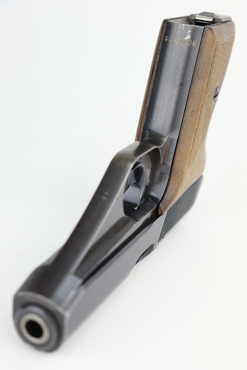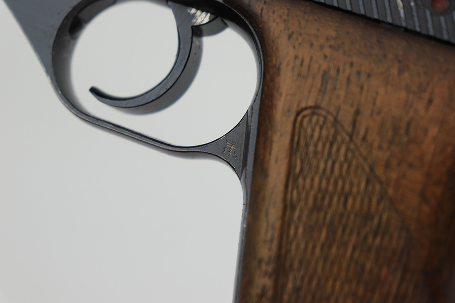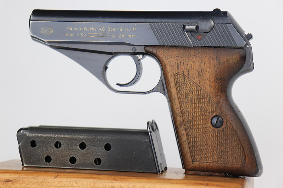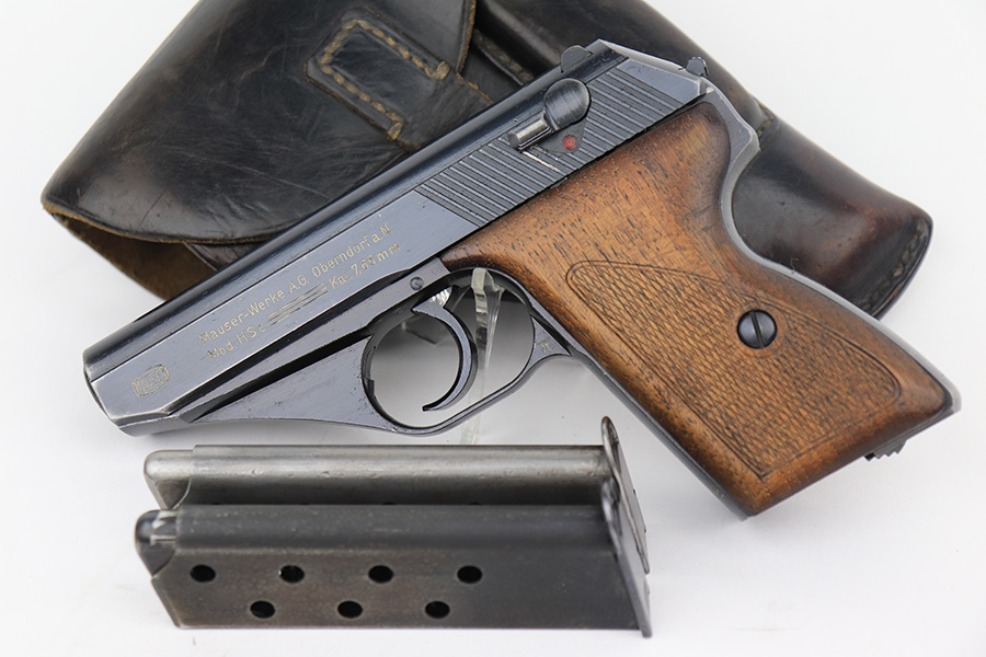 2/22/23 – This is a very nice Mauser HSc with spare magazine and holster. Army-issued in 1943 with E/135 inspection proof. The pistol has about 95-96% of the military blue remaining, with holster wear around the muzzle, bottom of back strap and trigger guard. Minty bore. Excellent wood grips with no cracks or chips. Half-moon mag. The spare mag is postwar. The holster is unmarked and it looks like some stitching was moved on the back.