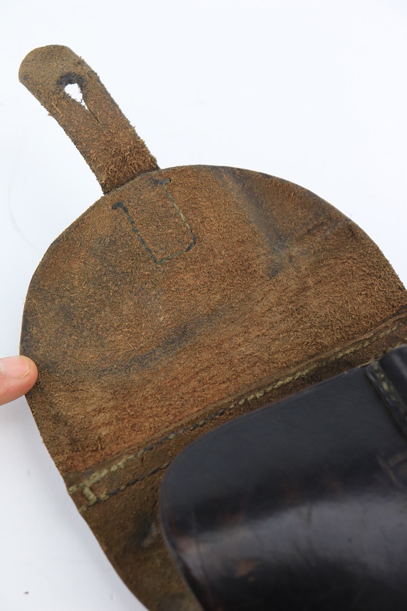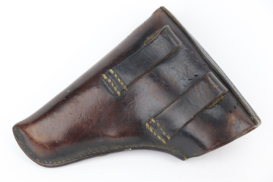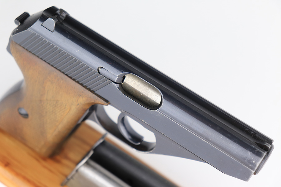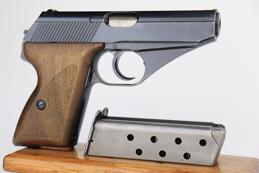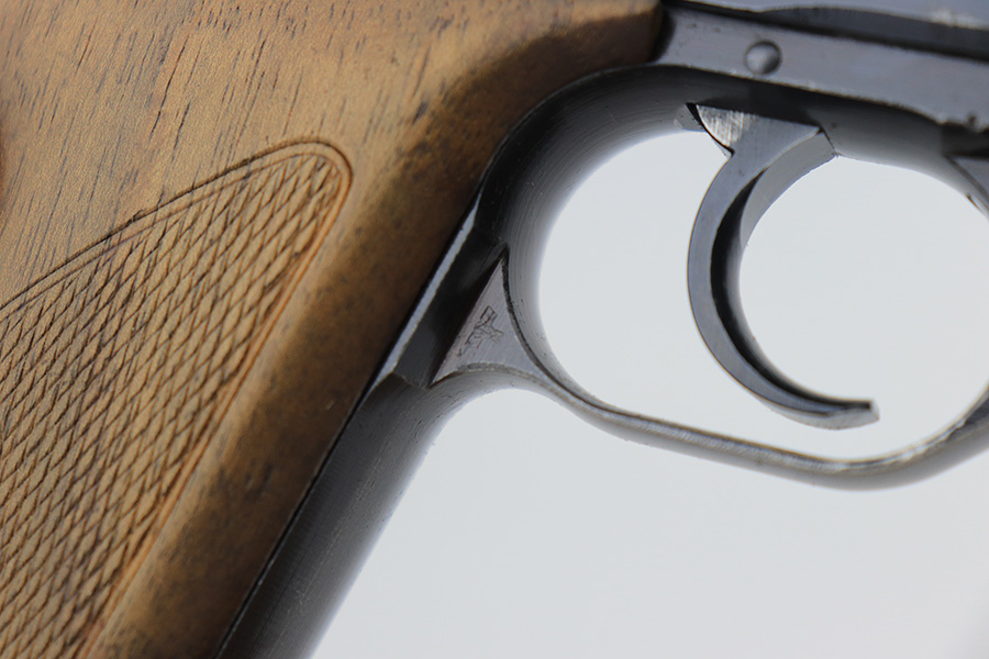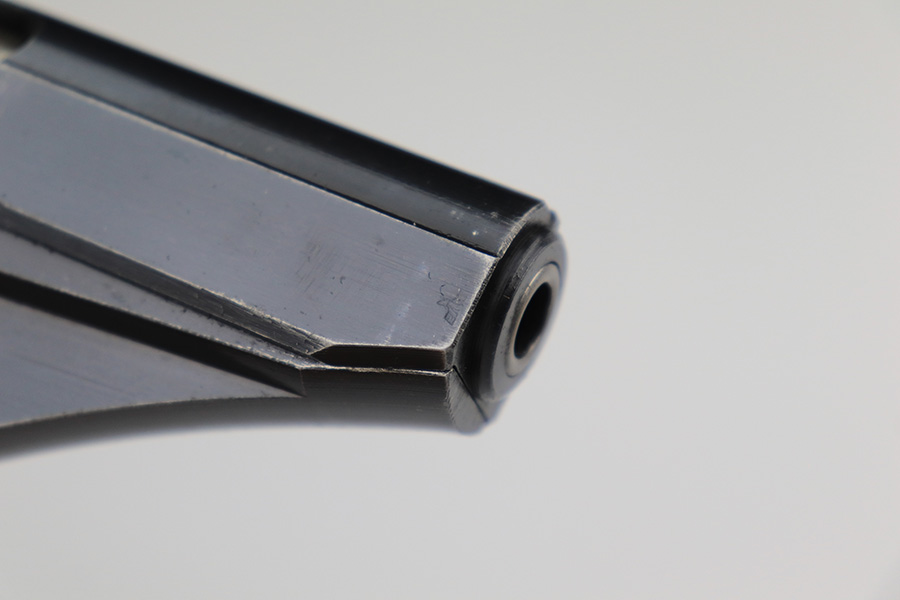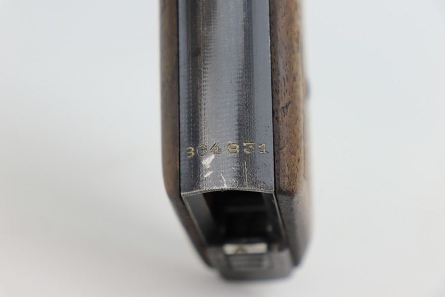 2/22/23 – This is a very nice Mauser HSc with spare magazine and holster. Army-issued in 1943 with E/135 inspection proof. The pistol has about 95-96% of the military blue remaining, with holster wear around the muzzle, bottom of back strap and trigger guard. Minty bore. Excellent wood grips with no cracks or chips. Half-moon mag. The spare mag is postwar. The holster is unmarked and it looks like some stitching was moved on the back.