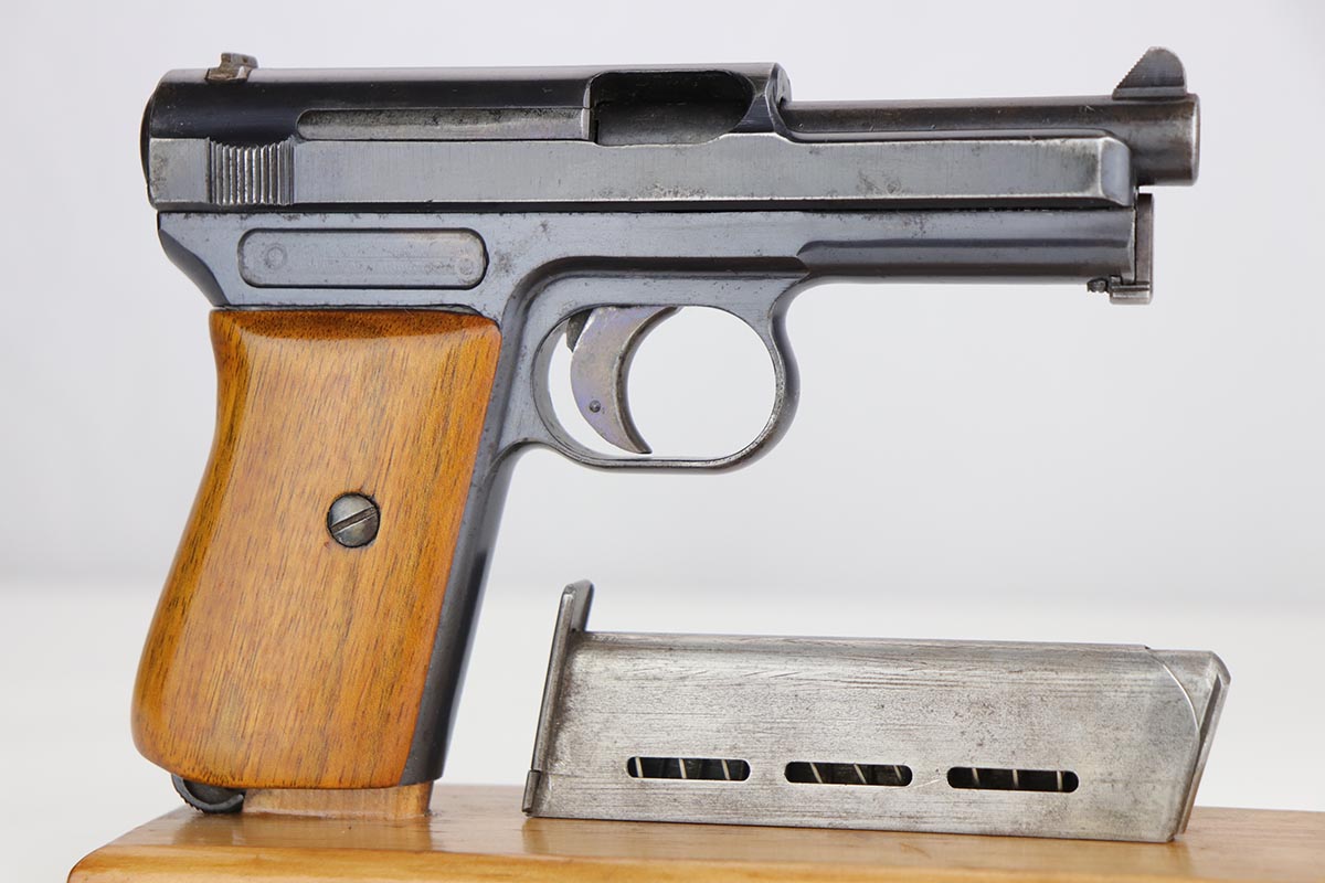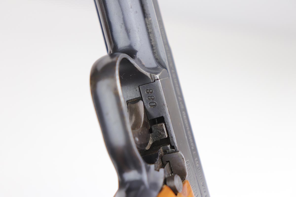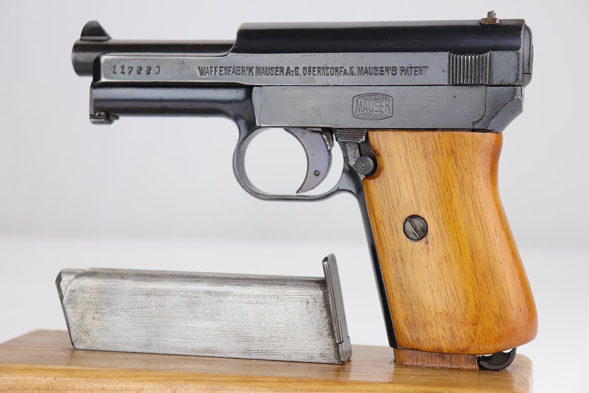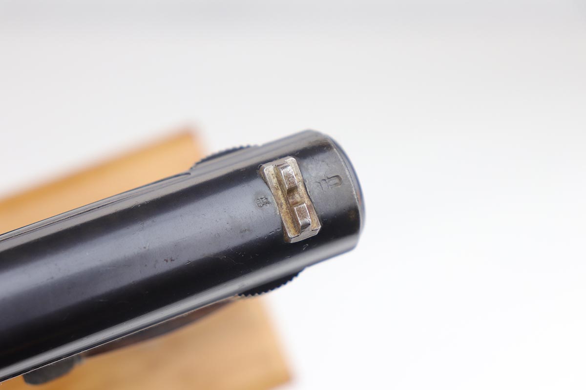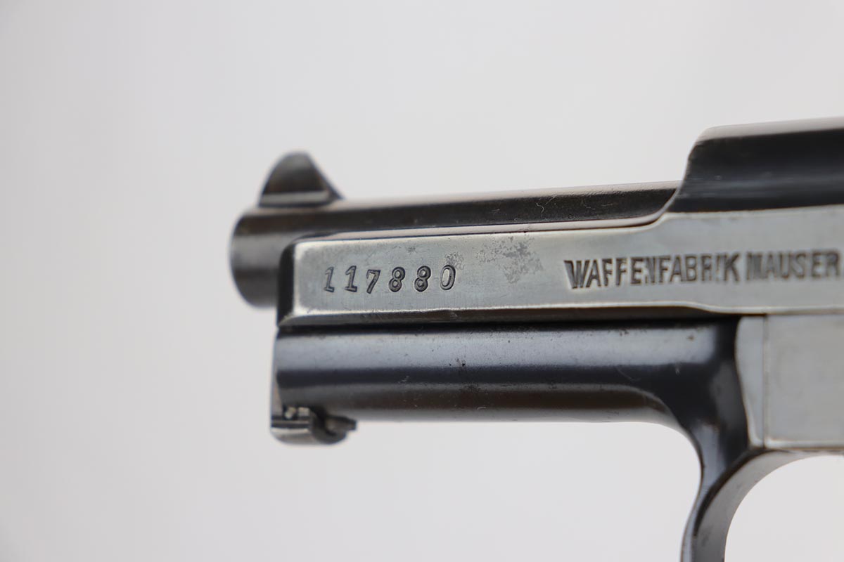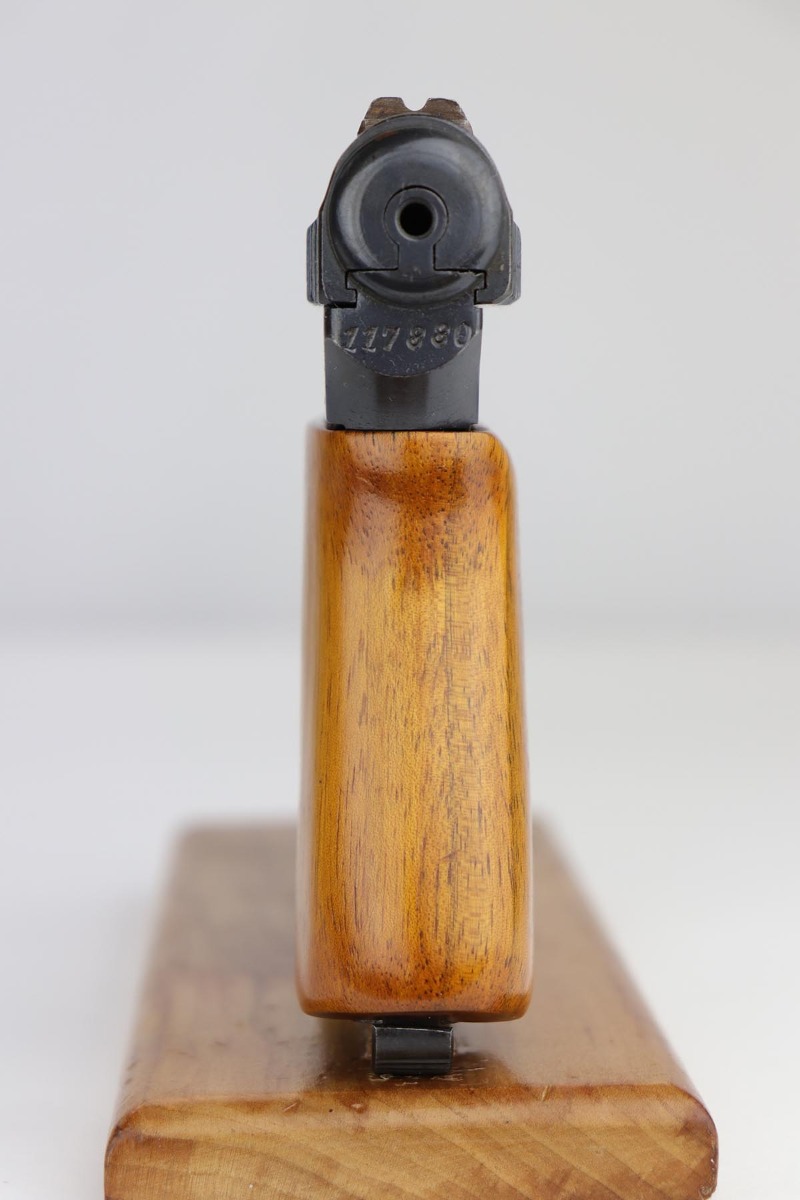 5/15/20 – This is a nice example of an original Mauser Model 1914 pistol that was issued to the German Military, as indicated by the Imperial proof marking in front of the rear sight. Blue rates at 97-98% minor high point thinning, and a couple minor areas of pinpricking. Crown/U proof on slide and barrel. Bore is shiny with good rifling but has some freckling throughout. Wood grip has had been sanded or not original as the checkering is gone.
