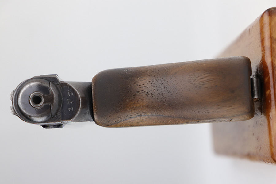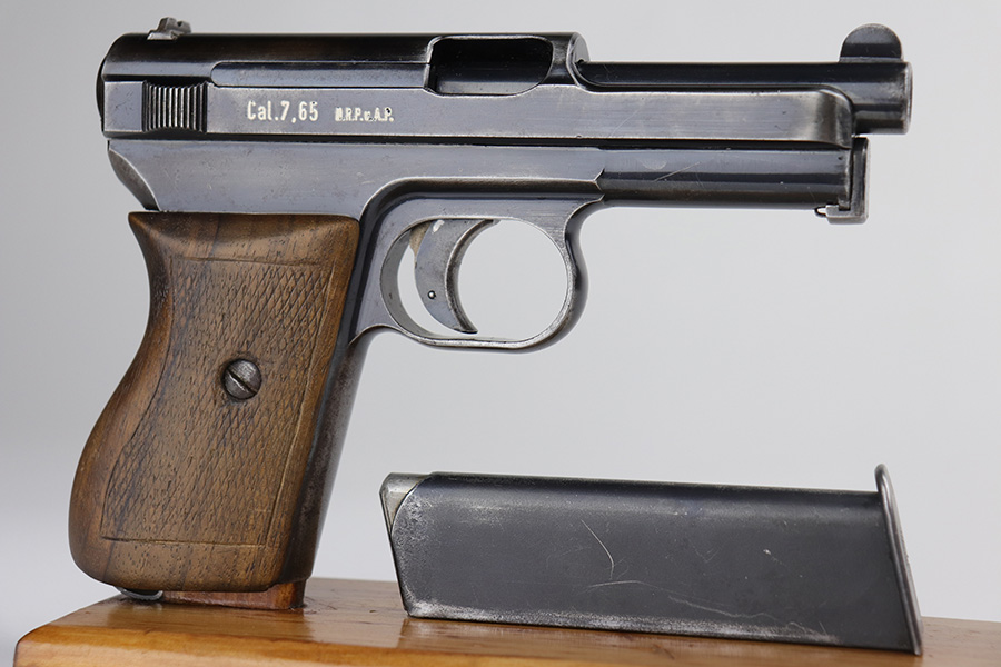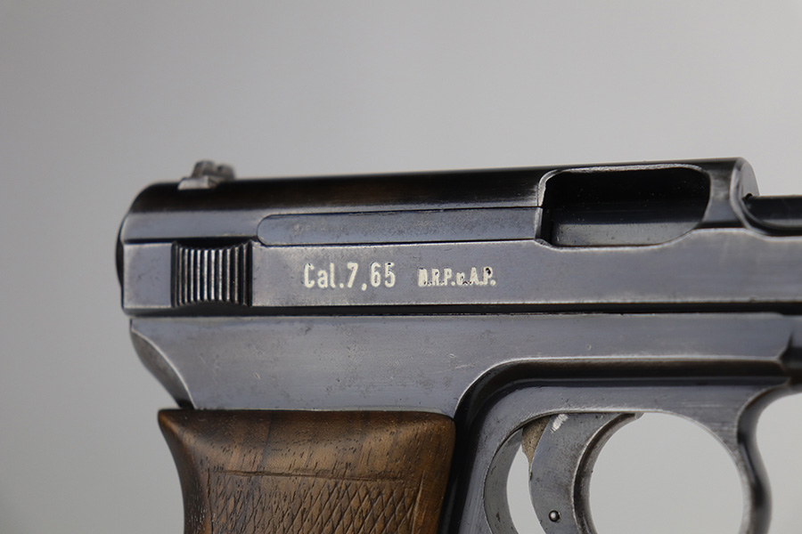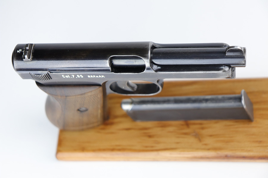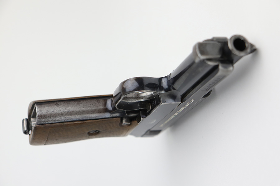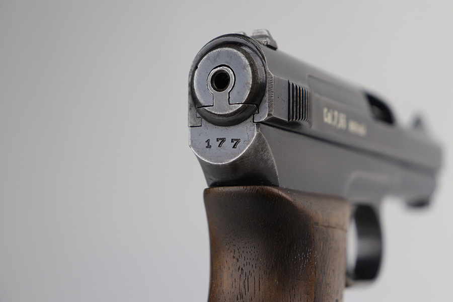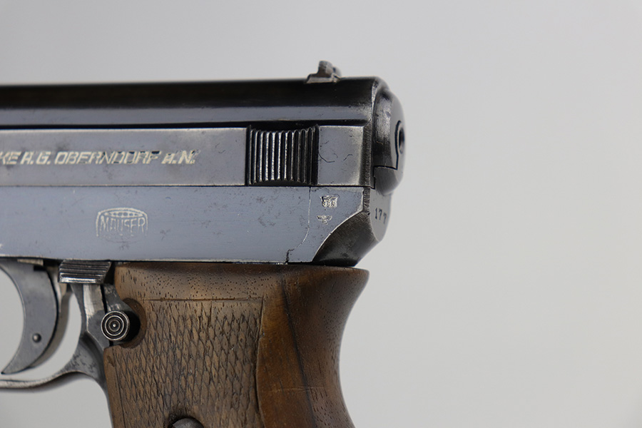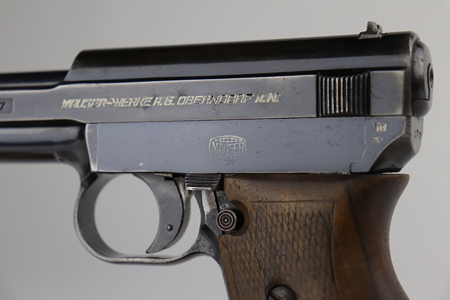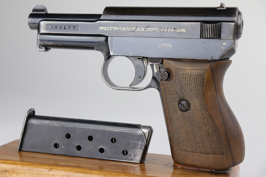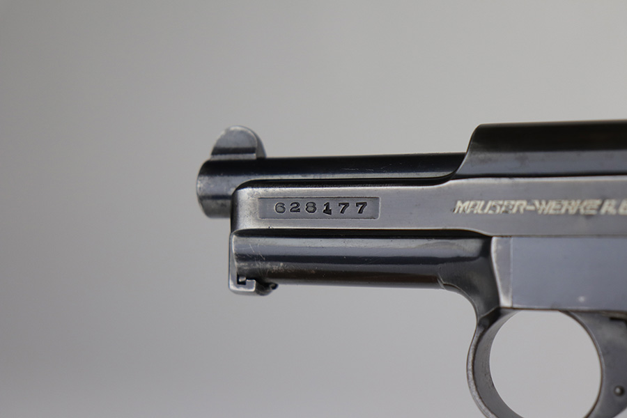 10/26/21 – This is a nice example of a rare Nazi Mauser M1934 that was manufactured at the turn of the ’40s and issued to the German Army. One of only 8,000 produced. It has standard high edge wear from the holsters on the sides, but most of the bluing loss is on the front strap. E/655 military acceptance proof on left side of frame. Minty bore. Excellent grip with no cracks or chips. NOTE: The original trigger group is numbered and matching to the pistol, but was mechanically defective so we had our gunsmith install a functional trigger group. The original numbered parts are included, but not currently installed on this pistol.