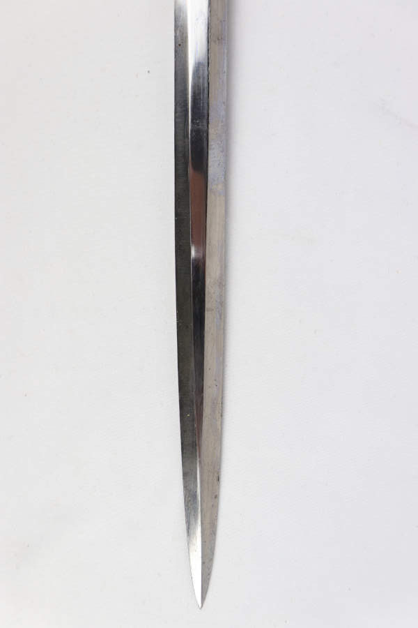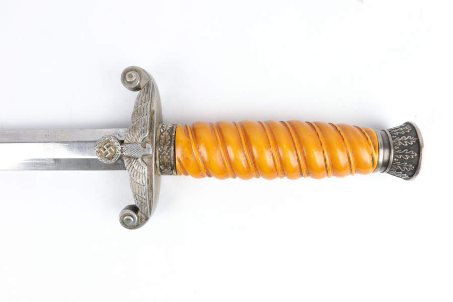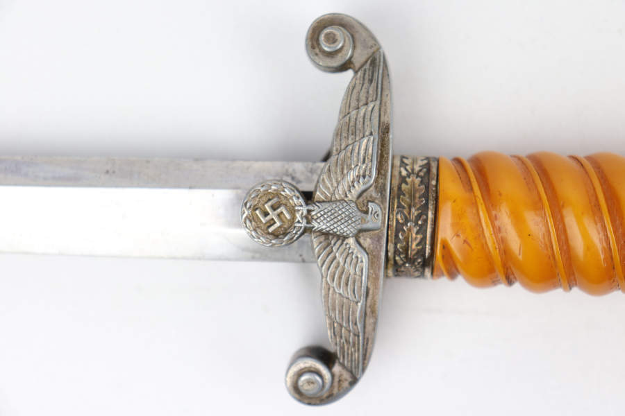 9/23/19 – This is an original WW2 Nazi Army Dagger made by H. Kolping. The makers mark on the blade reads “H. Kolping Solingen”. This unusual maker stamp is seldom seen which adds to the desirability of this blade. The blade is in great condition with only very minor discoloration and light surface scratches from the scabbard throughout. The crossguard is in good condition except for minor pin pricking and light discoloration. The grip and pommel are in excellent condition. The scabbard is in great condition with some minor discoloration throughout. A beautiful collectible dagger overall, priced to sell !