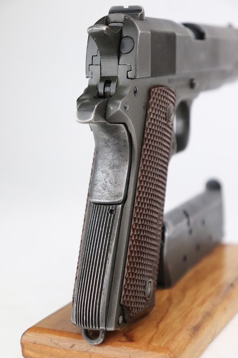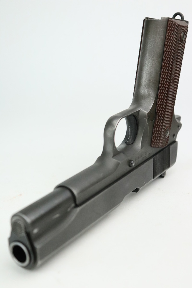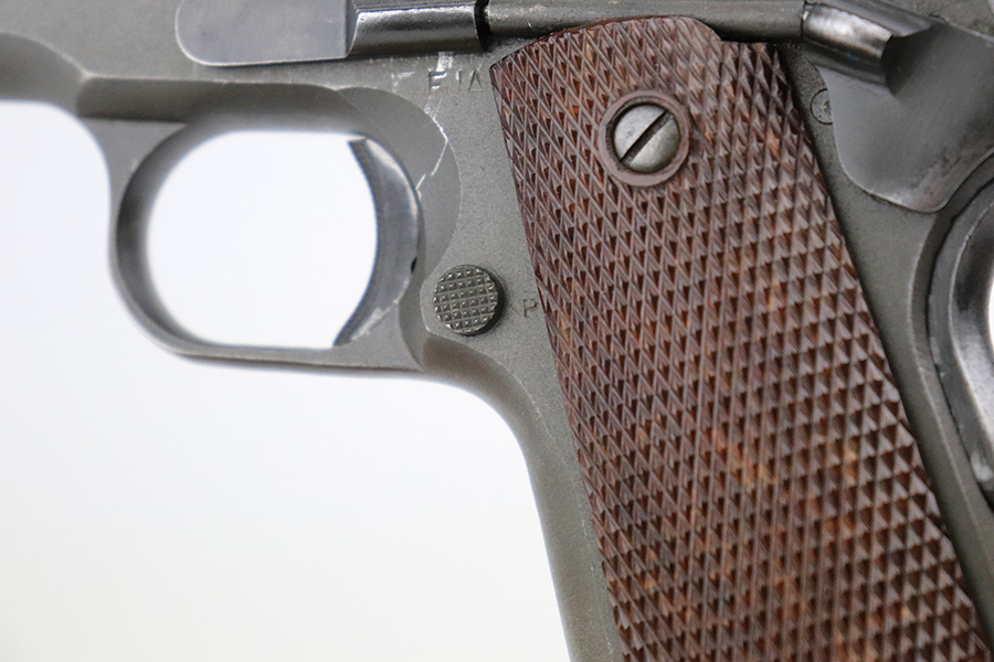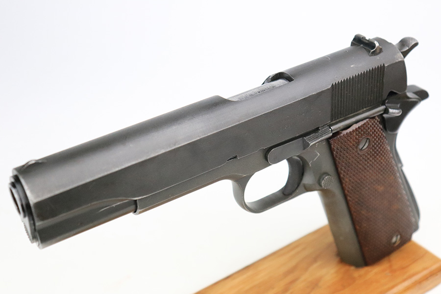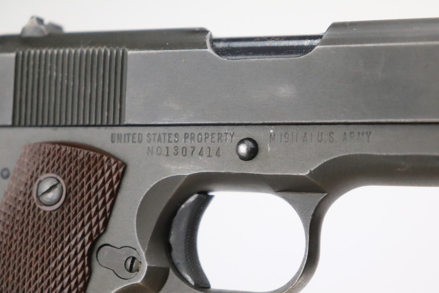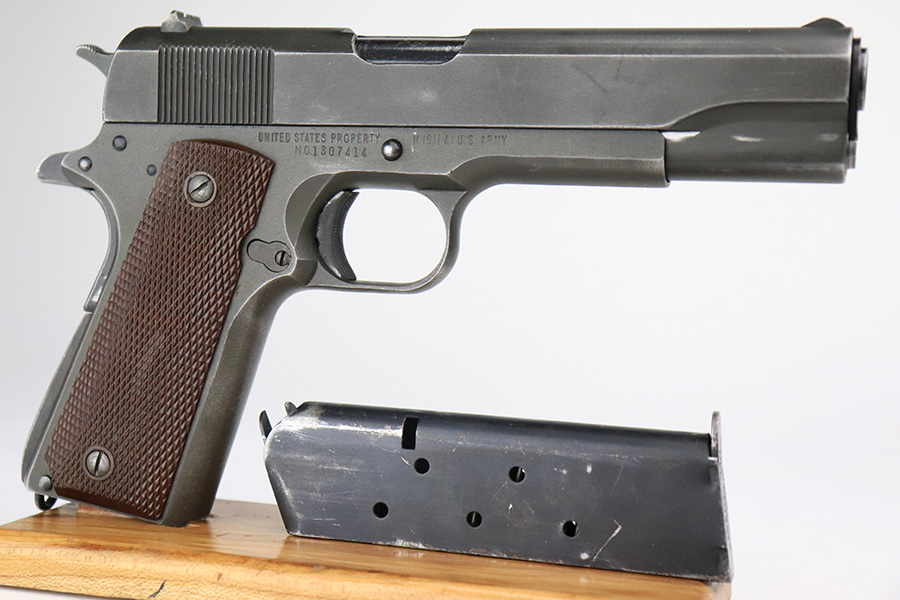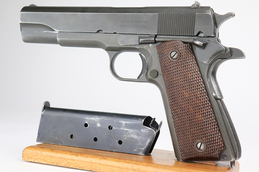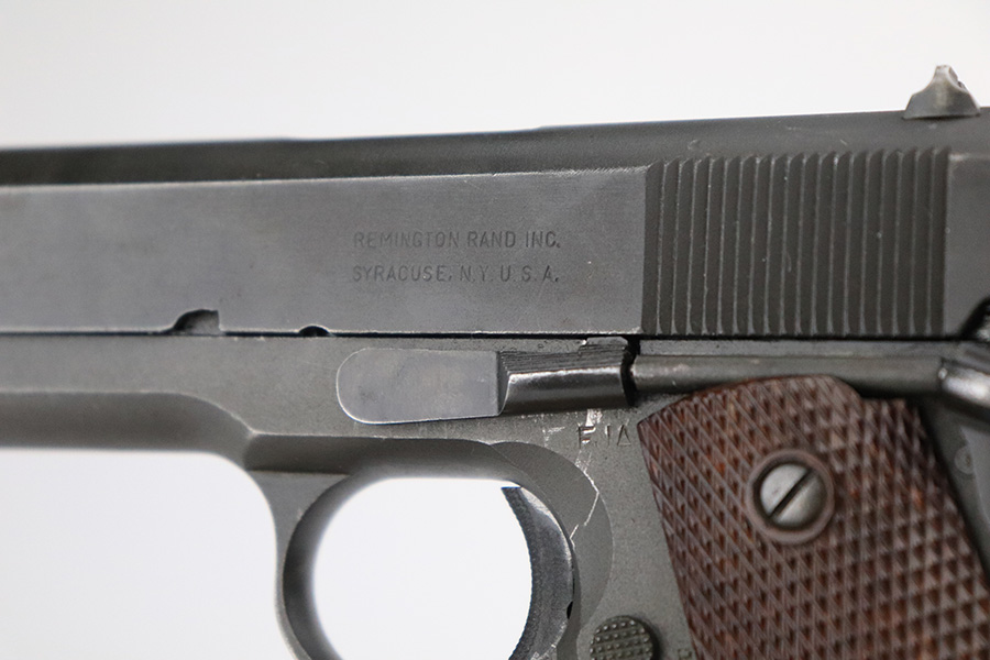 6/29/22 – This is a nice, original Remington Rand from late in 1943. Issued to the US Army with proper FJA inspector mark on frame. The original finish rates at about 85% with the vast majority of the wear on the front strap and grip safety. Proper HS barrel with minty bore. Nice grips with only minor smoothing. Postwar magazine.