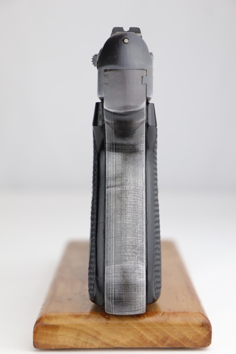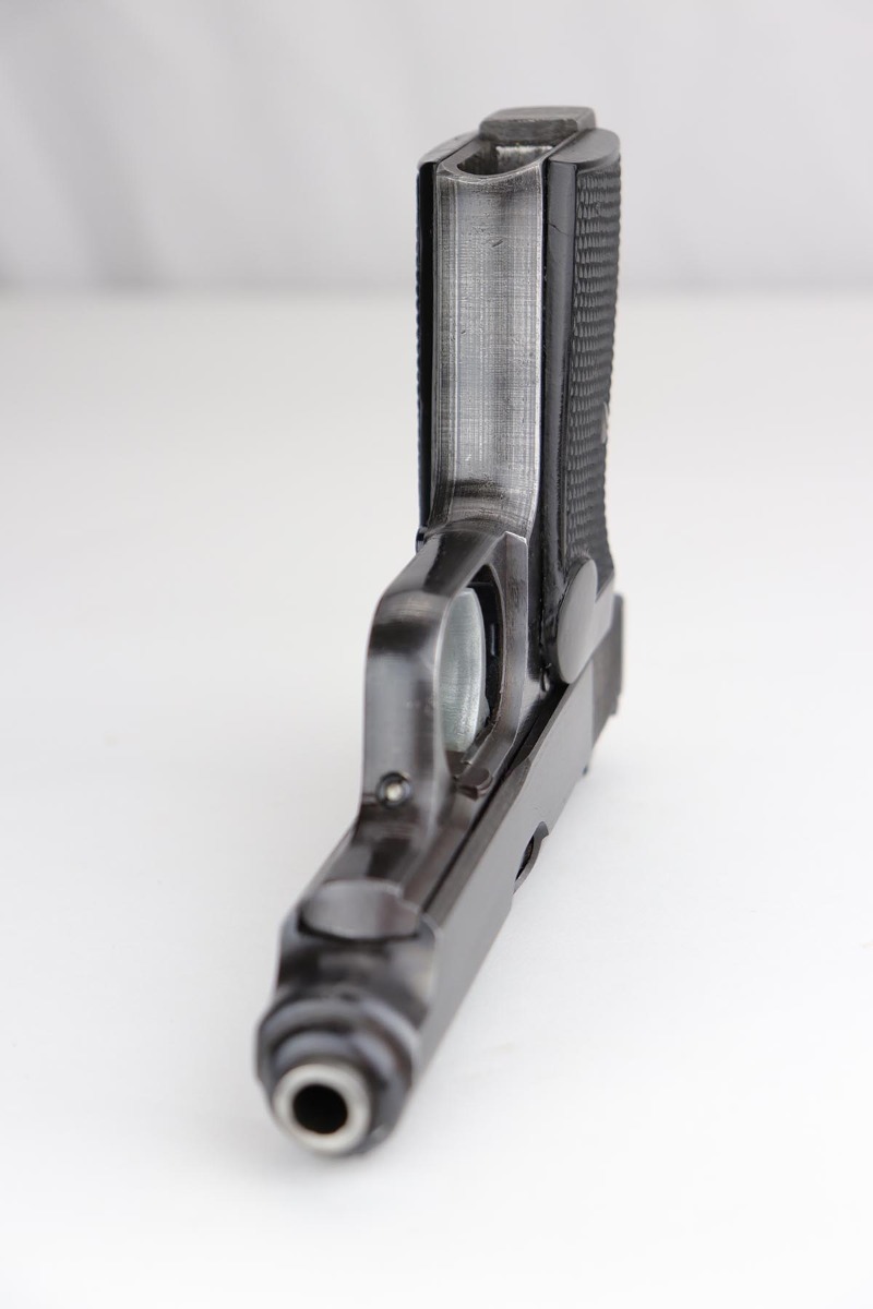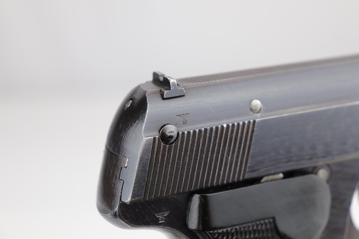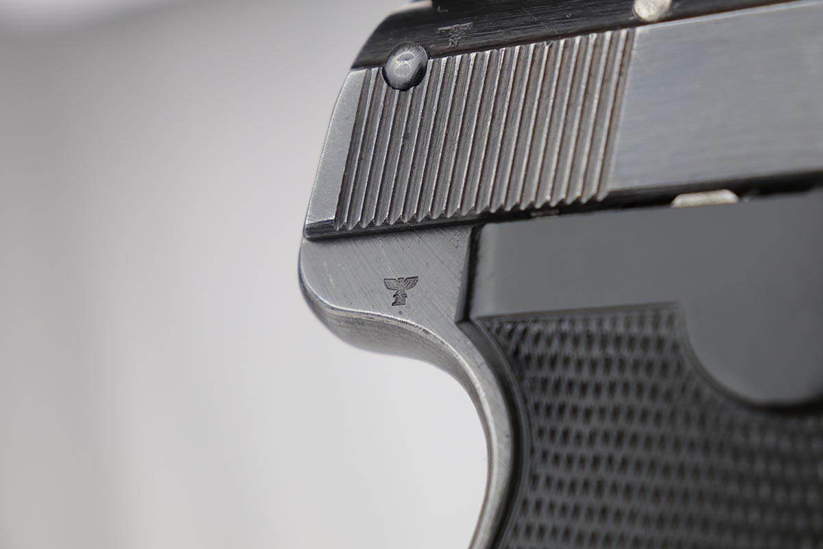 10/16/19 – This is an all original and correct Sauer 38h that was issued to the Nazi military. It has an excellent profile view but notably thin straps. Excellent grips and bore. Half-moon magazine.