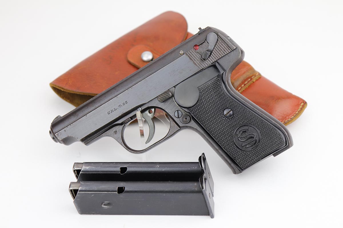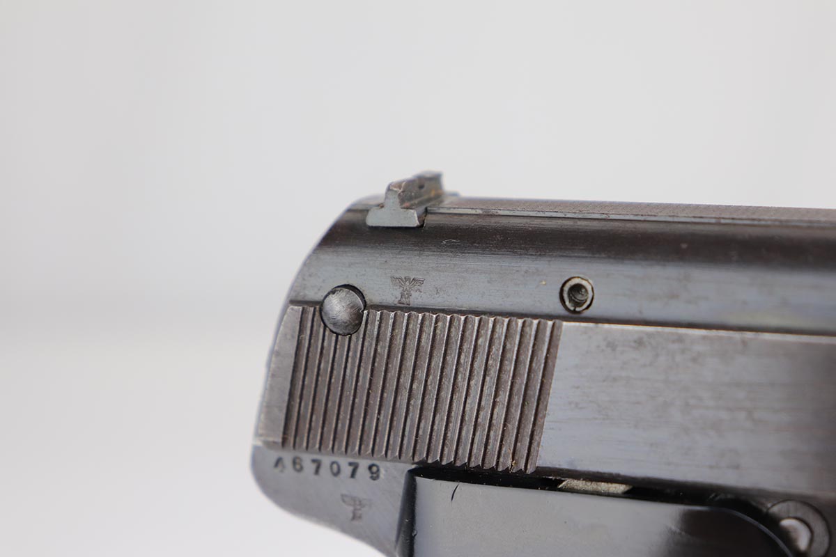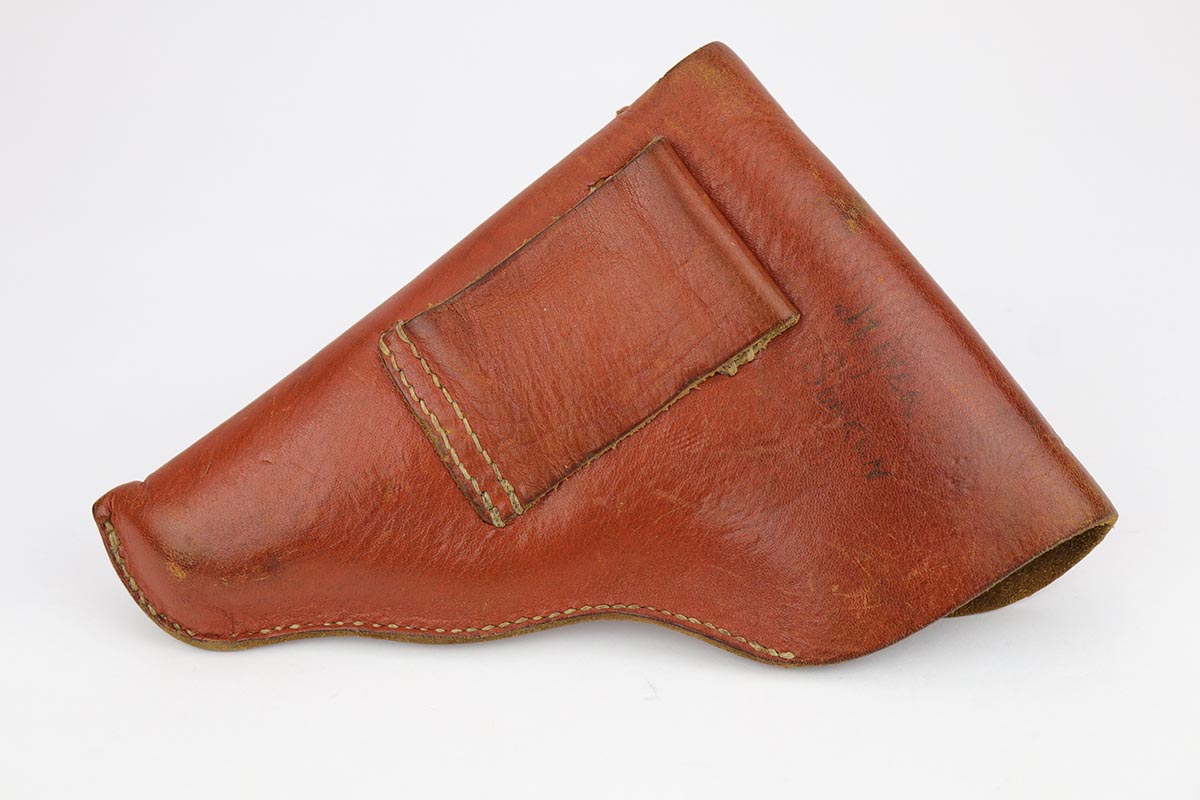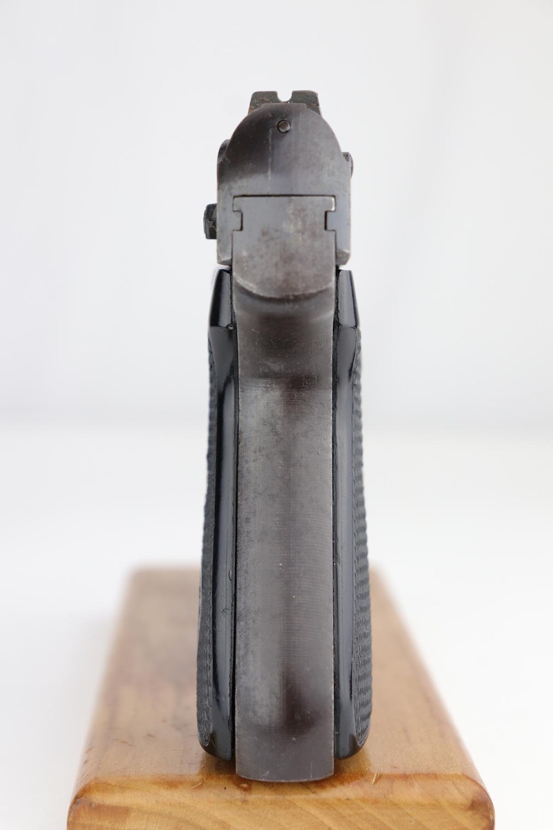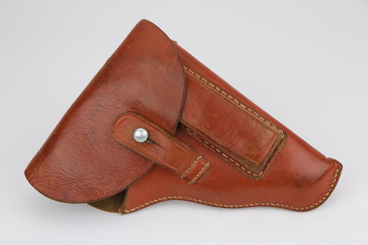 8/30/19 – This is a nice, complete Sauer 38h rig that was issued to the German Army during World War II. The original military blue rates at 96-97%, as there is only minor thinning in some areas, but there is some oxidation and freckling in multiple areas. Excellent grips, with just a minor patch of smoothing on the right side panel. Two correct magazines in excellent condition. Unmarked, period original holster, though it does have the name of the GI written inside and out. Minty bore.