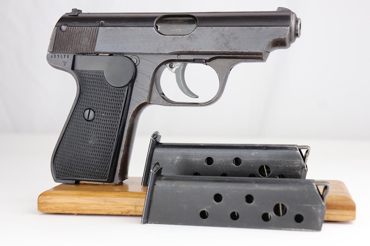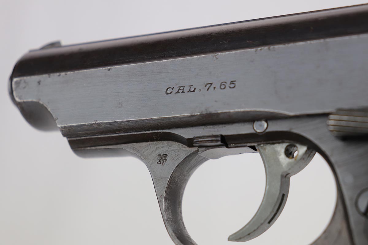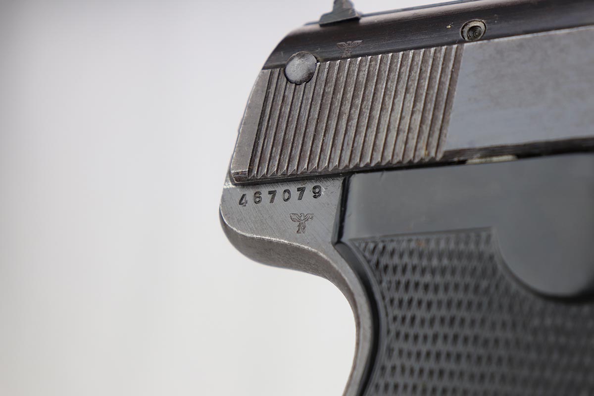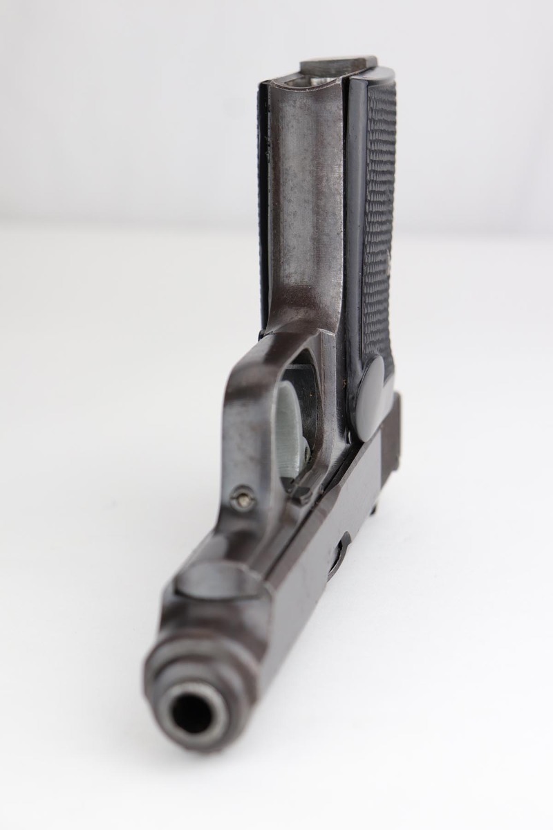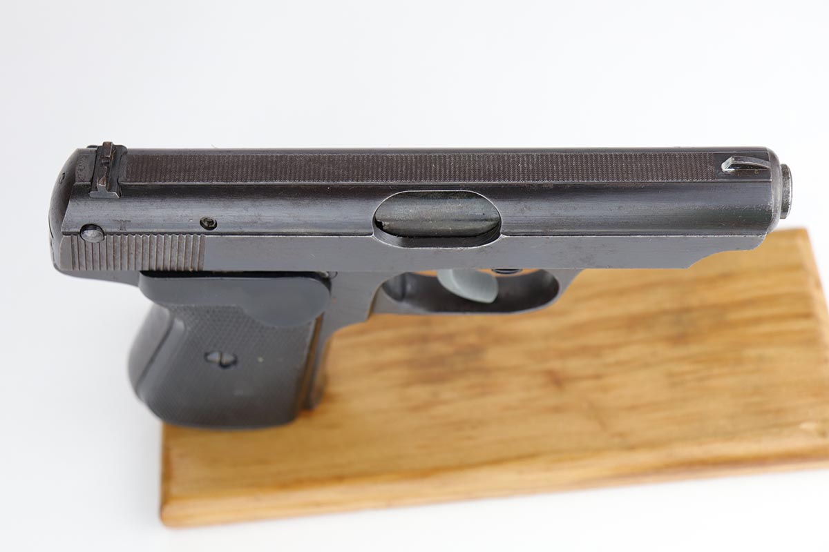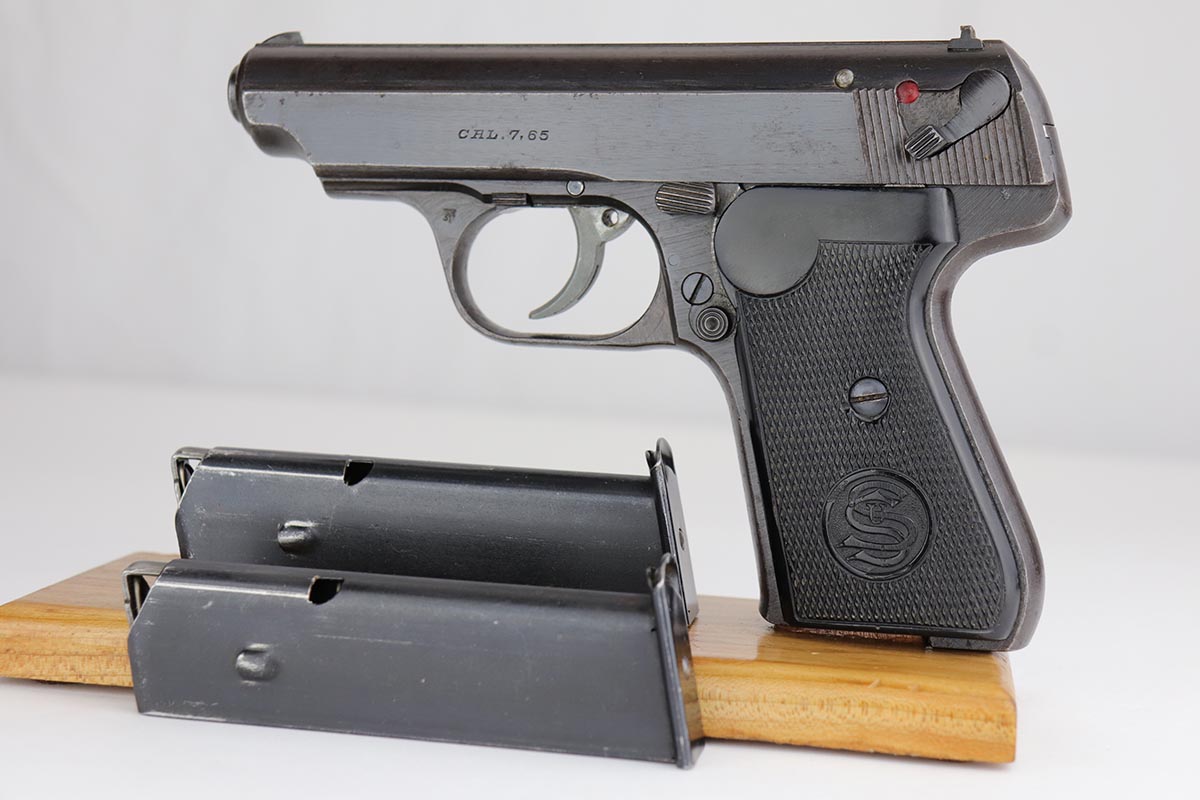 8/30/19 – This is a nice, complete Sauer 38h rig that was issued to the German Army during World War II. The original military blue rates at 96-97%, as there is only minor thinning in some areas, but there is some oxidation and freckling in multiple areas. Excellent grips, with just a minor patch of smoothing on the right side panel. Two correct magazines in excellent condition. Unmarked, period original holster, though it does have the name of the GI written inside and out. Minty bore.