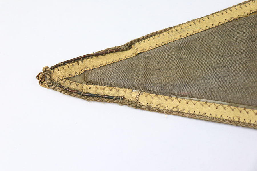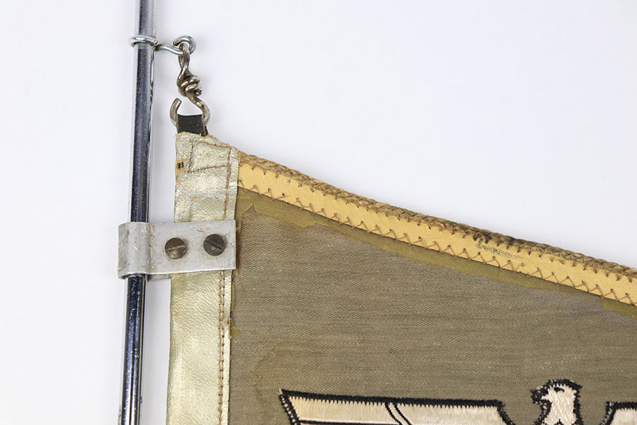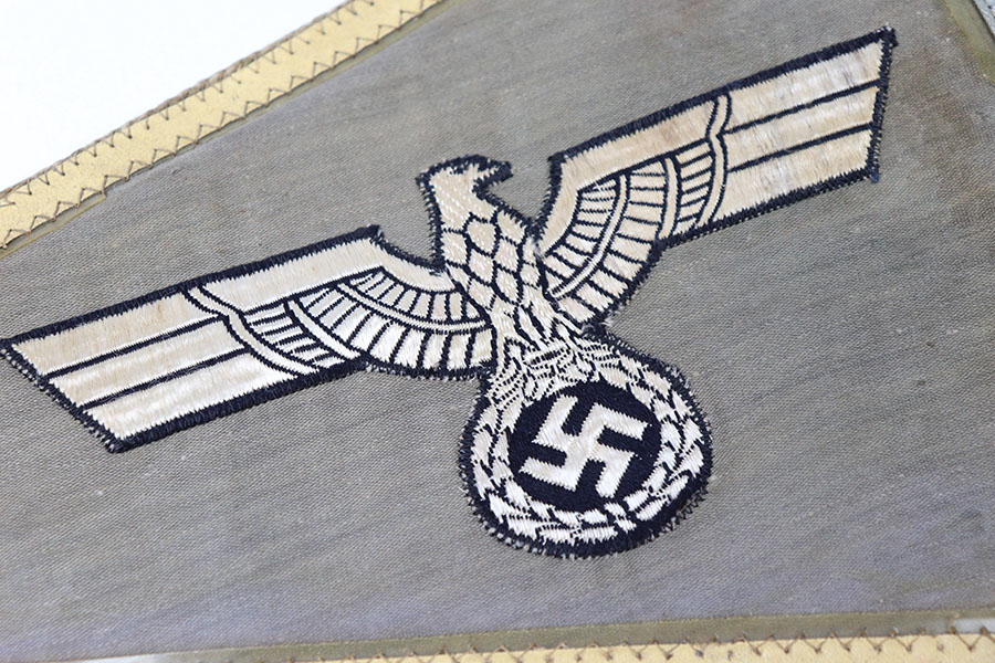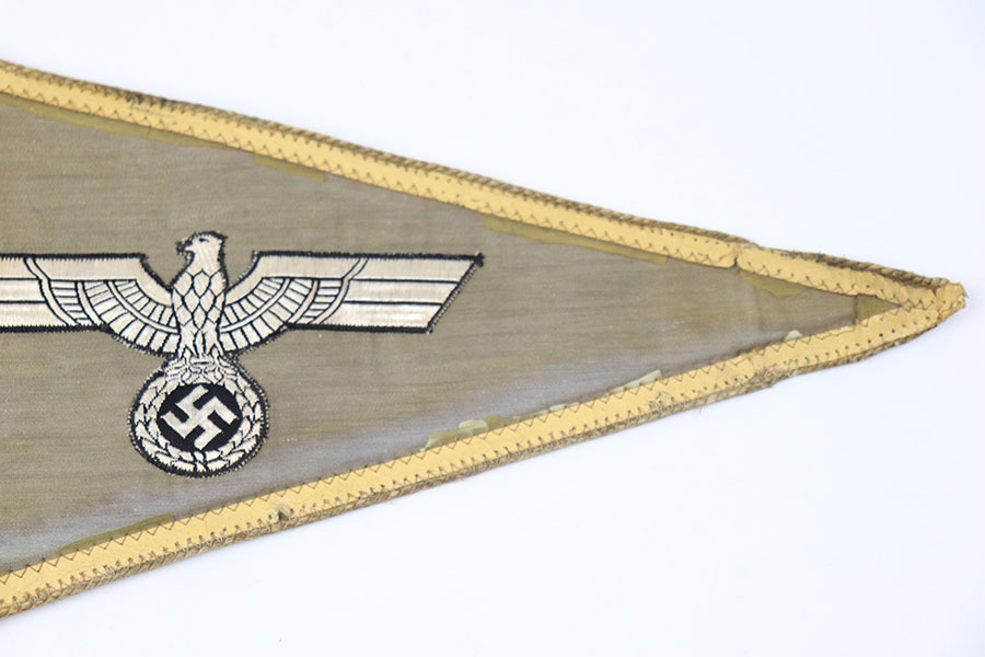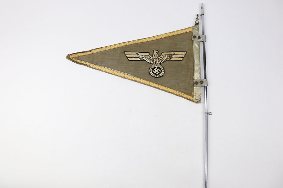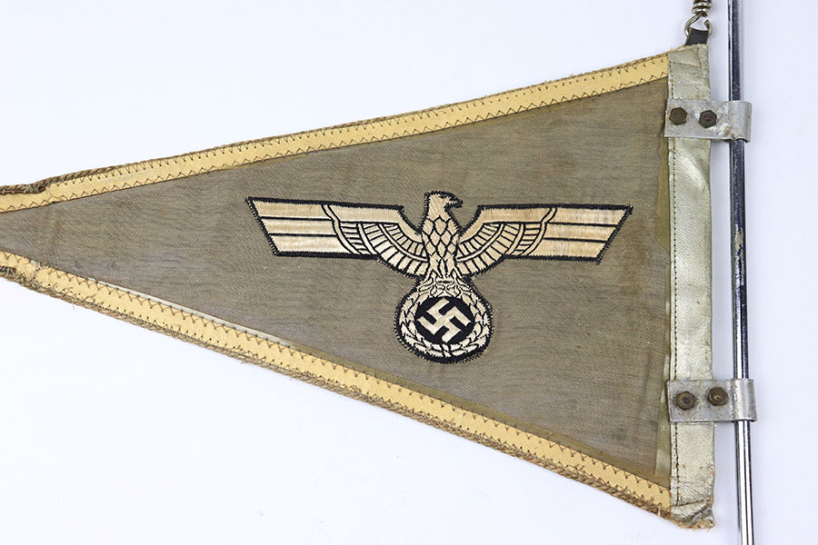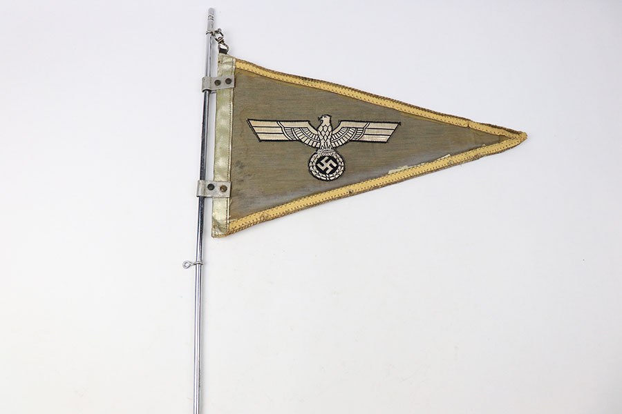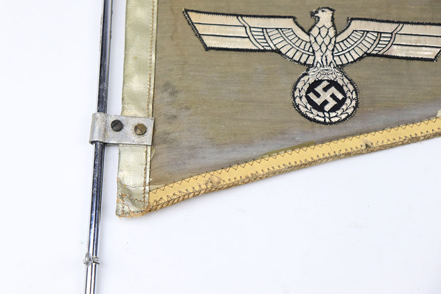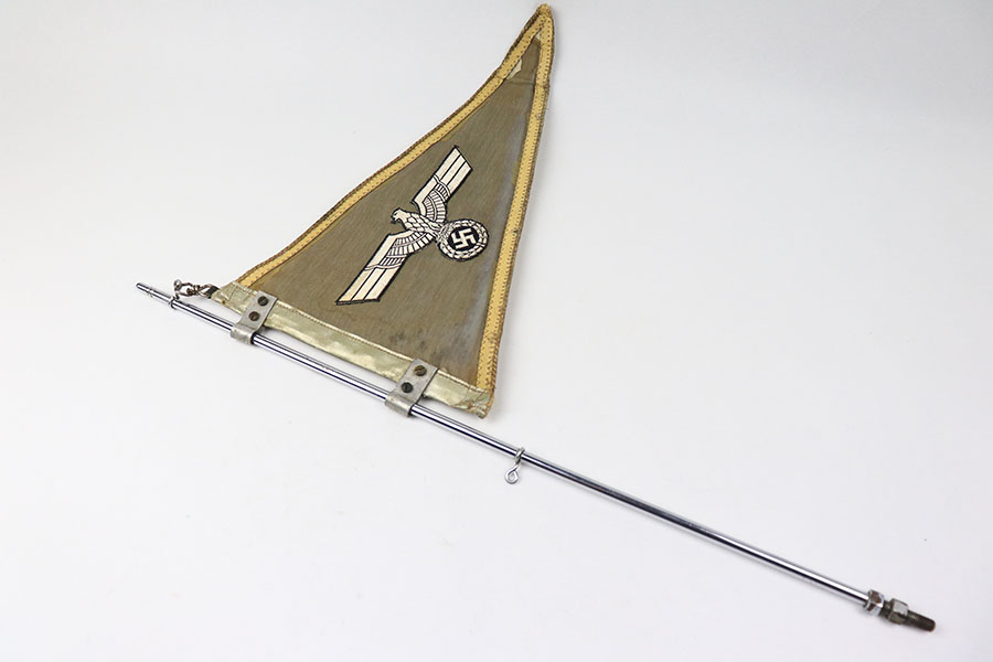 8/3/21 – This is a Nazi Army Pennant flag from WW2. Likely a vehicle pennant flag. Comes with the original pole, as shown. The pole measures just under 20 inches tall. The flag is 12.5 inches long (wide). There appears to have once been a clear plastic cover over the cloth material, but that’s almost completely gone now. The cloth is faded and lightly discolored throughout but in great overall condition. No major stitching issues along the outer edge.