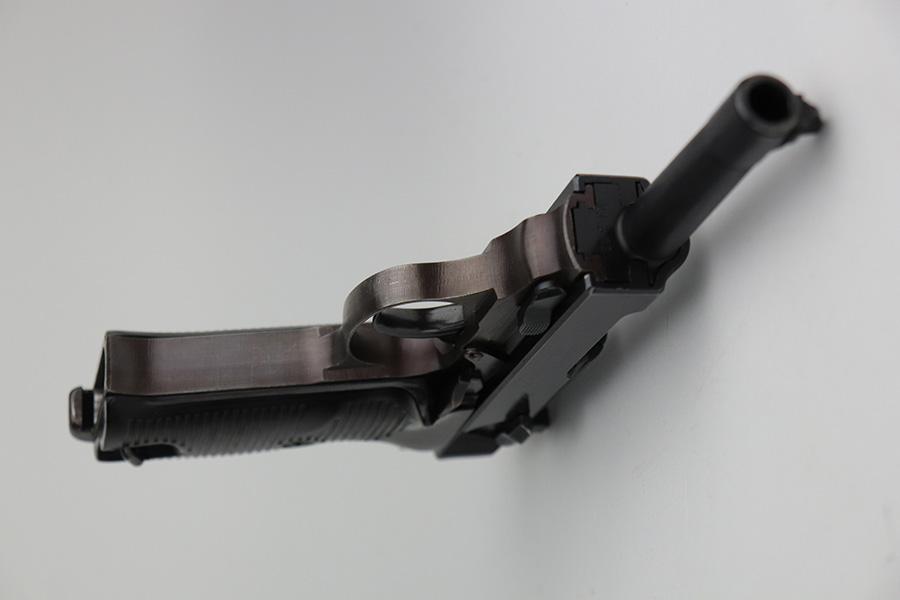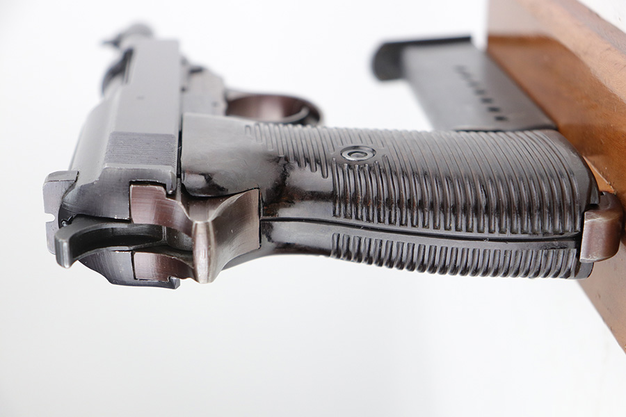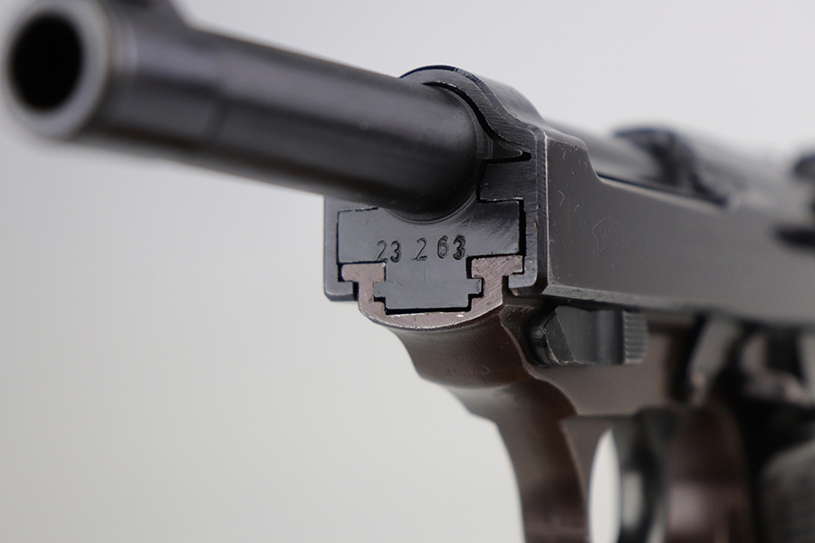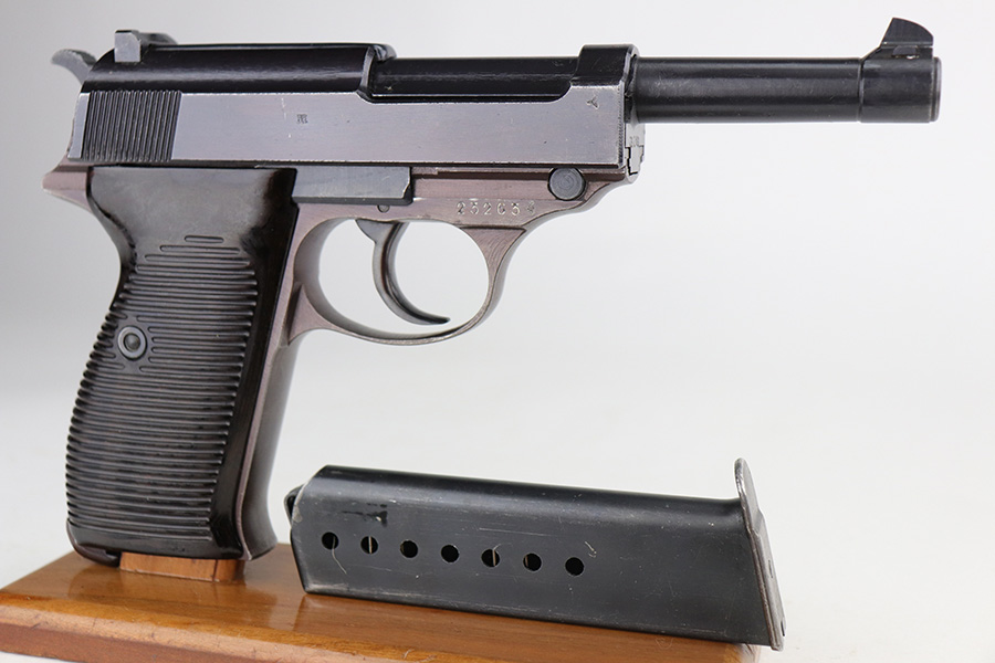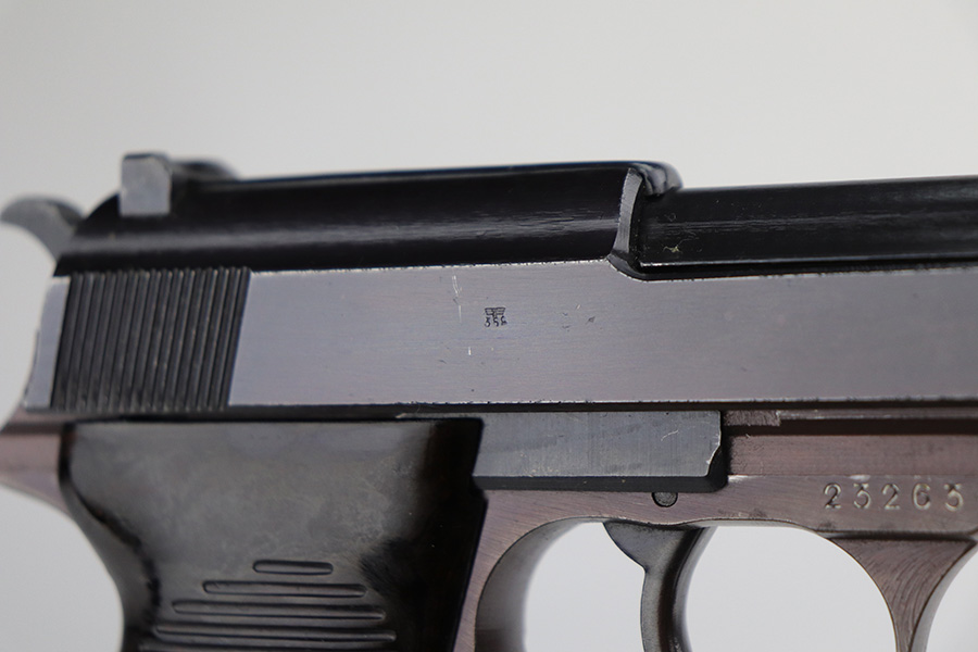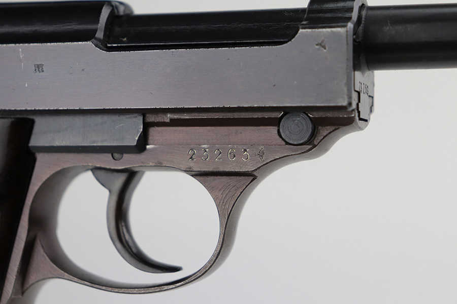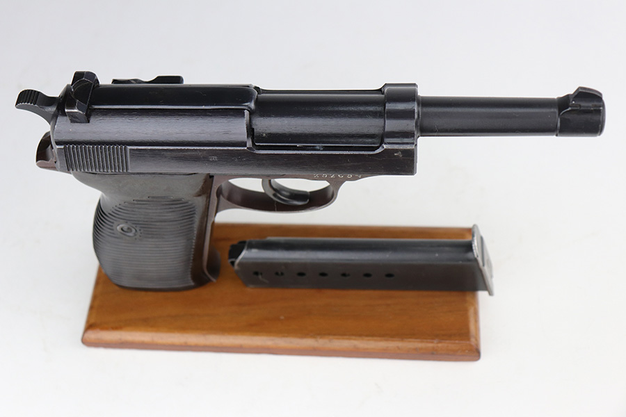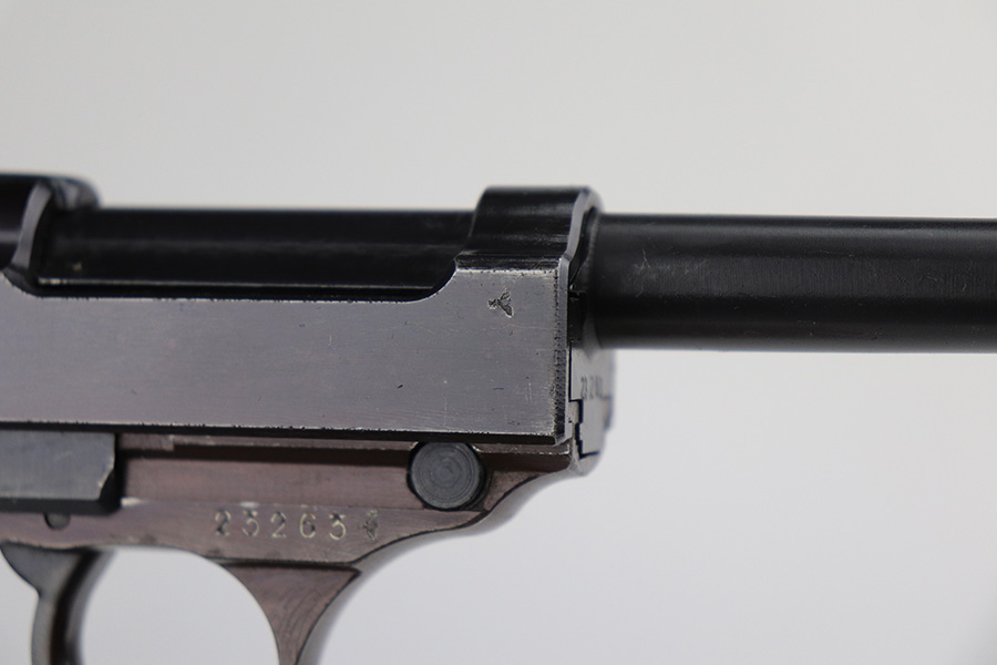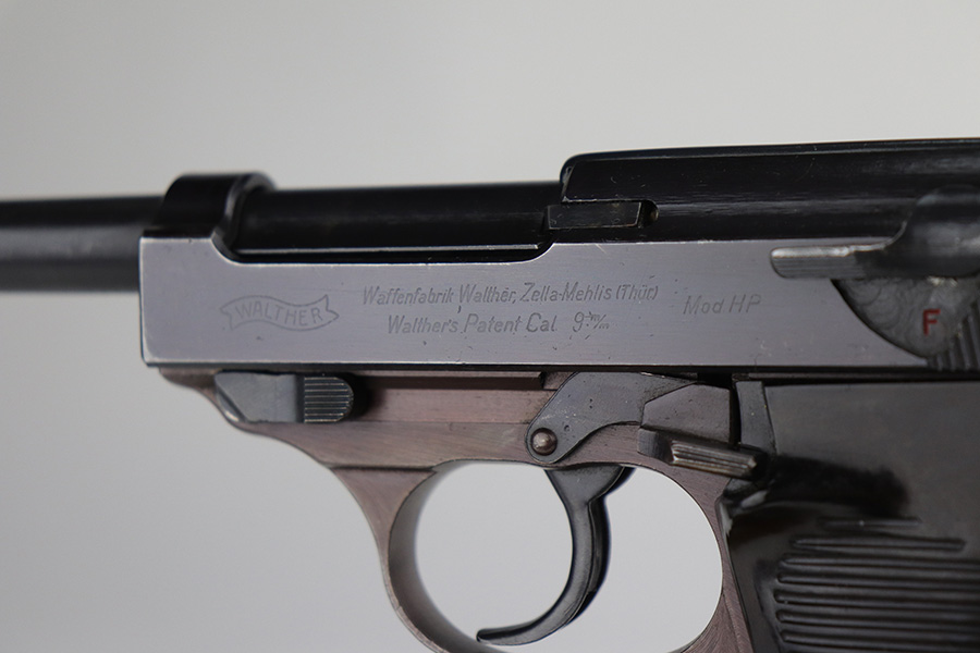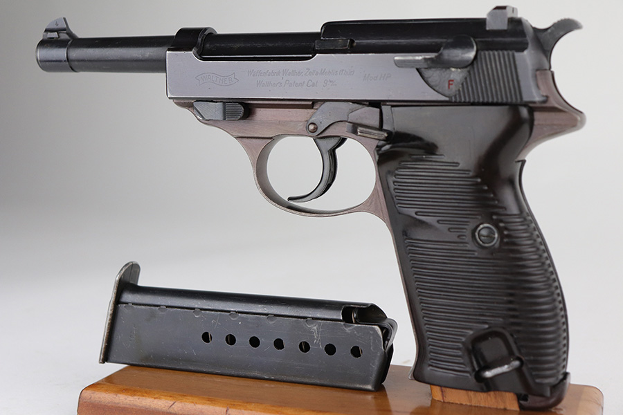 8/24/21 – This is a rare Walther Mod HP that was issued to the German Wehrmacht in 1942-43. All matching and original and in excellent condition. Both slide and frame have a little bit of a plum tone, and just minor high edge wear and a little dulling of the color on the frame. Military inspection mark on right side of slide. Matching numbers throughout. One of only 2,800 such pistols produced with dull military blued finish. Minty brown grips and a mint bore. Walther magazine.