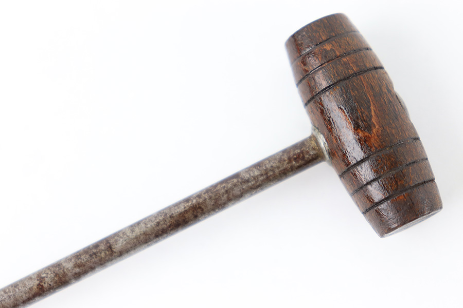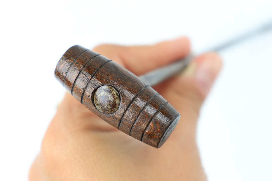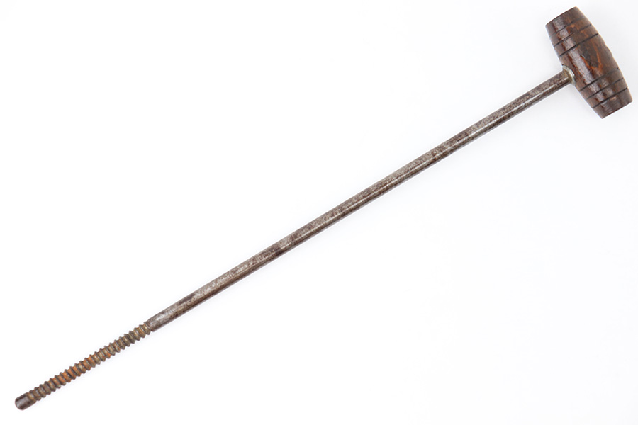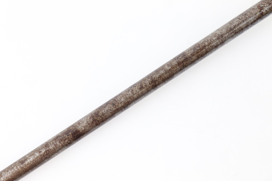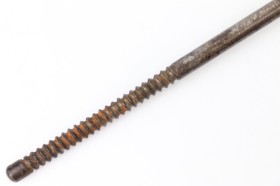 8/15/23 – This is an original WW1 era production Artillery Luger cleaning rod. The cleaning rod measures 25.1cm long (just under 10in) and is in great overall condition. The rod has light surface patina and dark discoloration throughout, as well as some mild rust in the grooves at the base. The top of the rod has the original wood handle, which swivels on a ball socket. No cracks or chips in the wood.