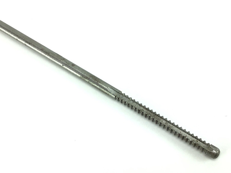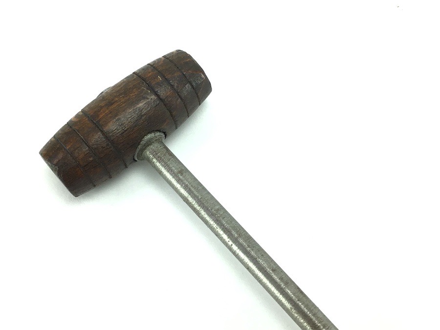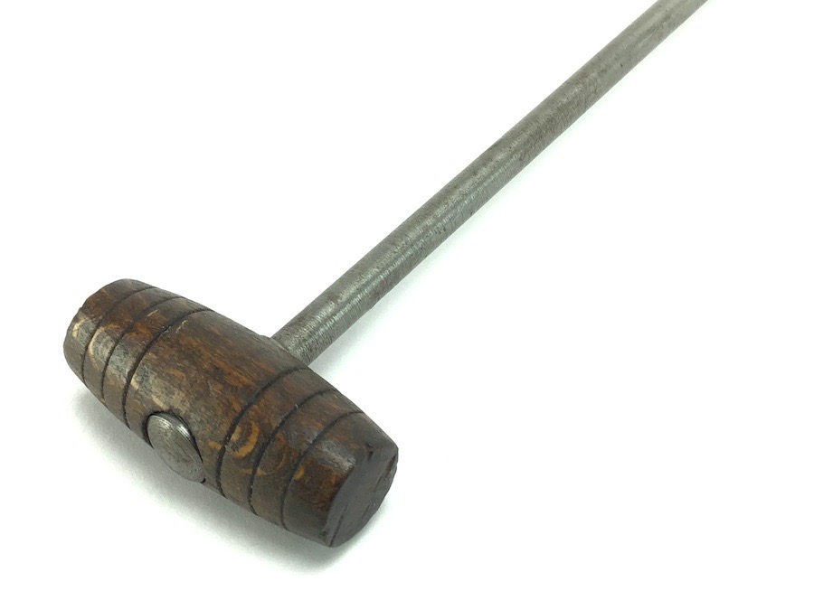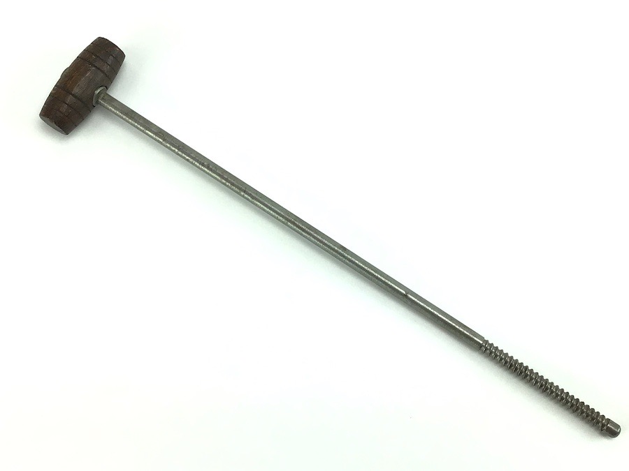 6/10/24 – This is an original WW1 era production Artillery Luger cleaning rod. The rod is in great condition. The rod shows some minor surface patina, but is mostly clean throughout. The wood handle rotates freely on a ball socket, and has no cracks or chips.