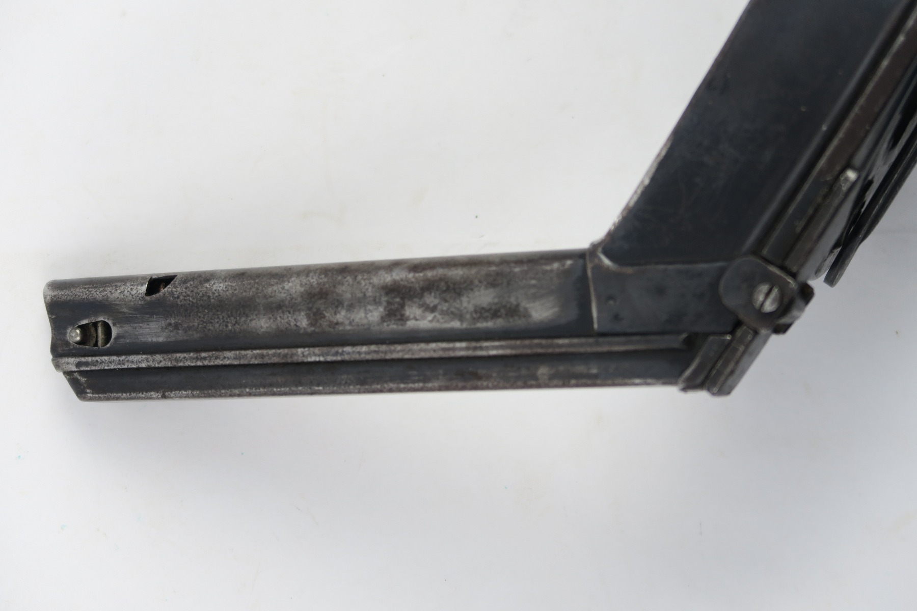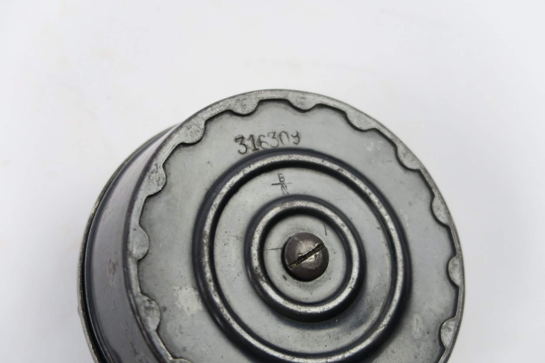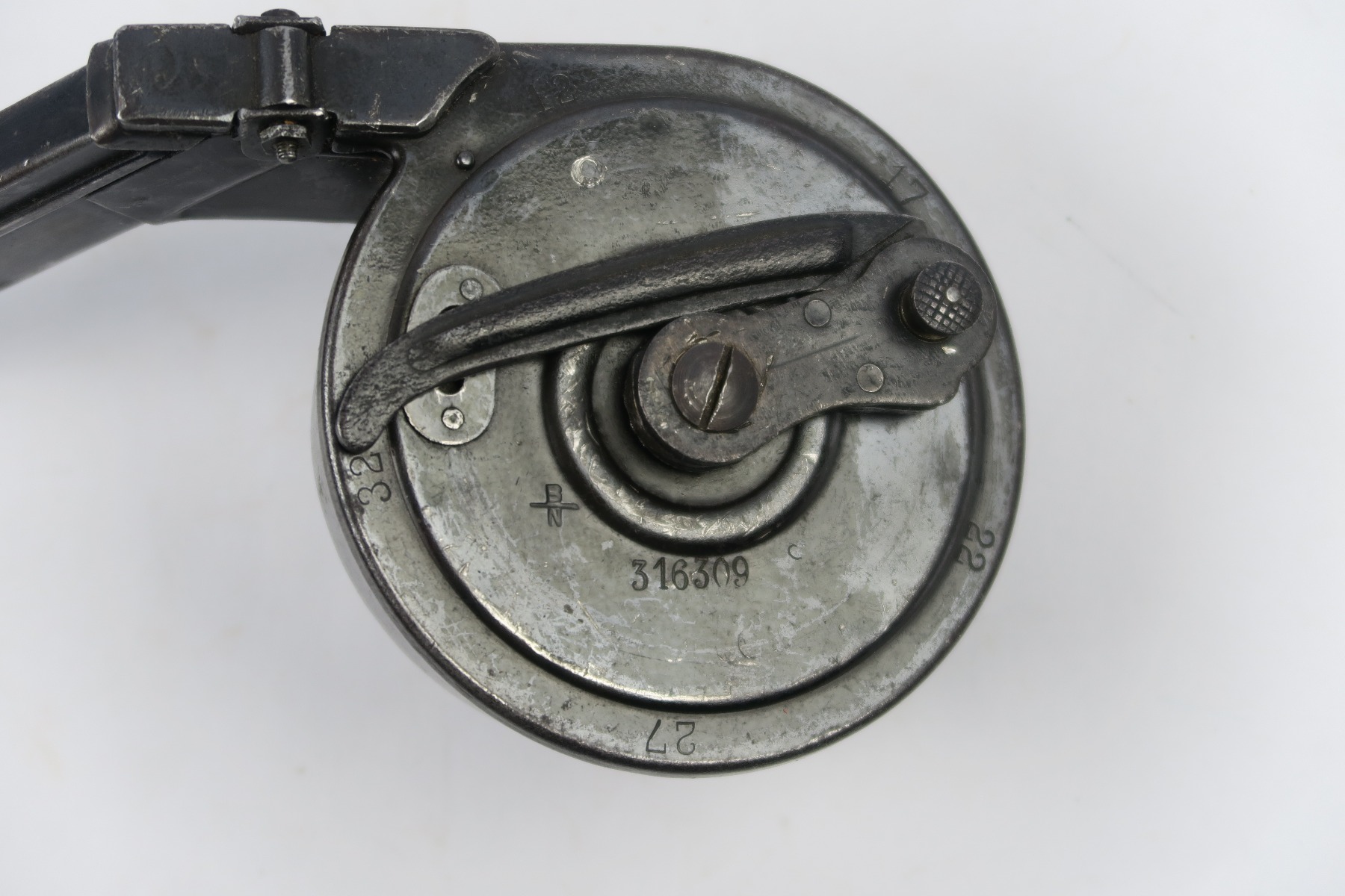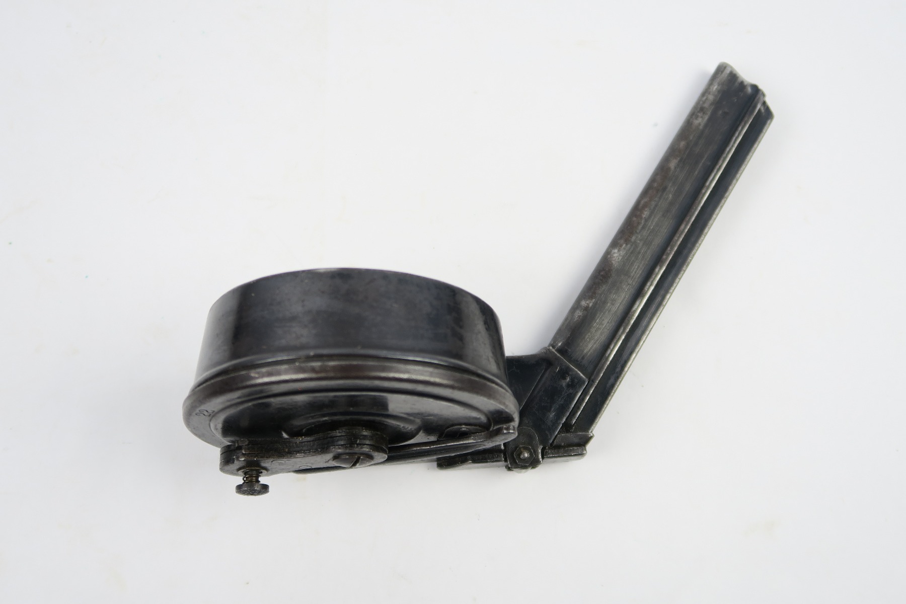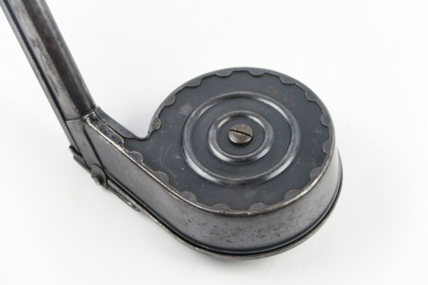 2/28/18 – This is an original WW1 era production snail drum artillery Luger magazine. The magazine is “B/N” maker stamped and serial numbered 316309. The finish is all original but there is patina and thinning of the blued finish throughout. The spring is strong and fully functional though, and the magazine winds smoothly with no issues. Guaranteed original and authentic. Also fits 9mm WW1 & WW2 era German submachine guns.