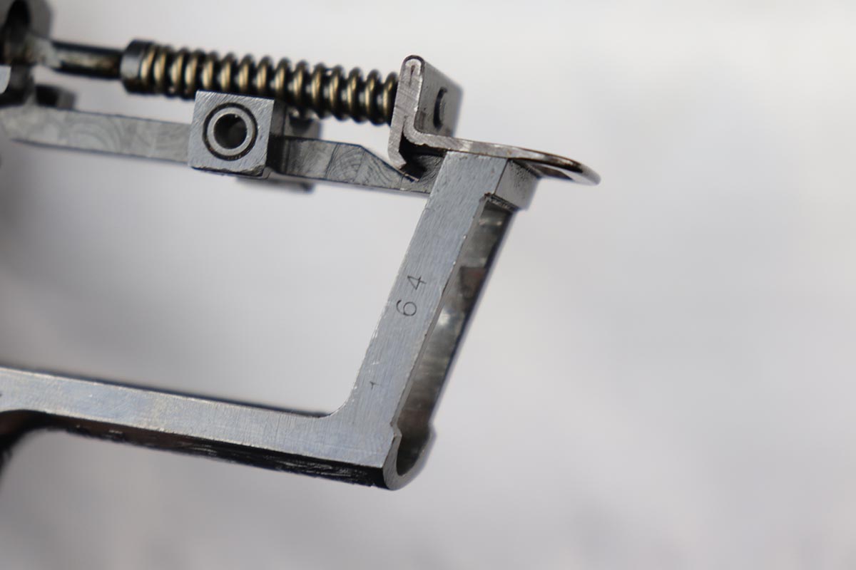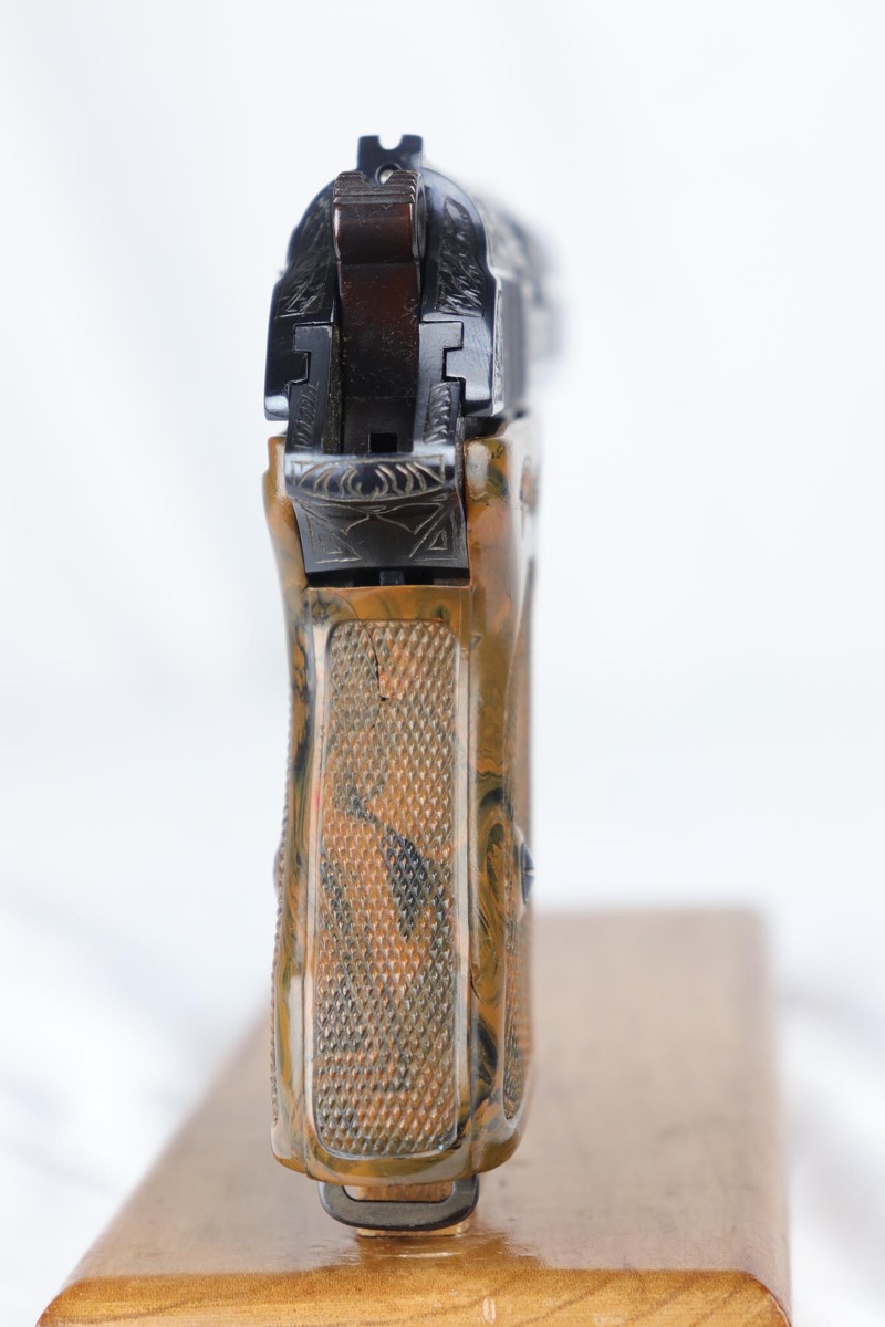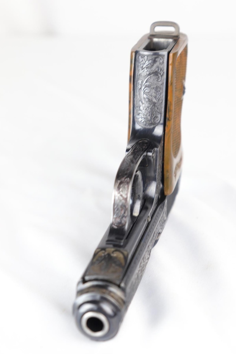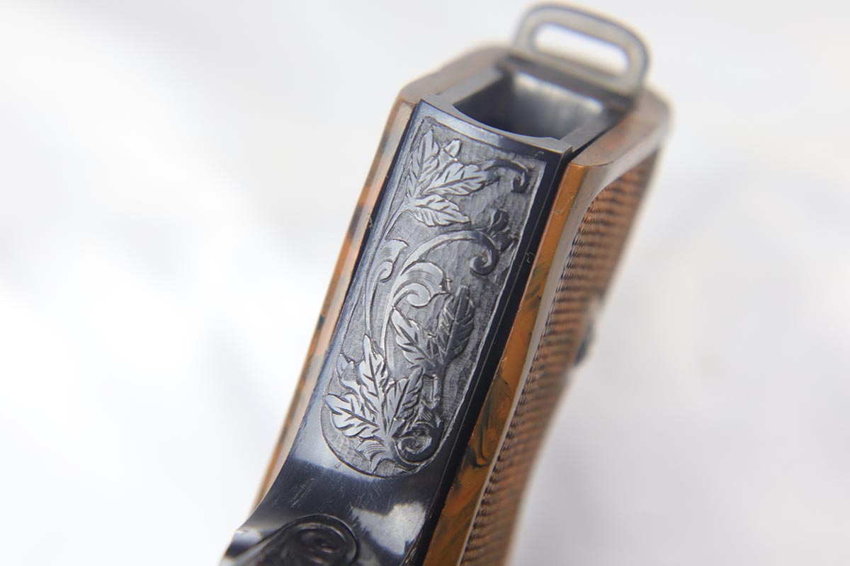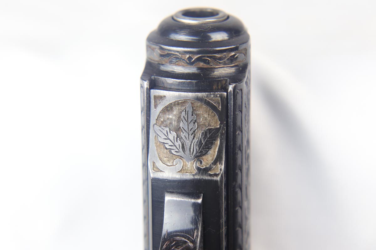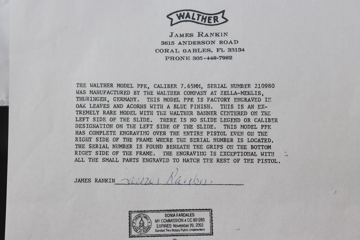 9/25/18 – This is an exceptionally beautiful and rare Walther PPK that was manufactured and factory engraved in 1939 at the the Zella-Mehlis factory. This is an extremely rare model with Walther banner centered on left side slide and serial number located on the frame, beneath the grip. There is no slide legend or caliber designation as the entire pistol is engraved, including the trigger, safety and even the head of the grip screw. This pistol is engraved with oak leaves and acorns and has a near-mint, original blued finish. The pistol is accompanied by a signed Rankin letter.