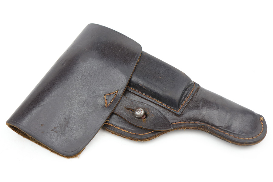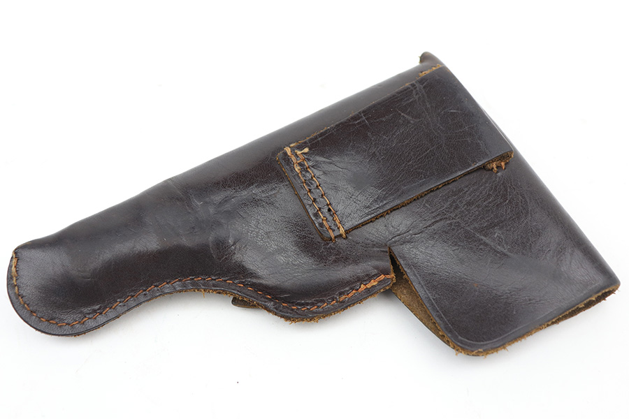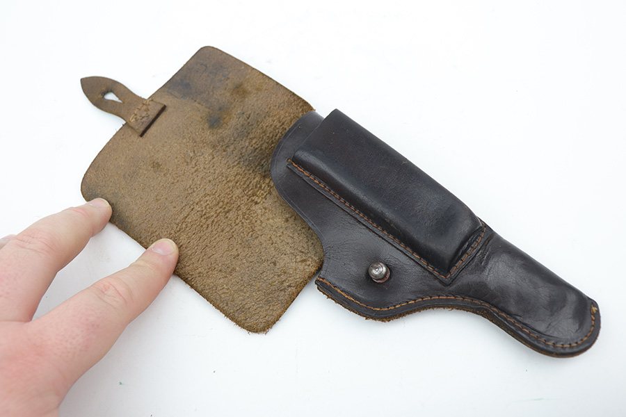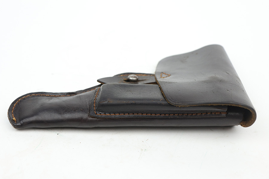 10/11/21 – This is an original Astra 300 holster from WW2. The holster has a very faint, barely visible ink stamp on the top right corner of the interior leather. This appears to be a Nazi eagle logo and likely another ink stamp underneath that, but we cannot decipher this. The leather is in great condition, as is all the original stitching.
