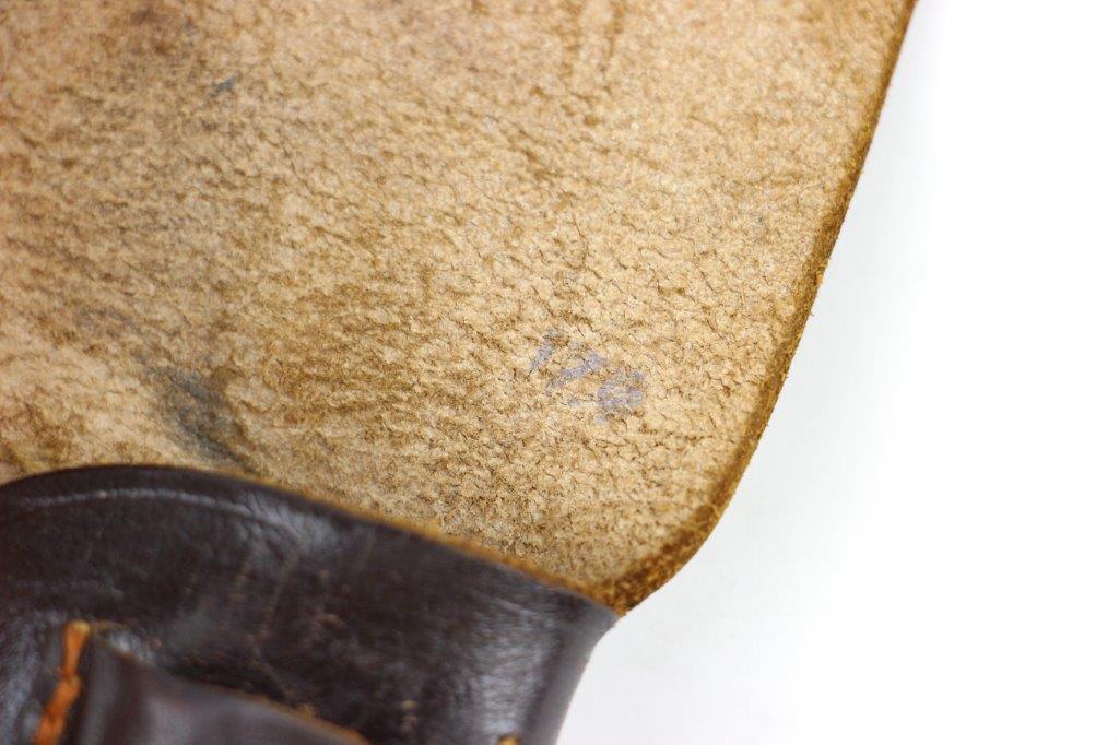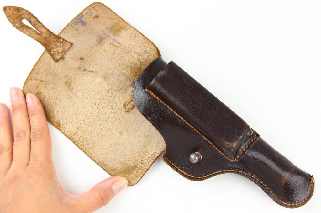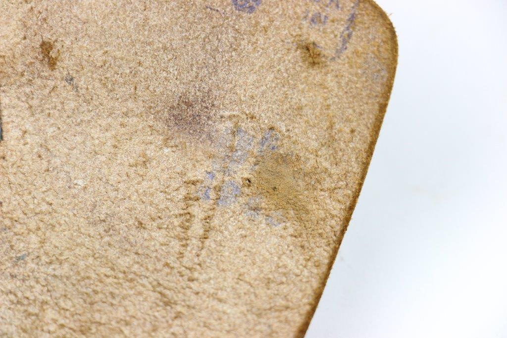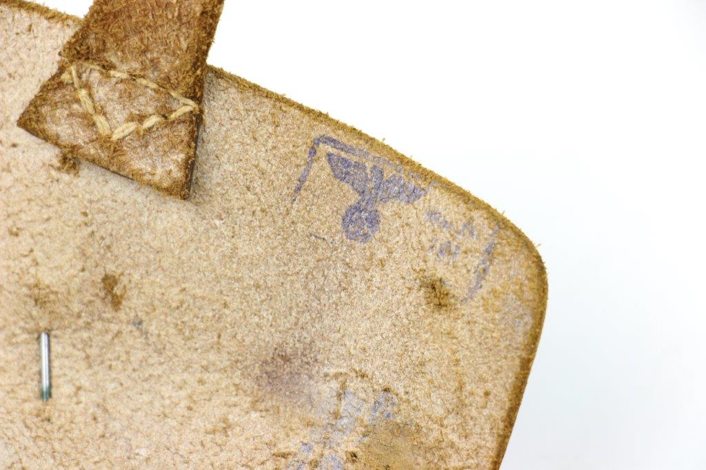 5/25/24 – This is an original WW2 production Astra 300 holster. The holster is in great overall condition with natural use wear and an added pin “embellishment” from 1938. The pin is slightly bent, but the backside clasp is still functional and the pin can be easily removed if desired. The front leather has 3 more small pin holes – likely from prior pip embellishments that are no longer present. Besides this the leather shows an outlined shape from having held a pistol for some time. Nice, honest wear with natural pliability but clean leather overall. All original, tight stitching intact. One loose stitch on the lower belt loop but this doesn’t affect function and the belt loop is secure. The interior leather is ink stamped with a Nazi proof, as shown.
