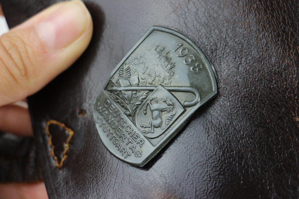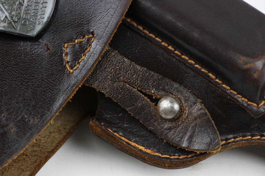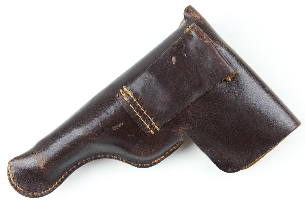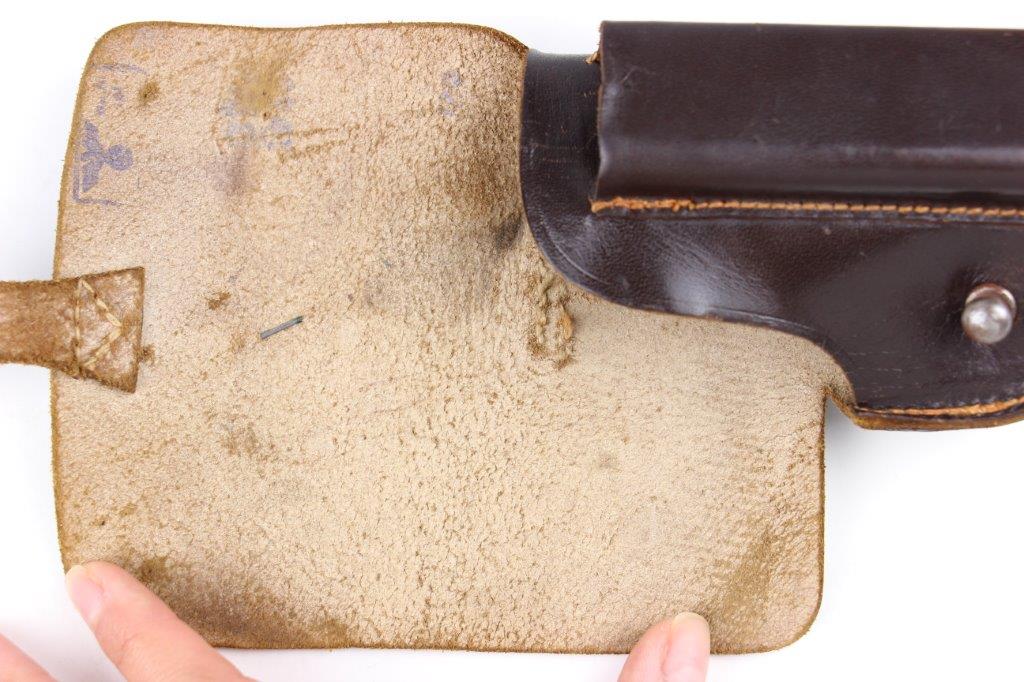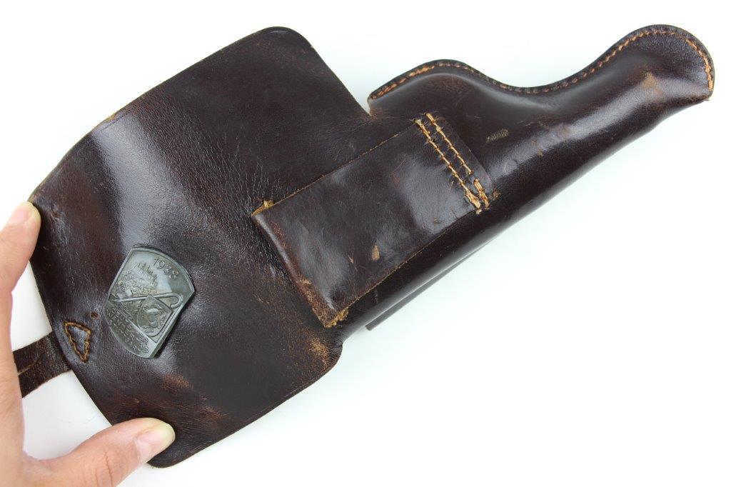 5/25/24 – This is an original WW2 production Astra 300 holster. The holster is in great overall condition with natural use wear and an added pin “embellishment” from 1938. The pin is slightly bent, but the backside clasp is still functional and the pin can be easily removed if desired. The front leather has 3 more small pin holes – likely from prior pip embellishments that are no longer present. Besides this the leather shows an outlined shape from having held a pistol for some time. Nice, honest wear with natural pliability but clean leather overall. All original, tight stitching intact. One loose stitch on the lower belt loop but this doesn’t affect function and the belt loop is secure. The interior leather is ink stamped with a Nazi proof, as shown.