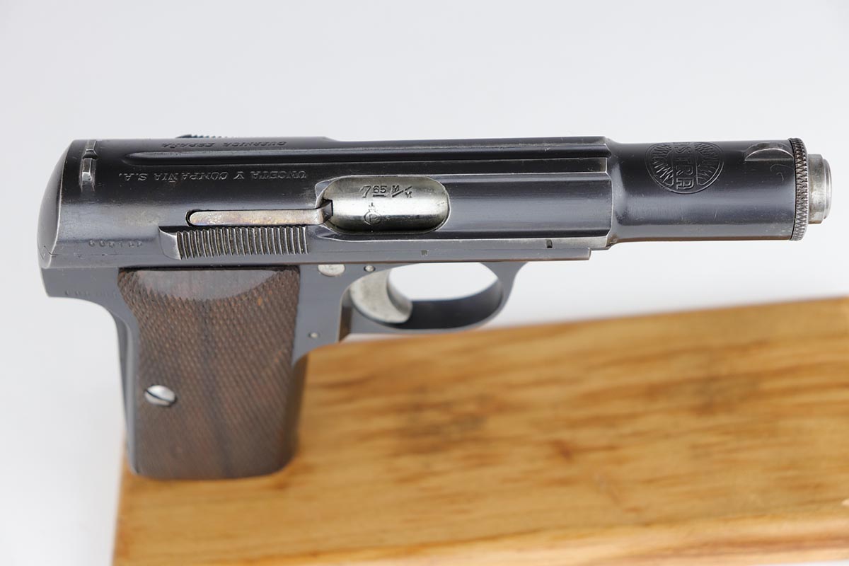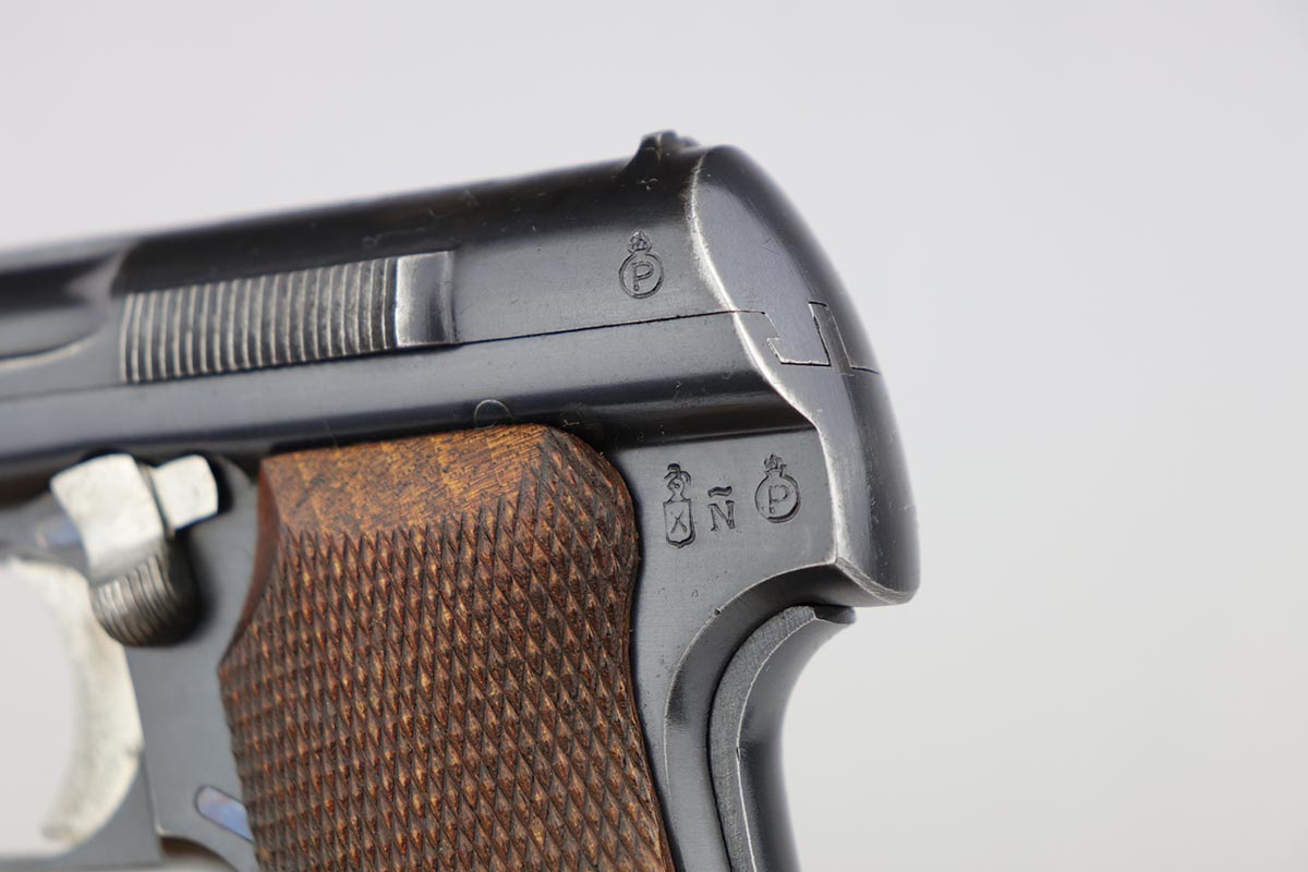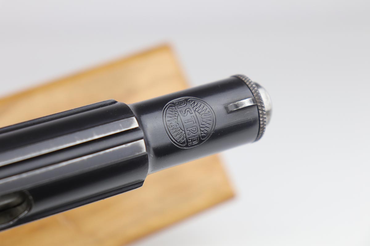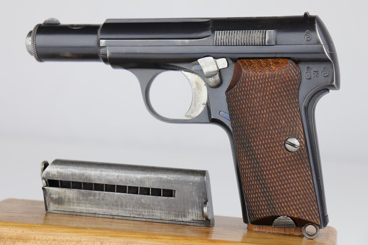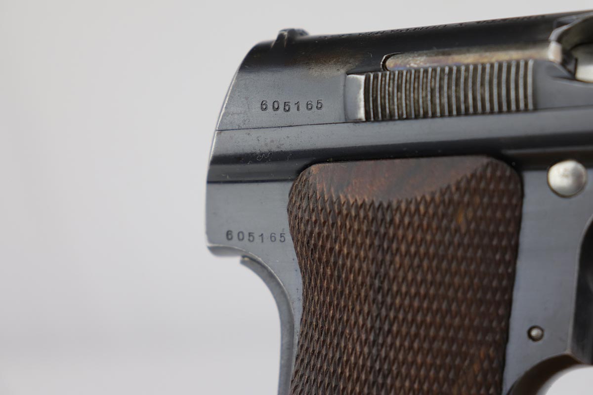 6/5/19 – This is a nice and original Astra 300 that was part of the second contract order by the Nazi Army. This pistol was part of a batch that was delivered on April 1, 1944. There were only ~22,000 of this variation produced, with no waffenamt on the frame and chambered in 7.65mm. The original finish rates at about 92-94%, with minor edge wear in a few areas, and a few stray areas of thinning. Excellent bore and grips.