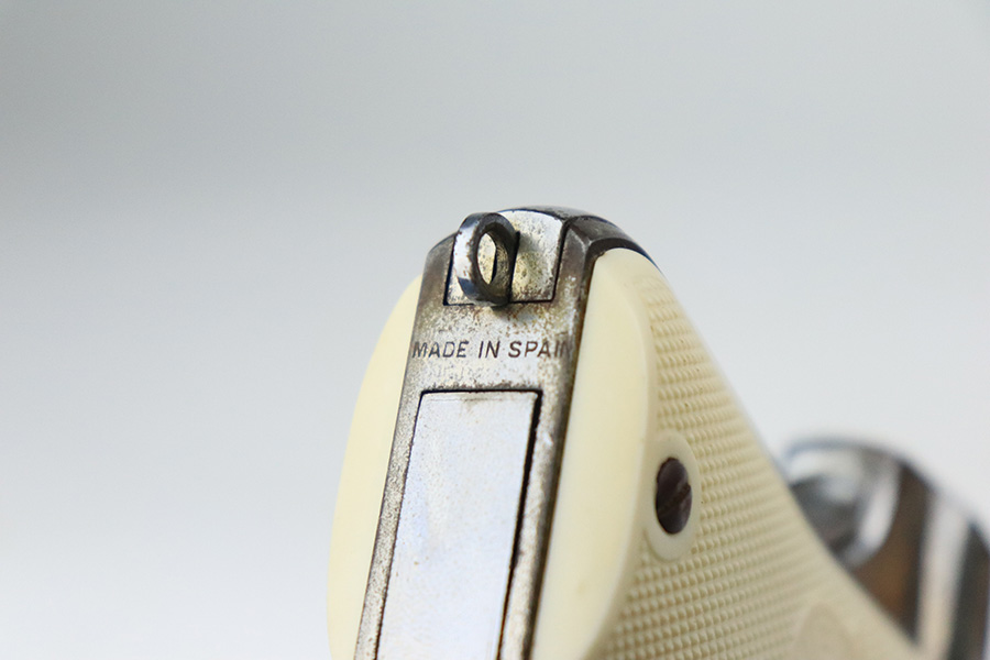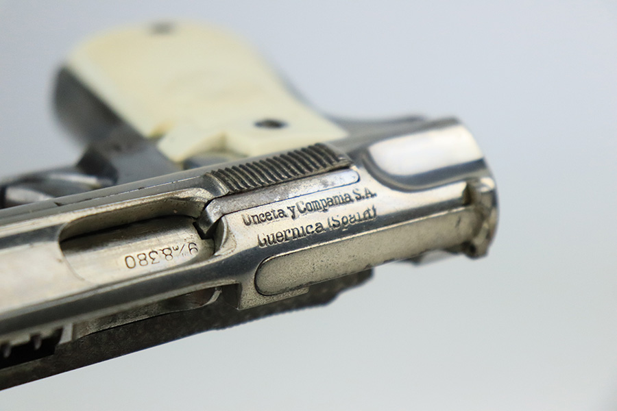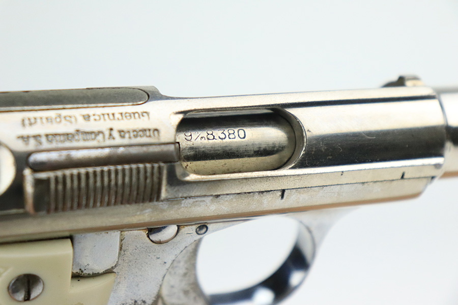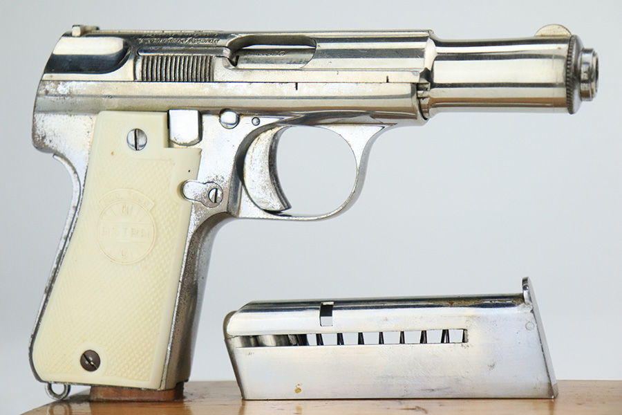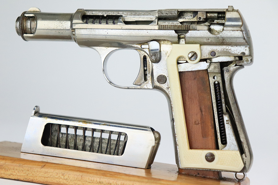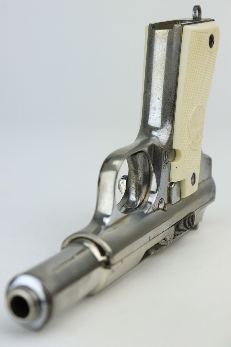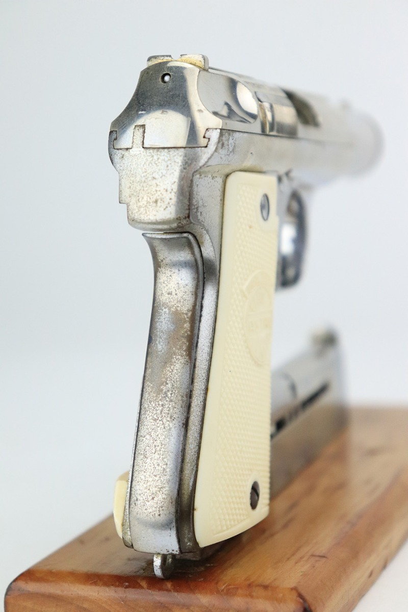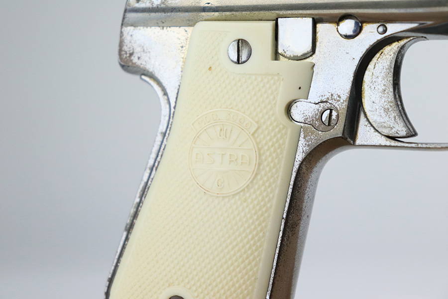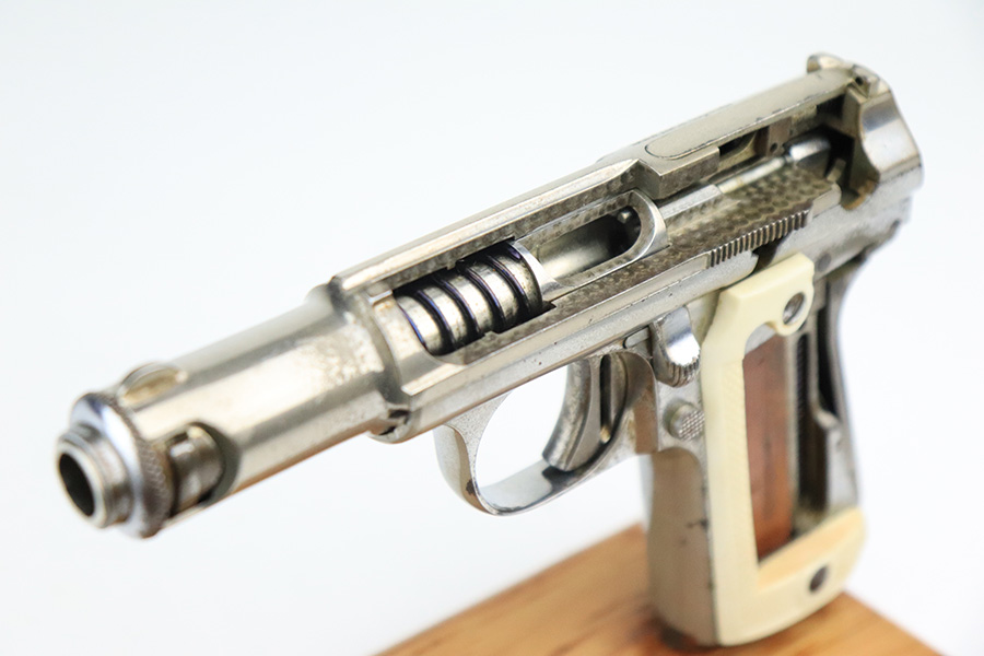 6/17/22 – This is a very nice example of a rare Spanish Astra Model 3000 Cutaway. There are several cutaways on the slide, chamber, frame, left grip, and magazine, revealing the intricate innerworkings of the pistol. Although the chamber has been cut and should render this pistol unable to be fired, we’ve logged this as a firearm to be on the safe side (it seems to function as a firearm should). Therefore, it will require an FFL. The gun has retained most of its nickel-plated finish. There are areas of chipping in the finish and spotty oxidation most noticeable on the frame and grip straps. Comes with two dummy cartridges. Mint bore.