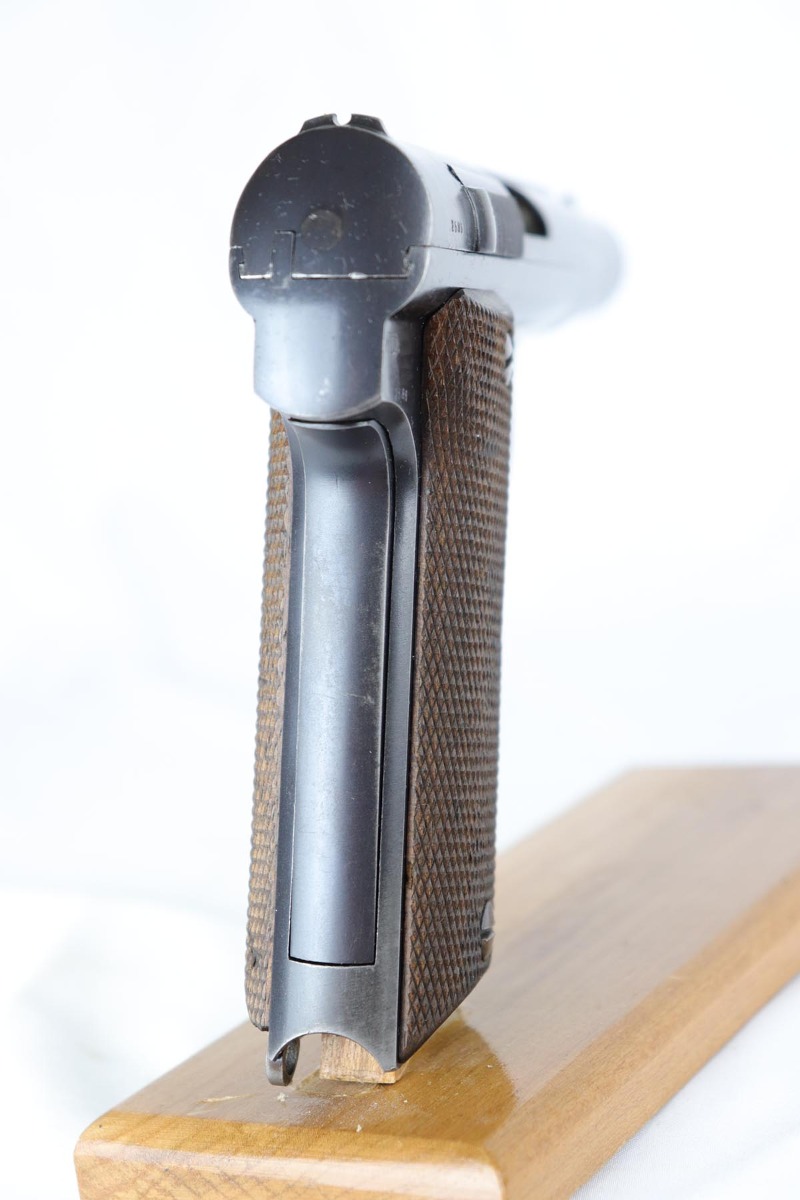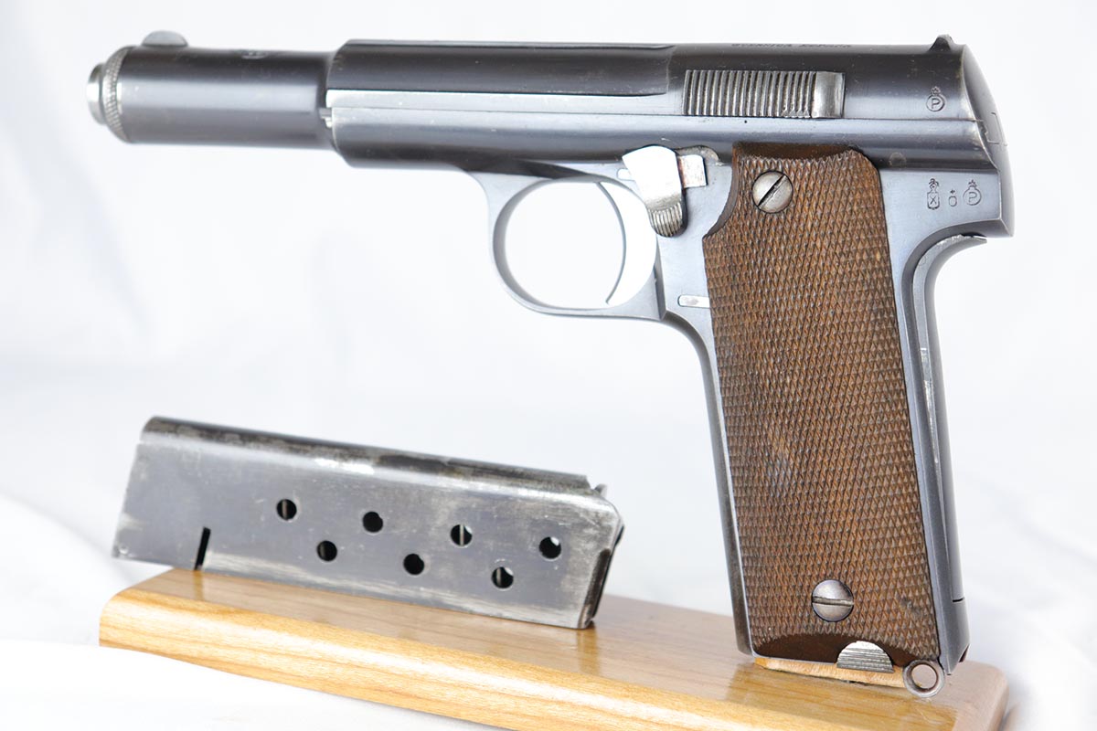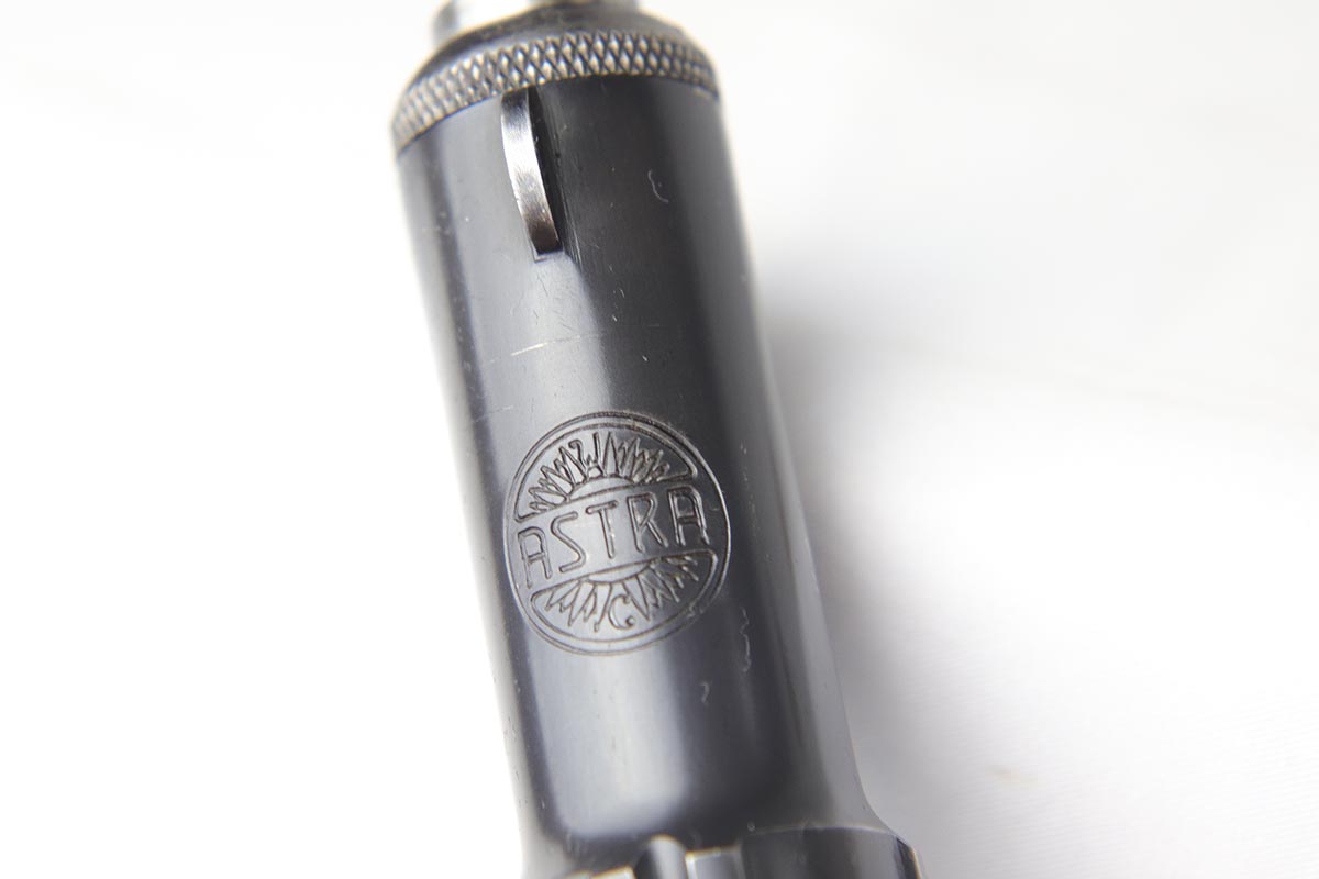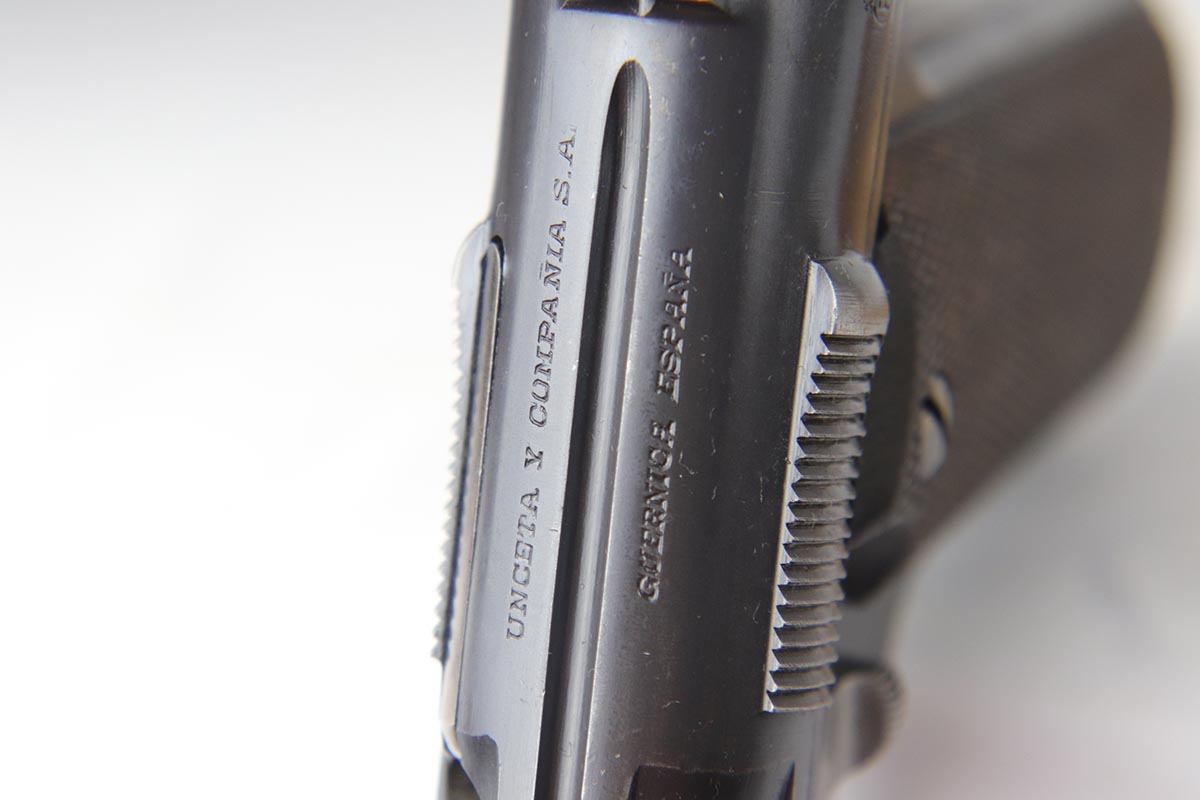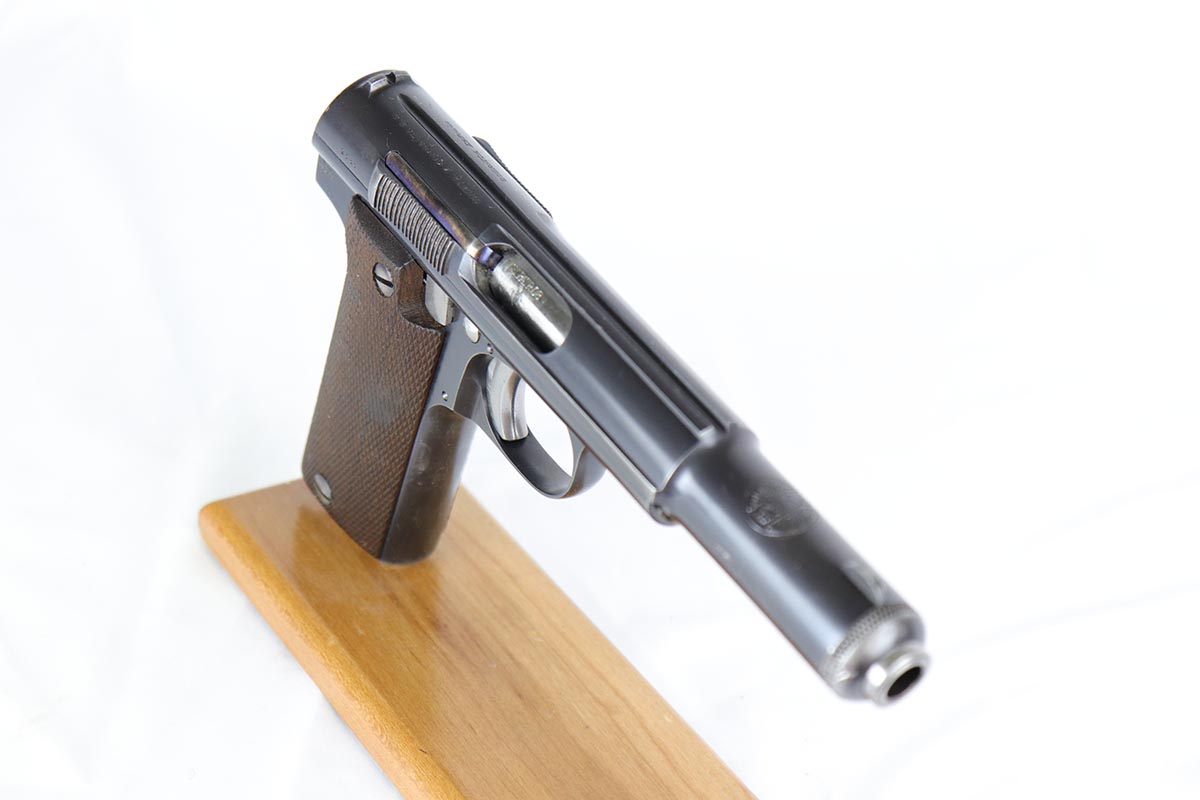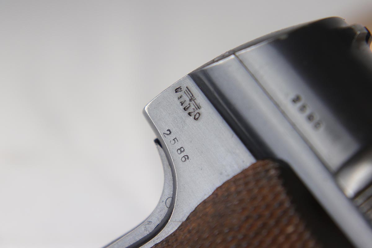 6/25/18 – This is a very nice and honest example of a scarce Astra 600 that is waffen marked and part of the first Nazi contract for these pistols. This pistol was delivered on May 16 of 1944 in the first batch of Nazi ordered Astra 600s, and it retains about 95% of the original blue with some thinning on straps and high edges. These pistols were delivered to German Army via the Spanish-French border before it was closed by the Allies. Only about 10,000 waffen marked Astra 600s were delivered before this point. Excellent grips, mint bore and correct magazine.