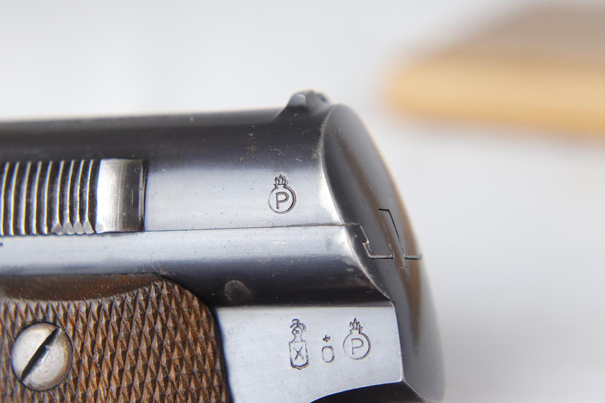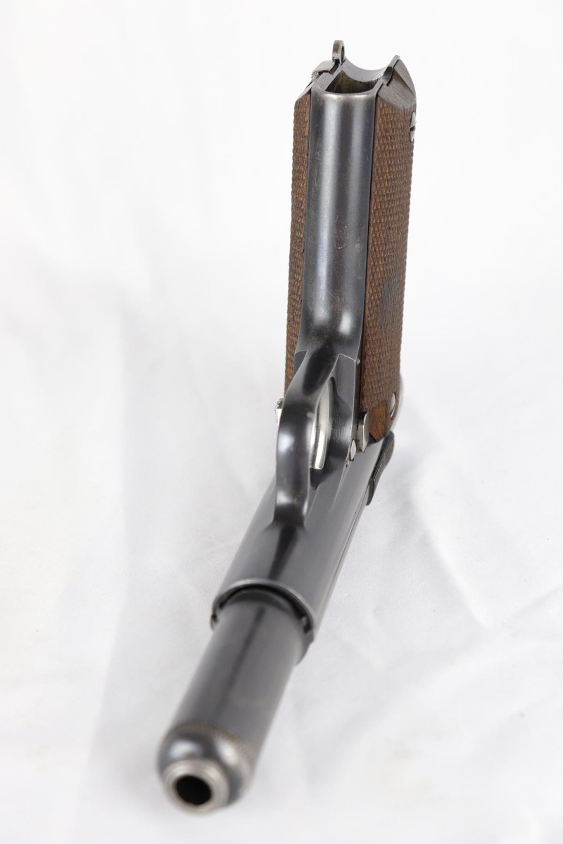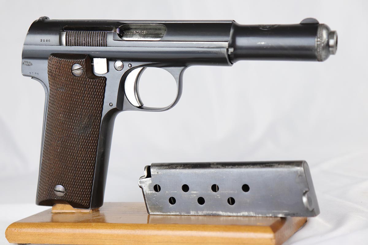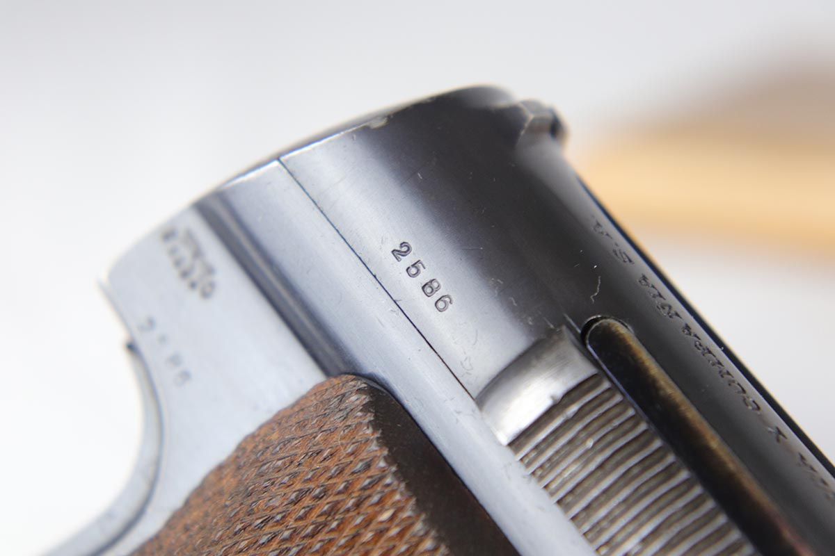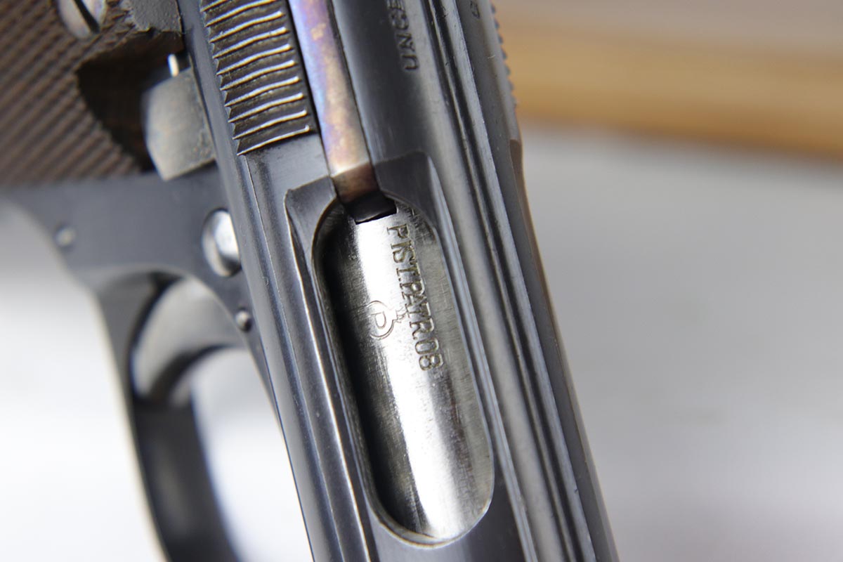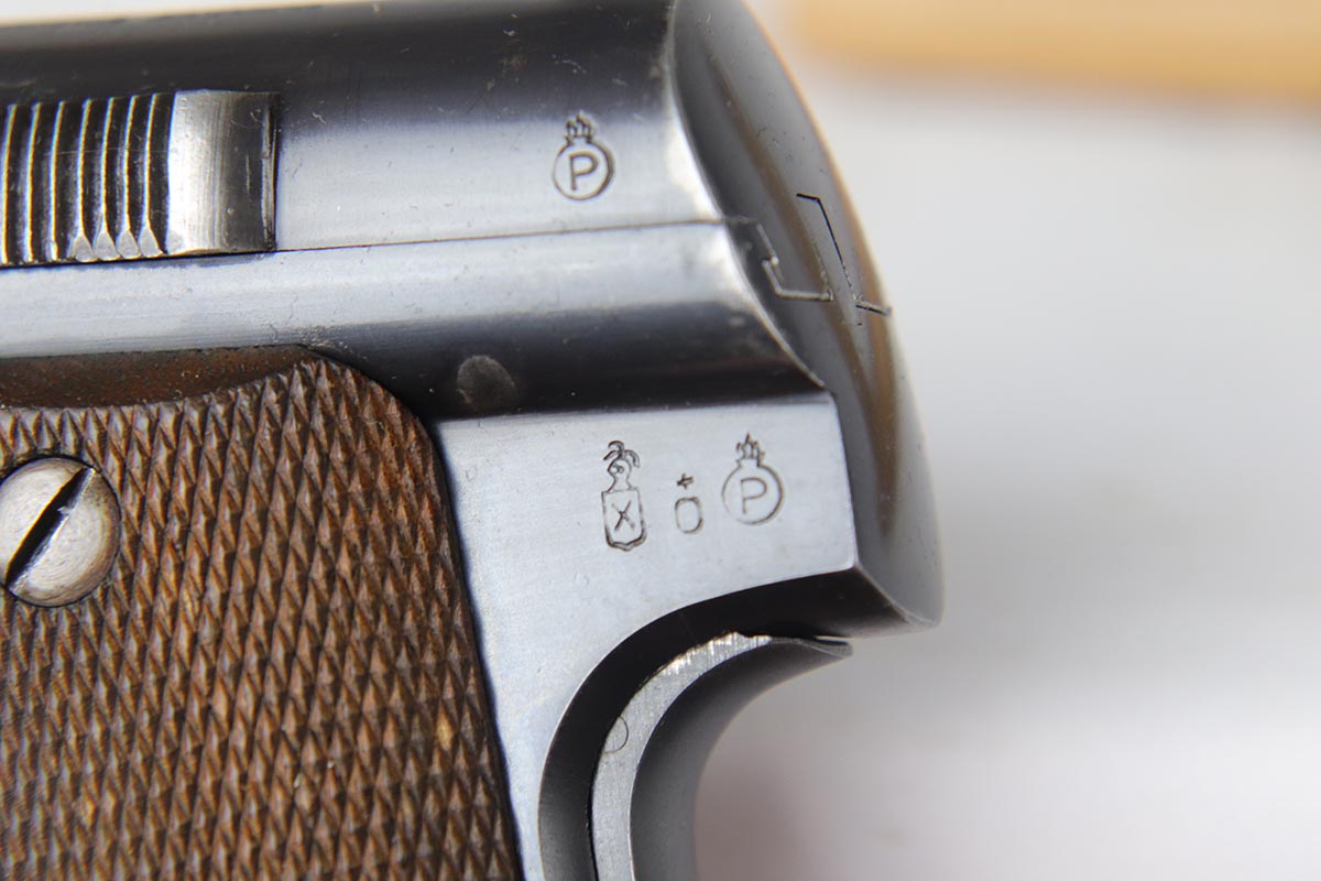 6/25/18 – This is a very nice and honest example of a scarce Astra 600 that is waffen marked and part of the first Nazi contract for these pistols. This pistol was delivered on May 16 of 1944 in the first batch of Nazi ordered Astra 600s, and it retains about 95% of the original blue with some thinning on straps and high edges. These pistols were delivered to German Army via the Spanish-French border before it was closed by the Allies. Only about 10,000 waffen marked Astra 600s were delivered before this point. Excellent grips, mint bore and correct magazine.