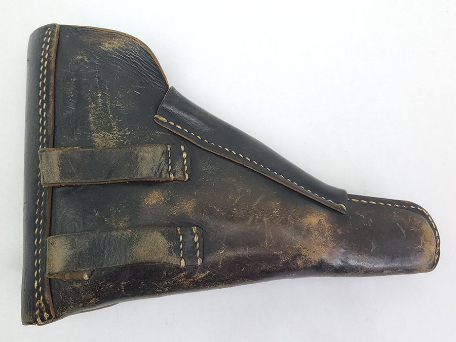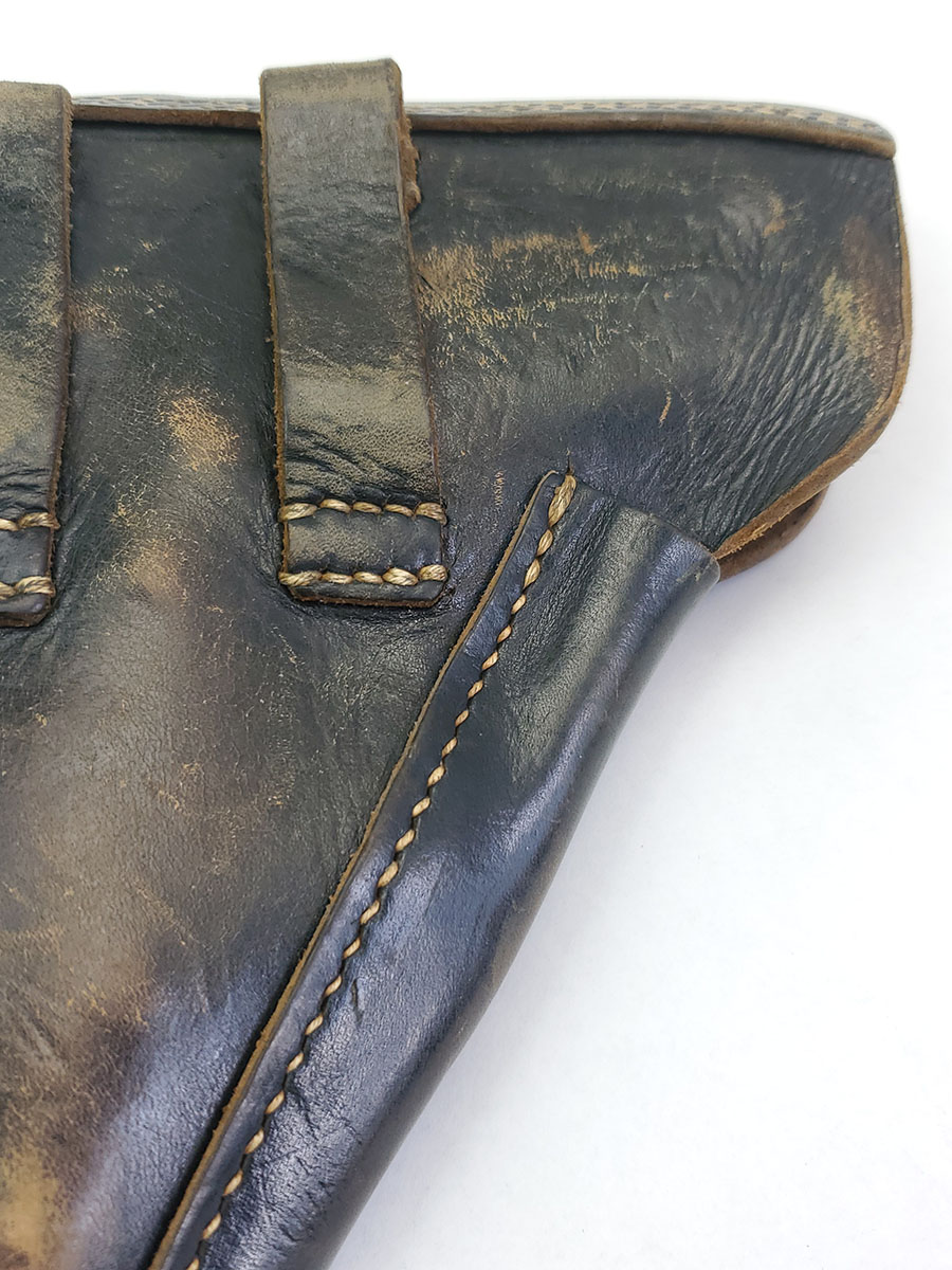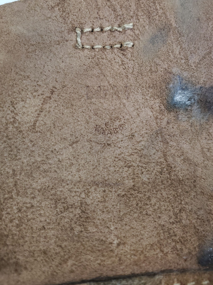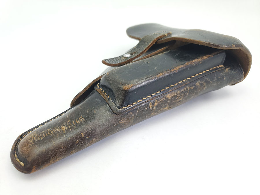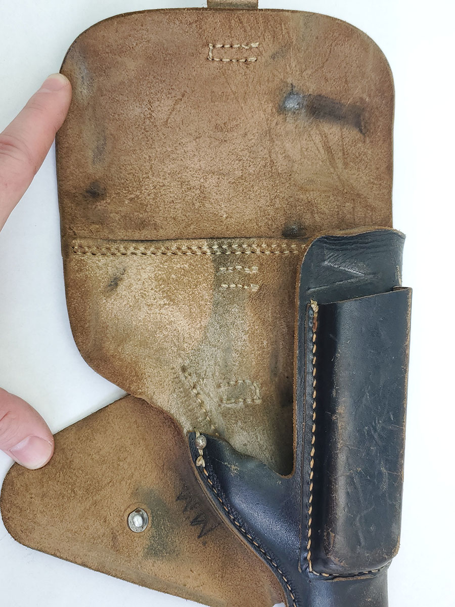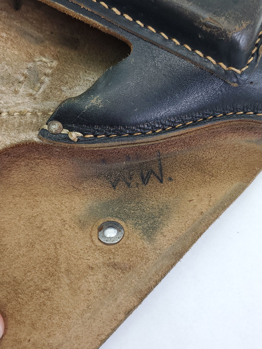 6/26/20 – This is an original late WW2 production Astra 600 holster. The holster is stamped on the interior leather “bdr 44” with a waffen military eagle proof stamp underneath. The stamps are crisp and visible, just hard to photo. The leather is in great shape overall with some signs of use on the interior leather, and exterior scuffing. Would clean up nicely if desired. The stitching is all original and in tact with no major issues.