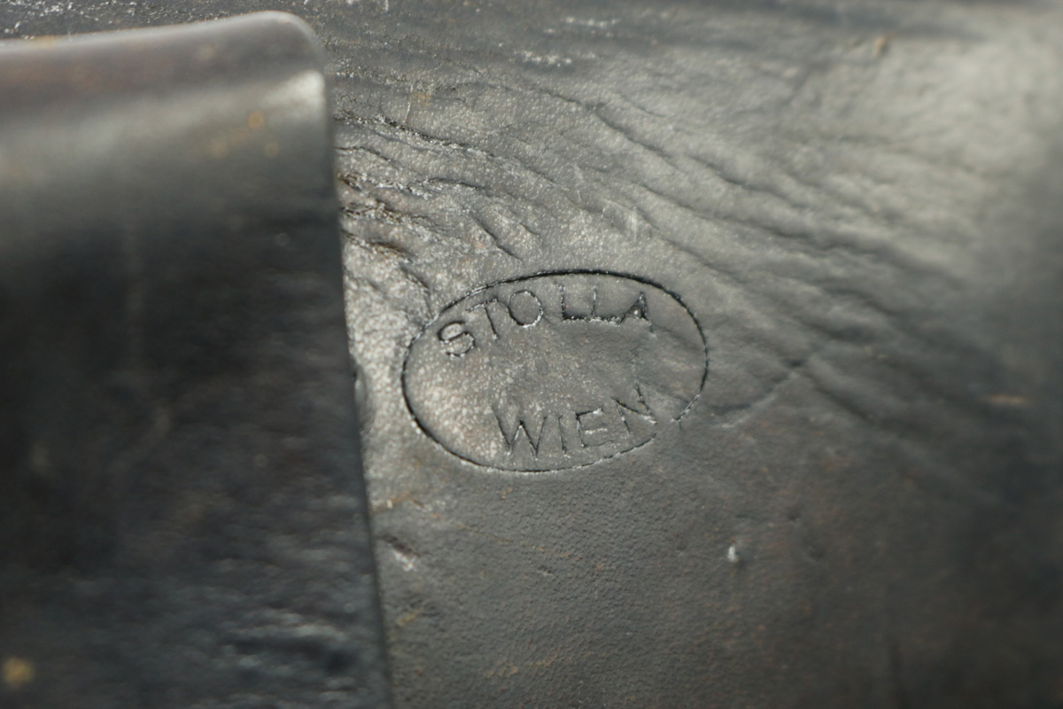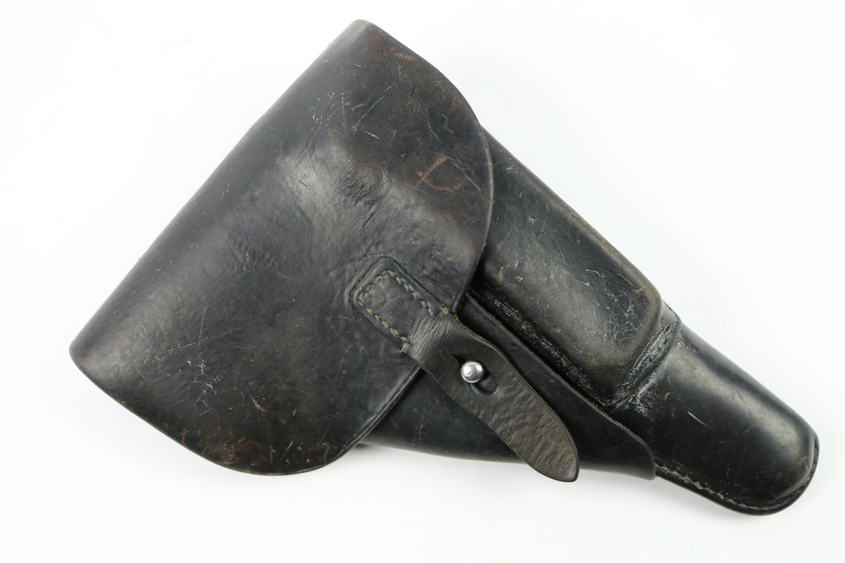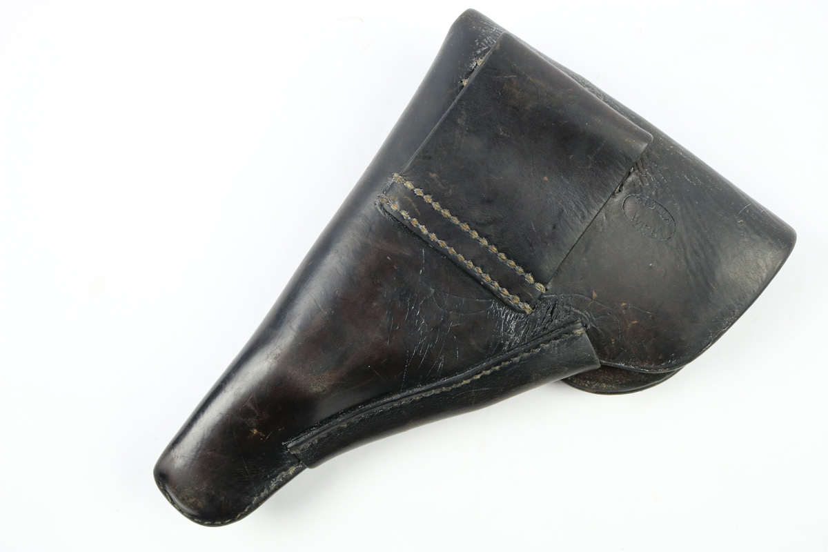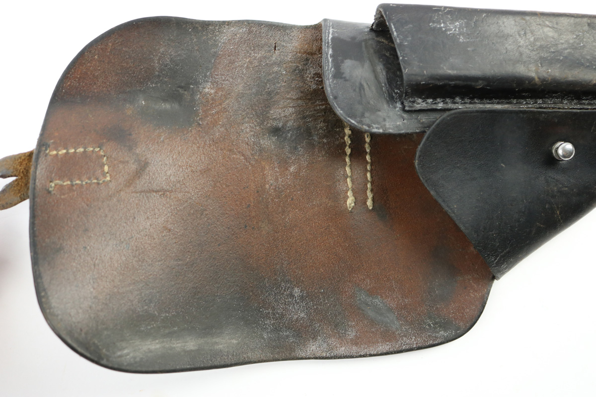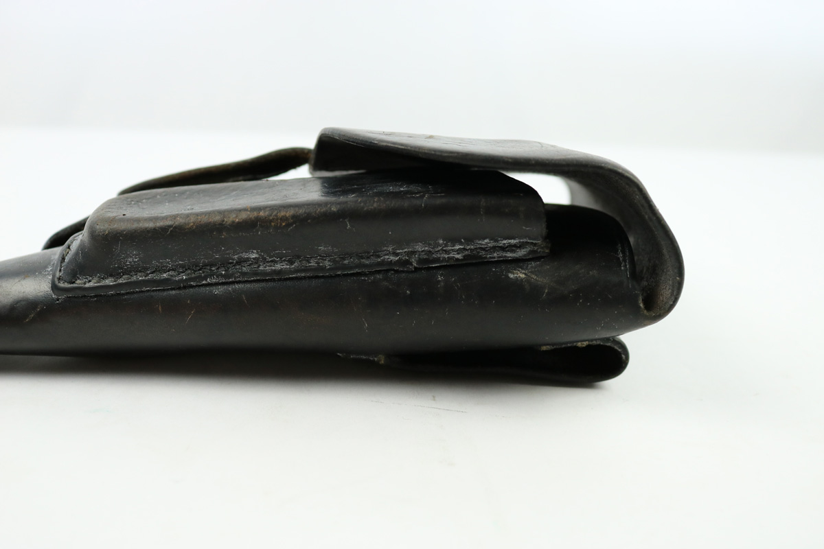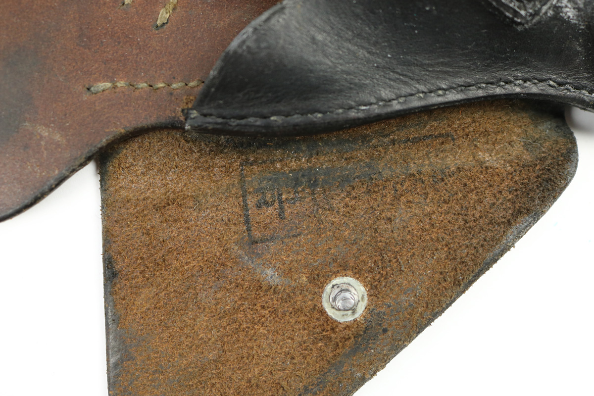 10/1/18 – This is an original WW2 era production Astra model 600 holster. The holster is stamped on the back “Stolla – Wein”. There are no other markings. The black leather is completely in tact – as is the original stitching. The back of the holster shows some surface scratching, none of which goes completely through the leather. There’s also some light areas of white mold growing – but this can be remedied / cleaned. The stitching is all original and in tact. Guaranteed original and authentic.