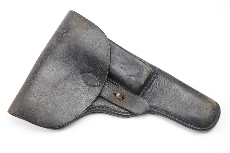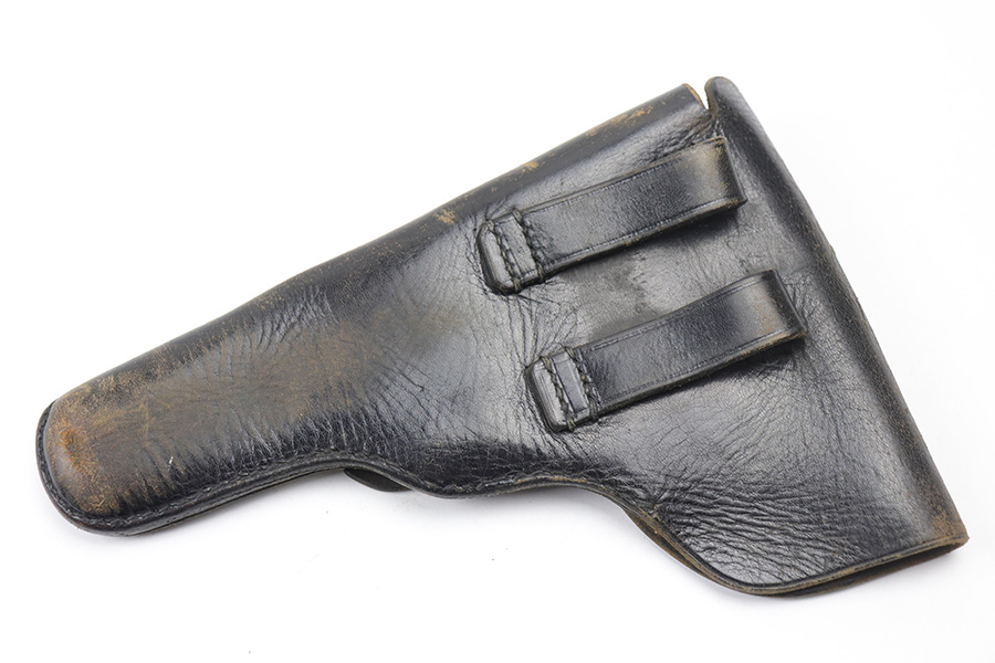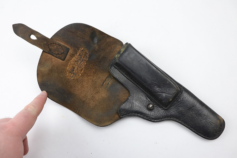 11/2/21 – This is a black leather holster for the Astra 600 pistol. The holster has no markings or stamps, so it’s hard to determine if this is WW2 era or post-war. The leather shows wrinkling and aging wear throughout the exterior. Normal pliability and a fairly clean interior leather, though there are signs of a previous marking or stamp on the interior leather. No stitching issues.