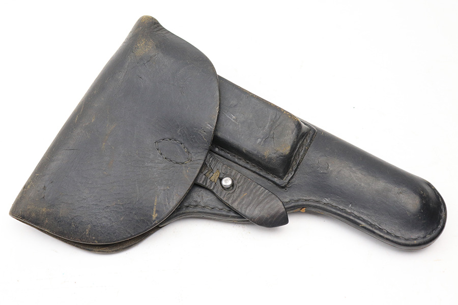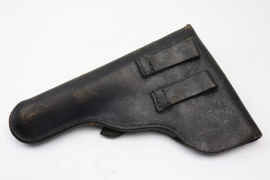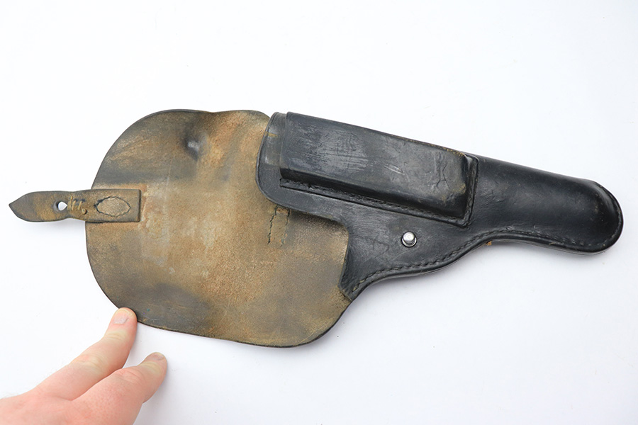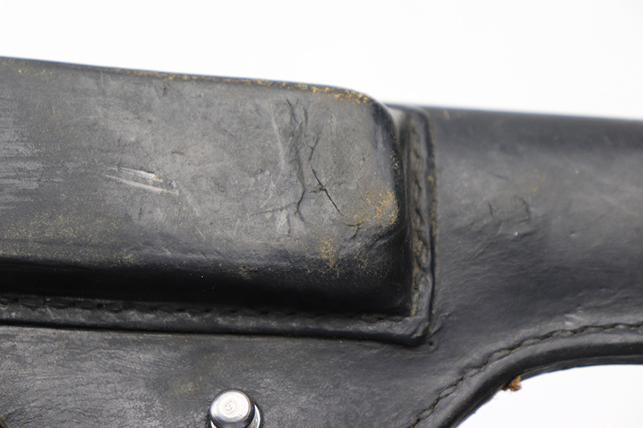 5/13/22 – This is an Astra 600 holster. The leather has some signs of previous use and aging throughout, but no major issues. The closure hole has some added stitching, as shown in photos. No markings or stamps.