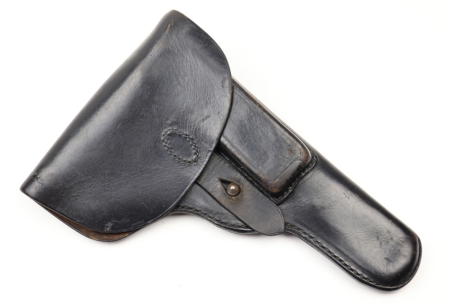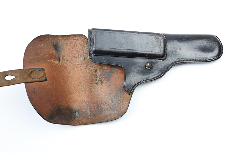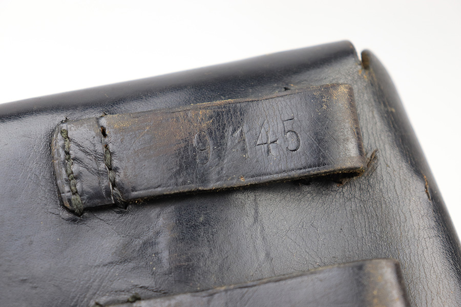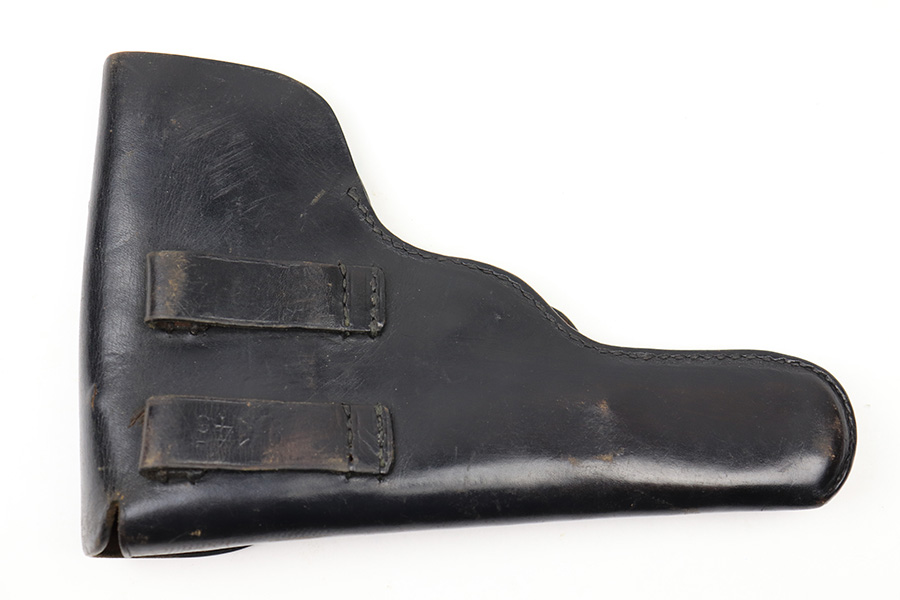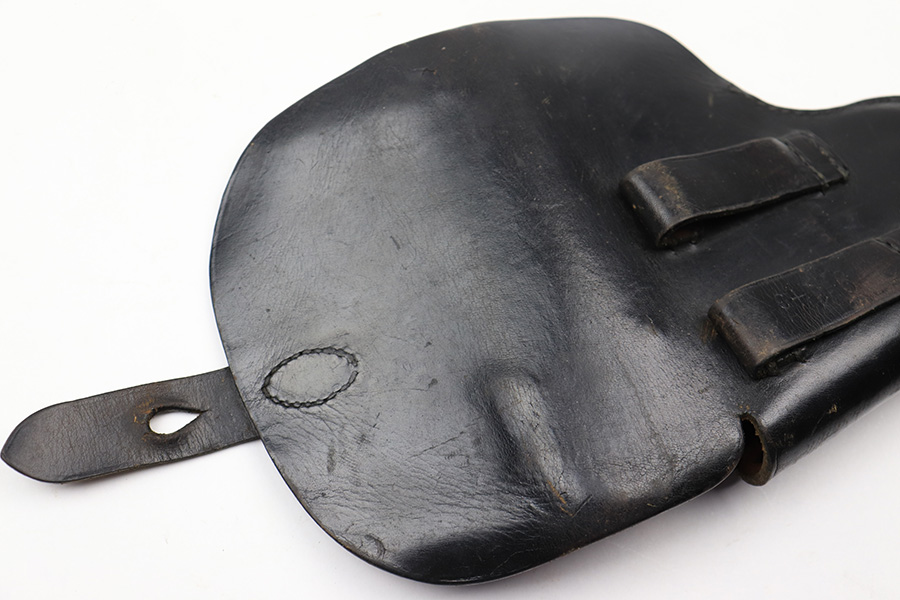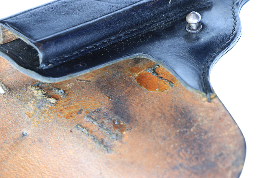 6/22/22 – This is an Astra 600 holster. Likely post-WW2 production made by GECO. Maker stamped on the interior leather. There’s some small amounts of what looks like glue residue on the interior leather, but otherwise the holster is in great shape with no notable issues.