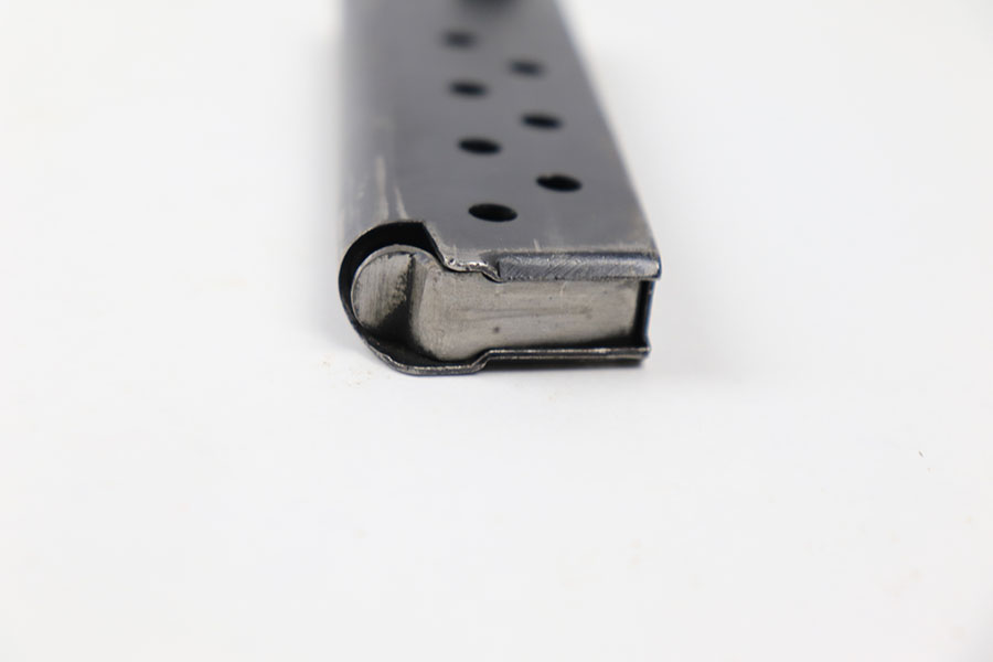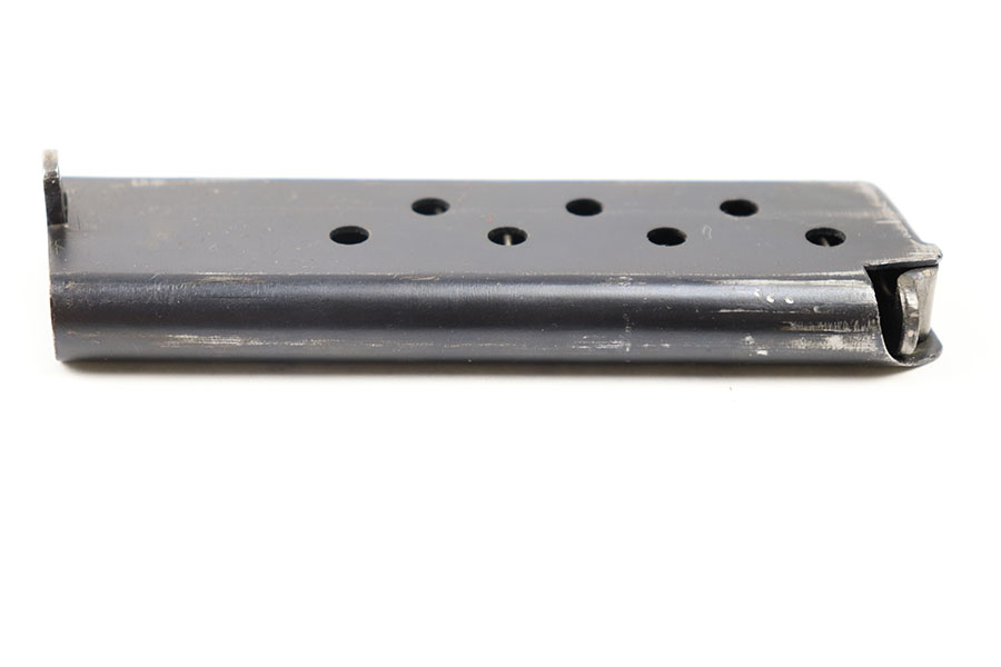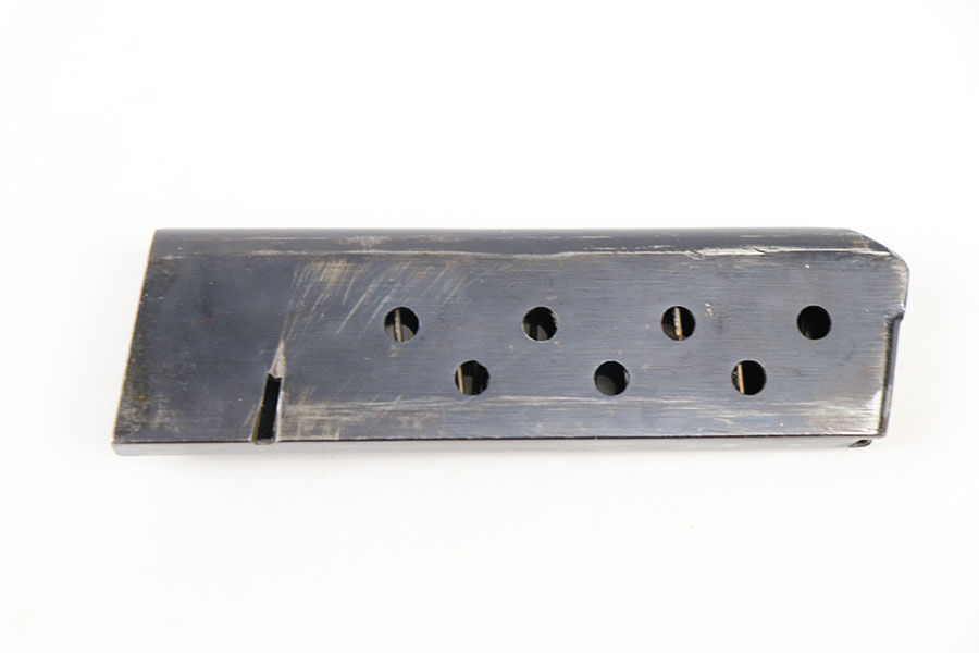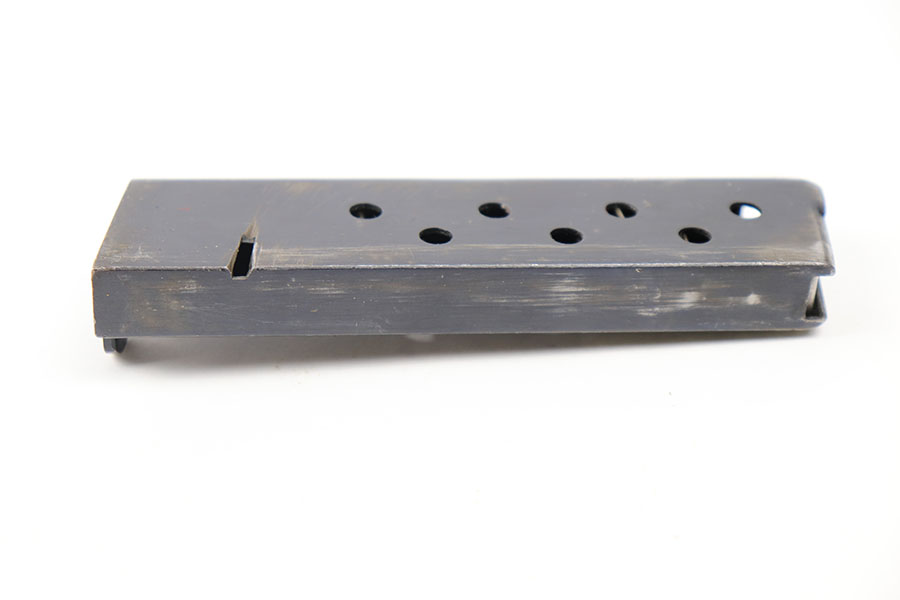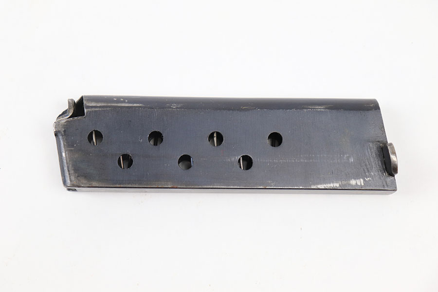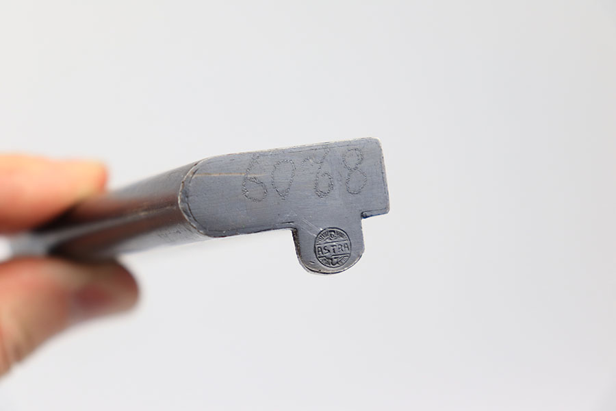 7/15/21 – This is an original Astra model 600 magazine in good overall condition. The magazine has some mild surface loss and a few surface scratches. The base of the magazine has a lightly etched serial number 6068 and an Astra logo. The spring is strong and fully functional.