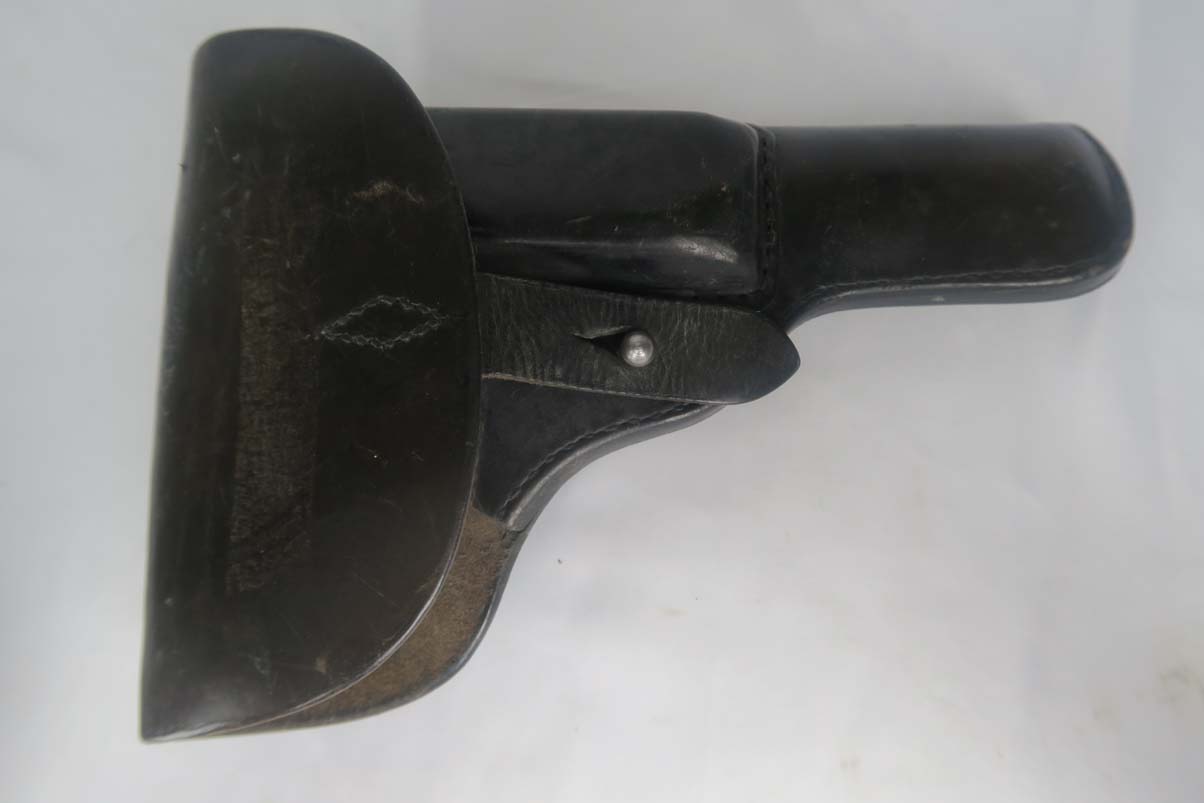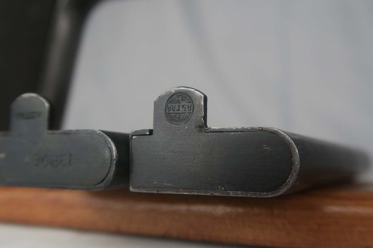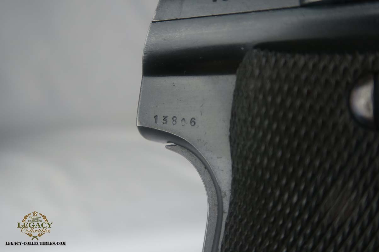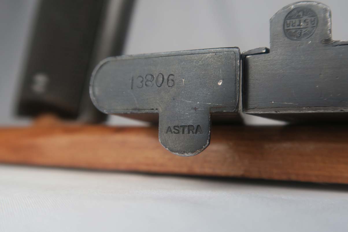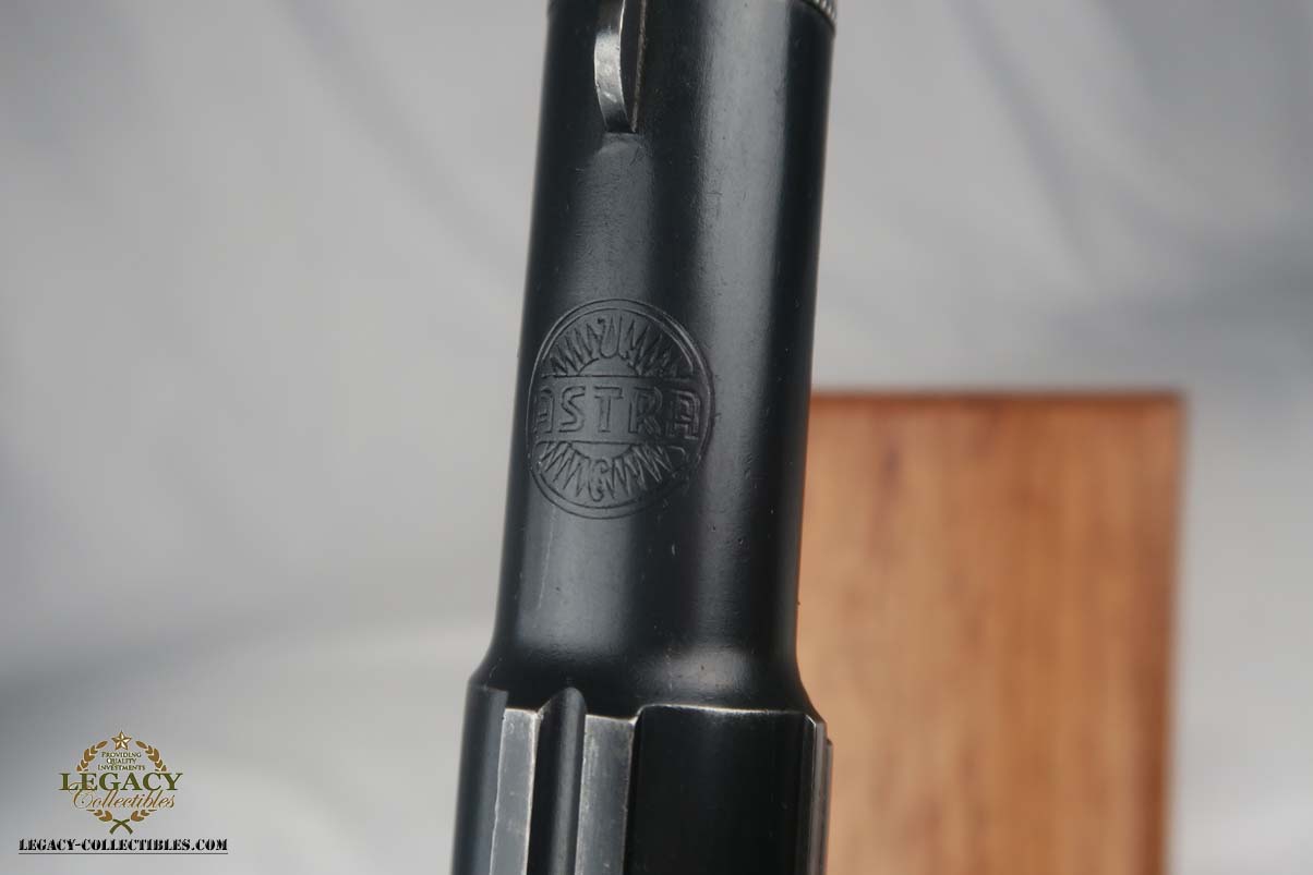 5/24/17 – This is Astra 600 rig, with two magazines (one matching) and correct holster.  These were developed starting in 1943 at the request of the German Army, which wanted a smaller version of the Astra 400.  The first 50 were delivered as sales samples, then a little over 10,000 were delivered across the Spanish-French border to German Army, and were waffen stamped.  This pistol falls into the range just beyond those, as 28,000 Astra 600’s went undelivered due to the Allied landings in France and subsequent battles sealing the border.  This undelivered range is known as the “second contract”, and this pistol falls in that serial block.  The original finish rates at abotu 90%, with most of the wear on the front strap.  One magazine is numbered to the pistol on the bottom, in a style similar to a police numbering.  Spare magazine and holster are in good condition and are correct for this piece.  Excellent bore.