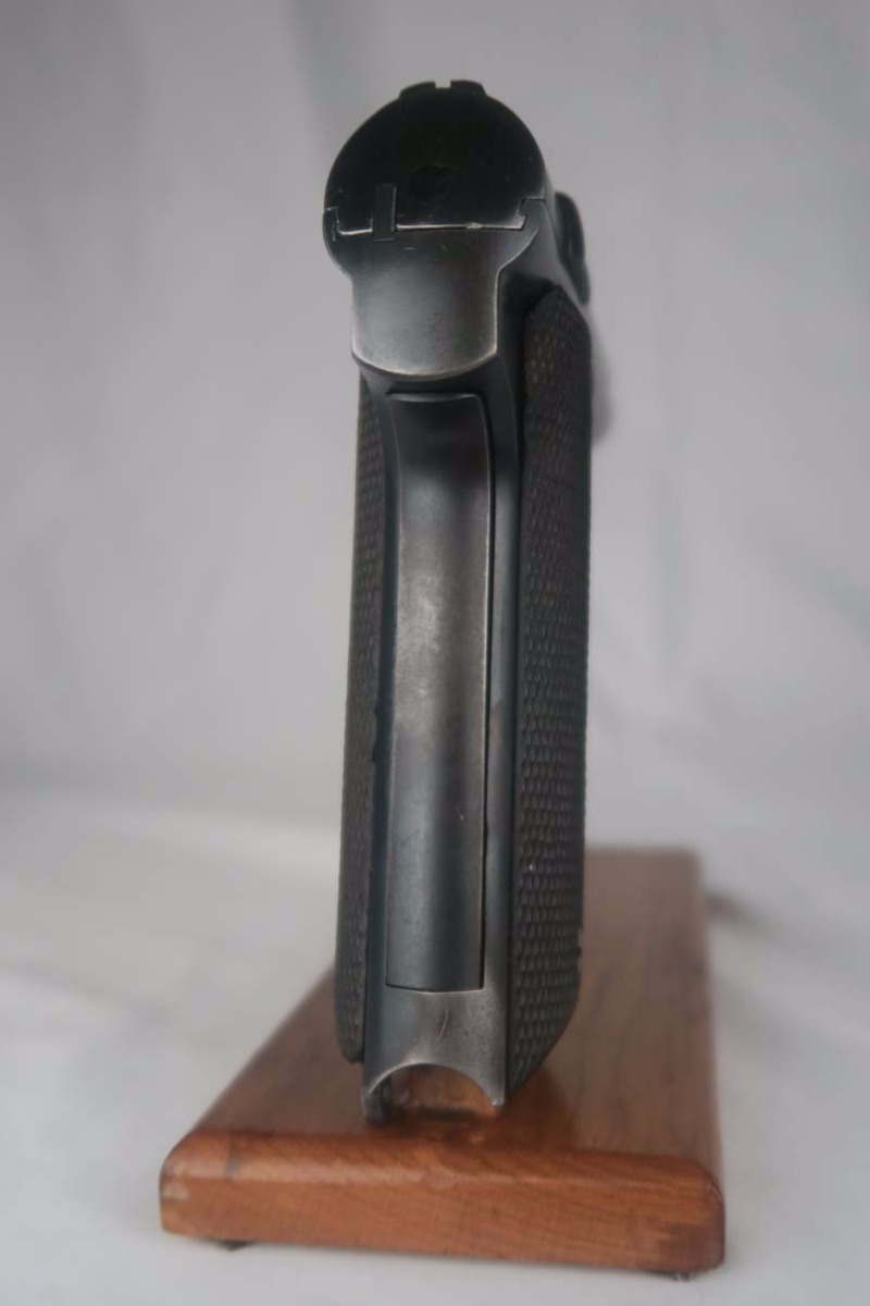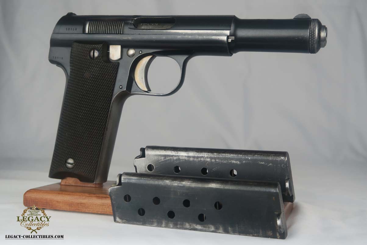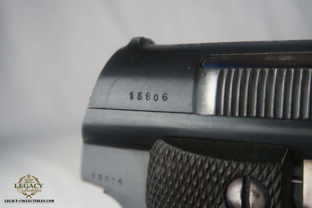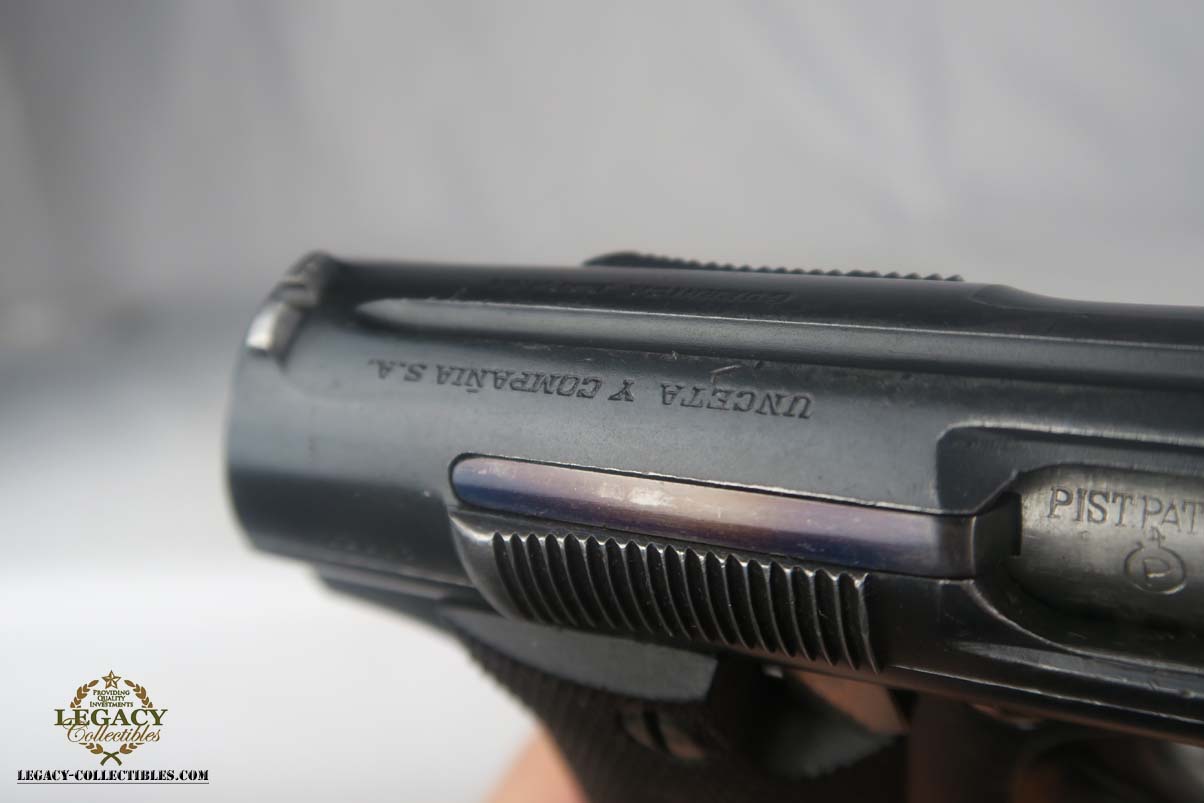 5/24/17 – This is Astra 600 rig, with two magazines (one matching) and correct holster.  These were developed starting in 1943 at the request of the German Army, which wanted a smaller version of the Astra 400.  The first 50 were delivered as sales samples, then a little over 10,000 were delivered across the Spanish-French border to German Army, and were waffen stamped.  This pistol falls into the range just beyond those, as 28,000 Astra 600’s went undelivered due to the Allied landings in France and subsequent battles sealing the border.  This undelivered range is known as the “second contract”, and this pistol falls in that serial block.  The original finish rates at abotu 90%, with most of the wear on the front strap.  One magazine is numbered to the pistol on the bottom, in a style similar to a police numbering.  Spare magazine and holster are in good condition and are correct for this piece.  Excellent bore.
